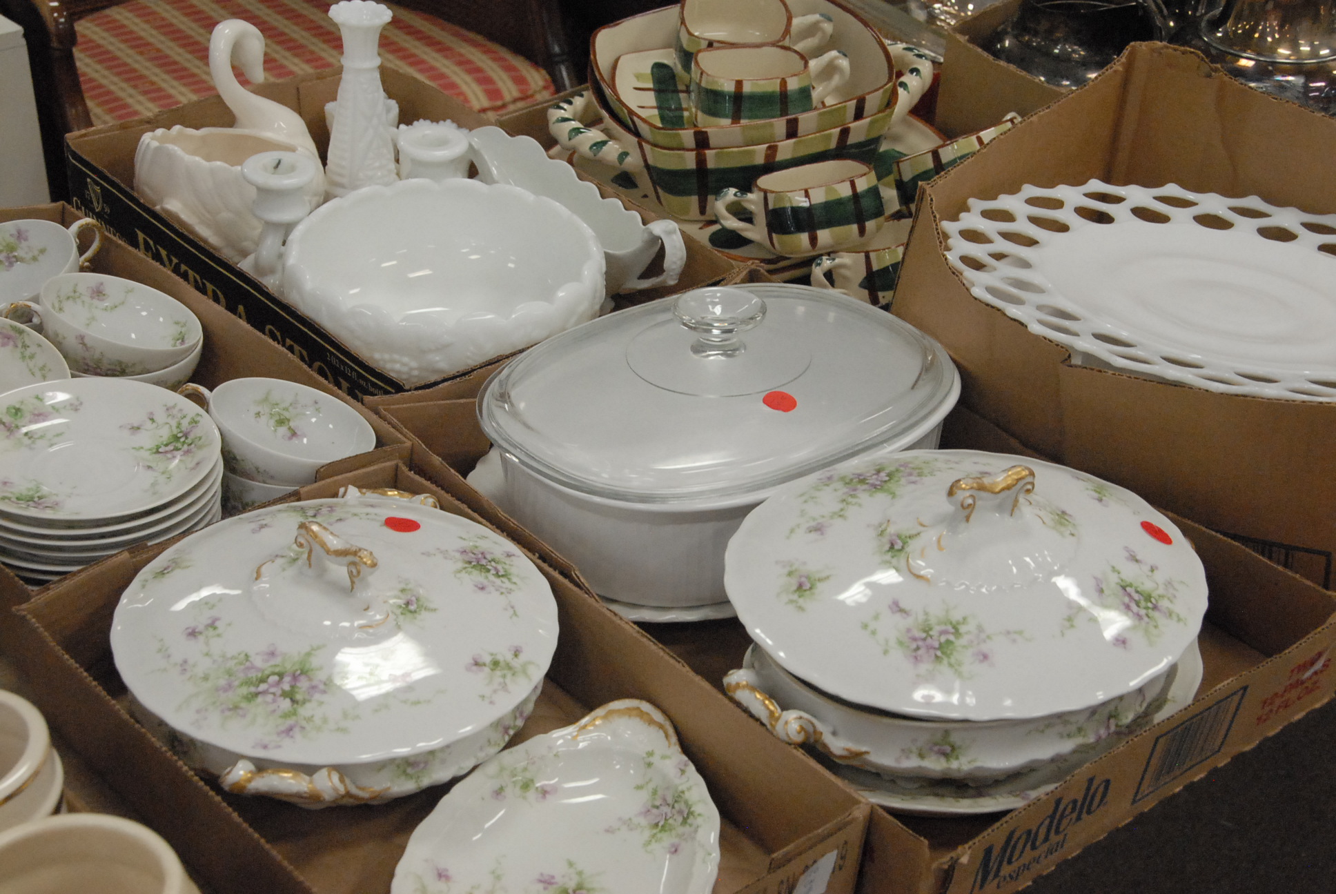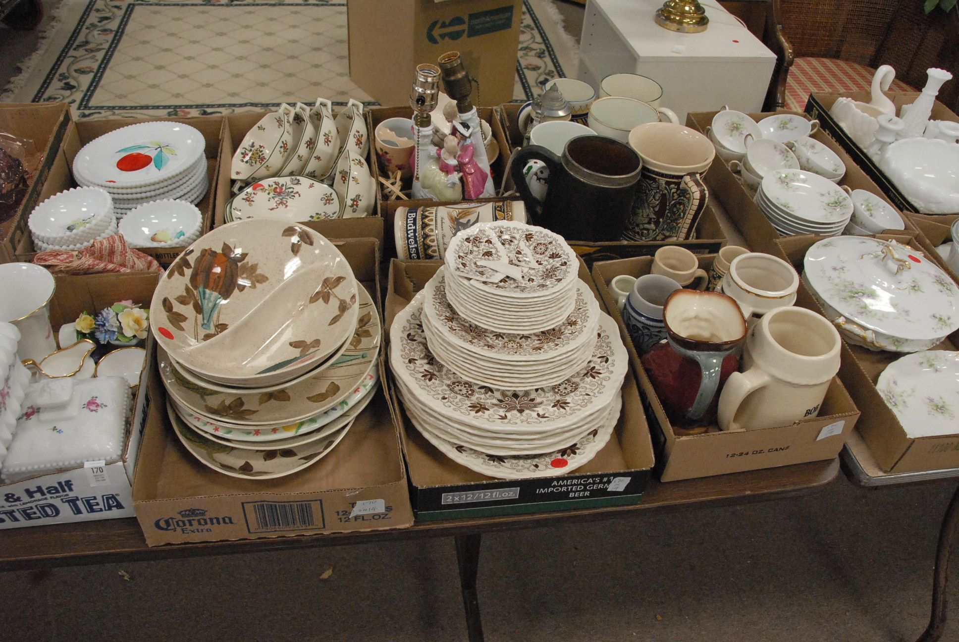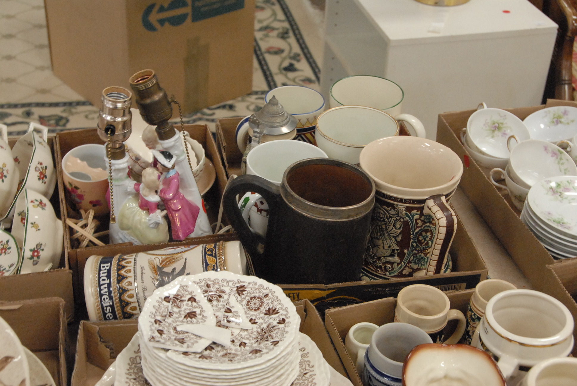 Fourteen box lots of china including mugs, one leather mug mounted with silver, milk glass, Limoges, Royal Dalton mug, candy dishes, plates, cups, saucers, lamps, etc.