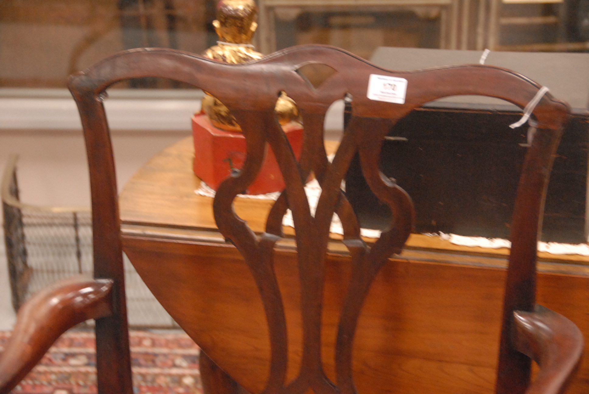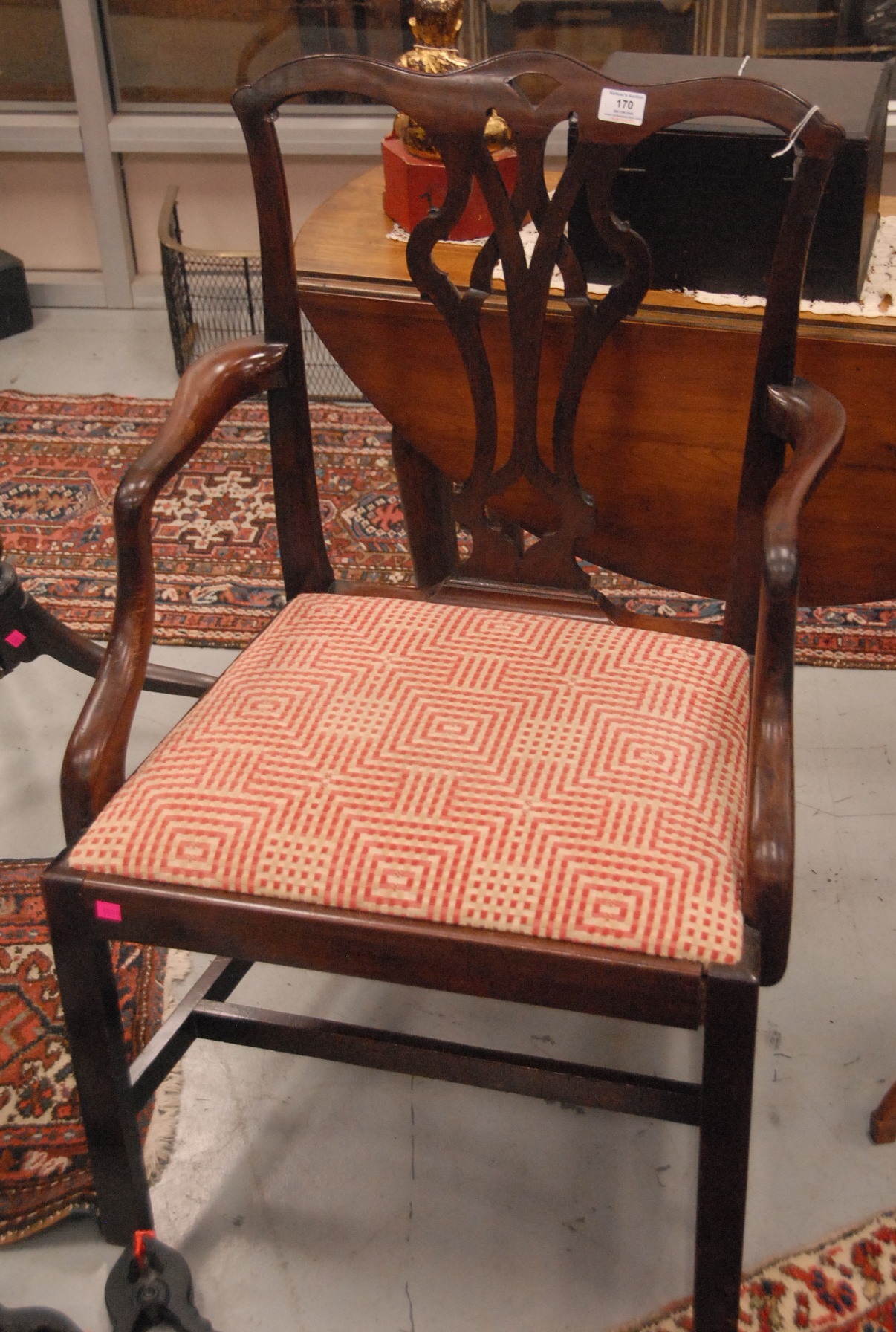Lot 170: George III mahogany armchair with pierce carved splat and upholstered slip seat, all set on squared legs, circa 1780. ht. 37 1/2 in. seat ht. 17 1/2 in.
