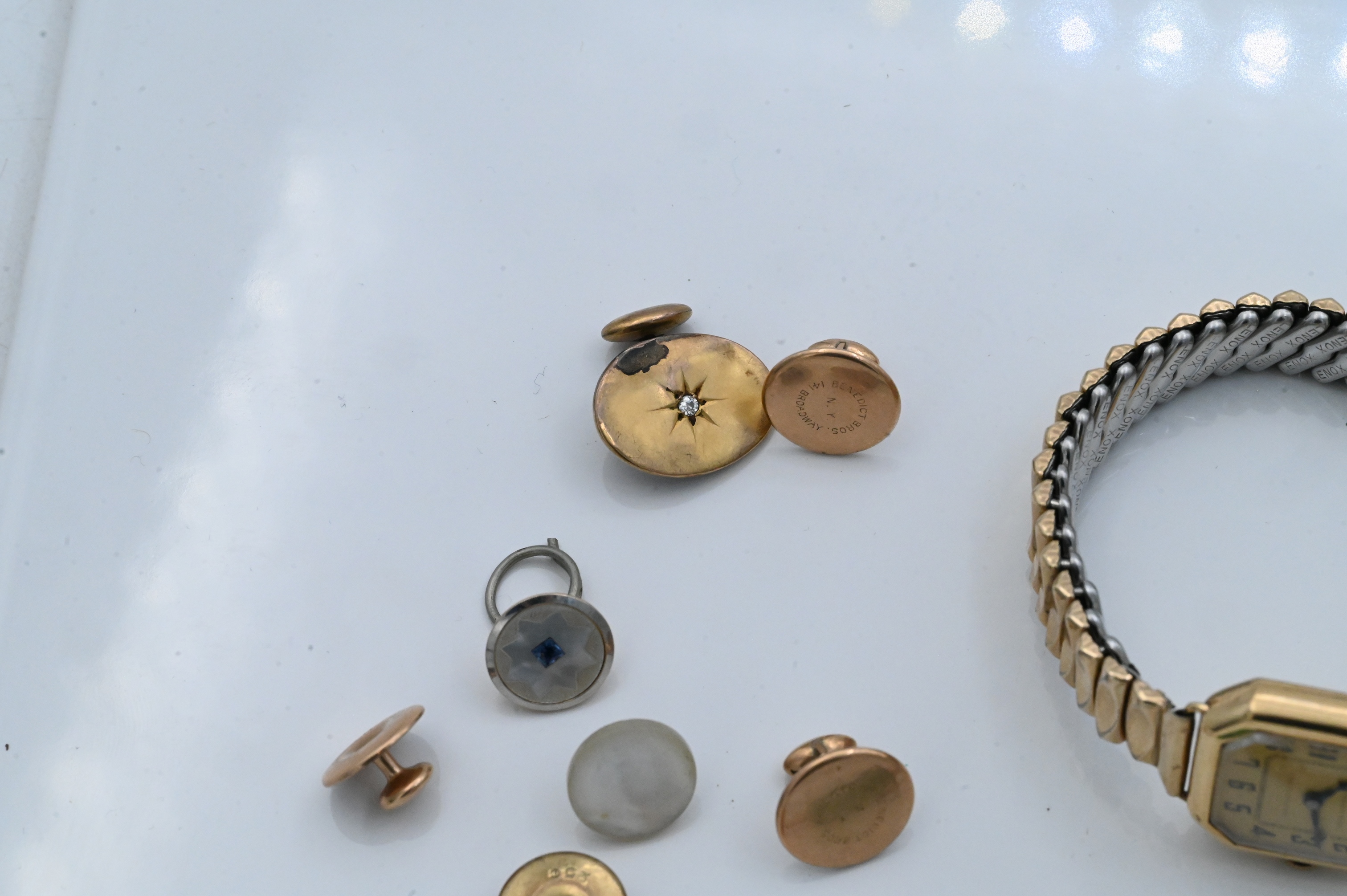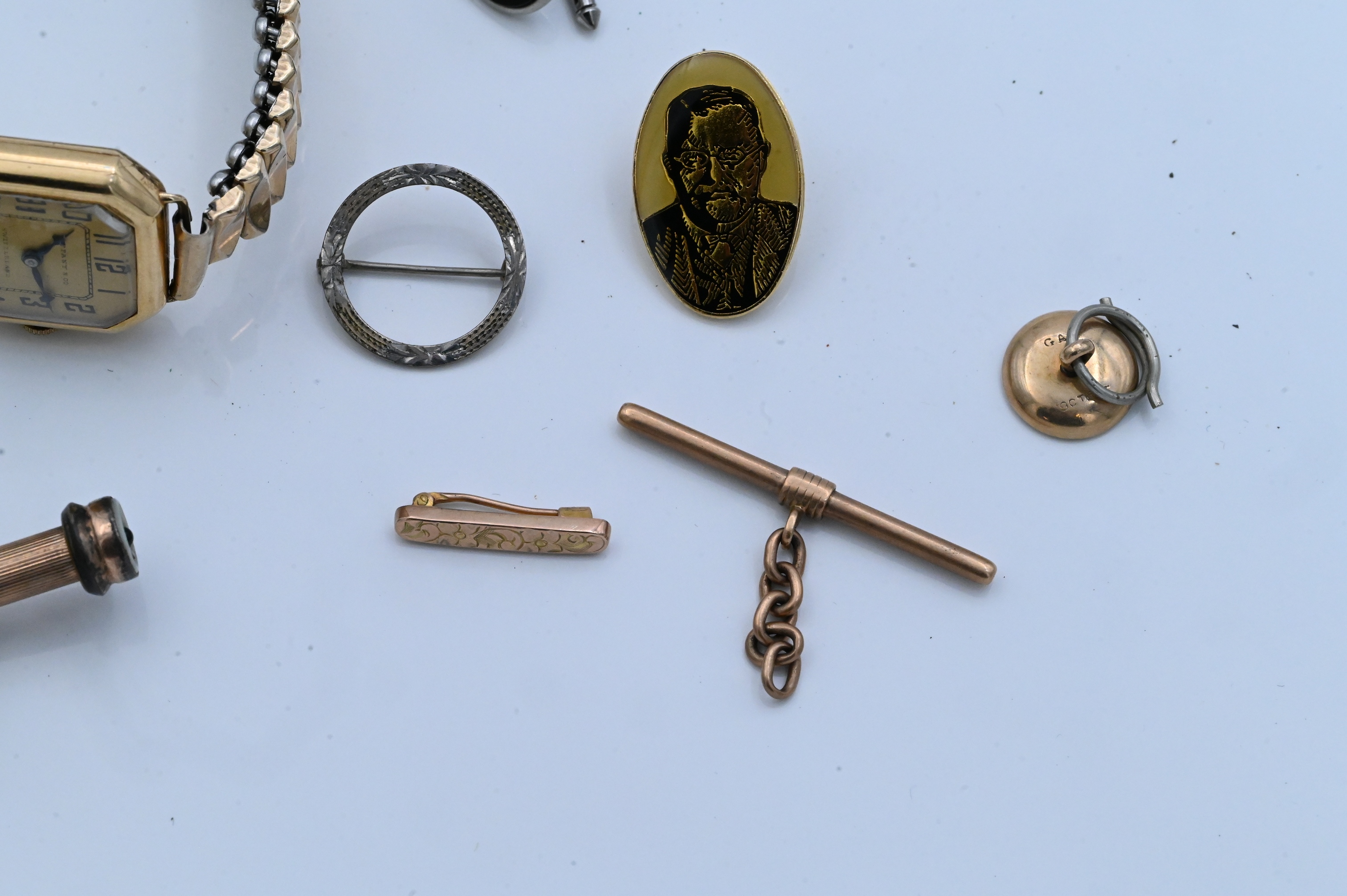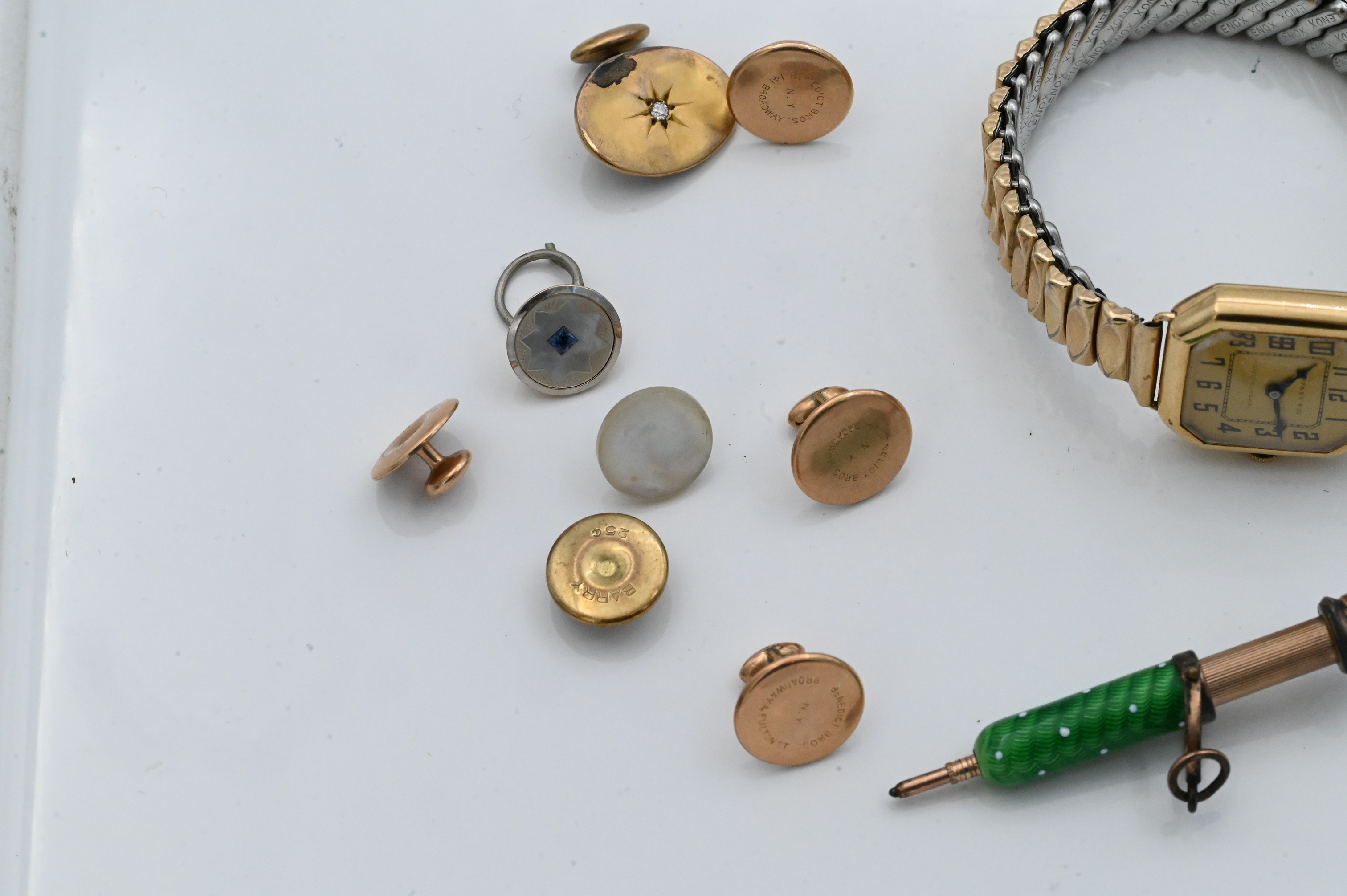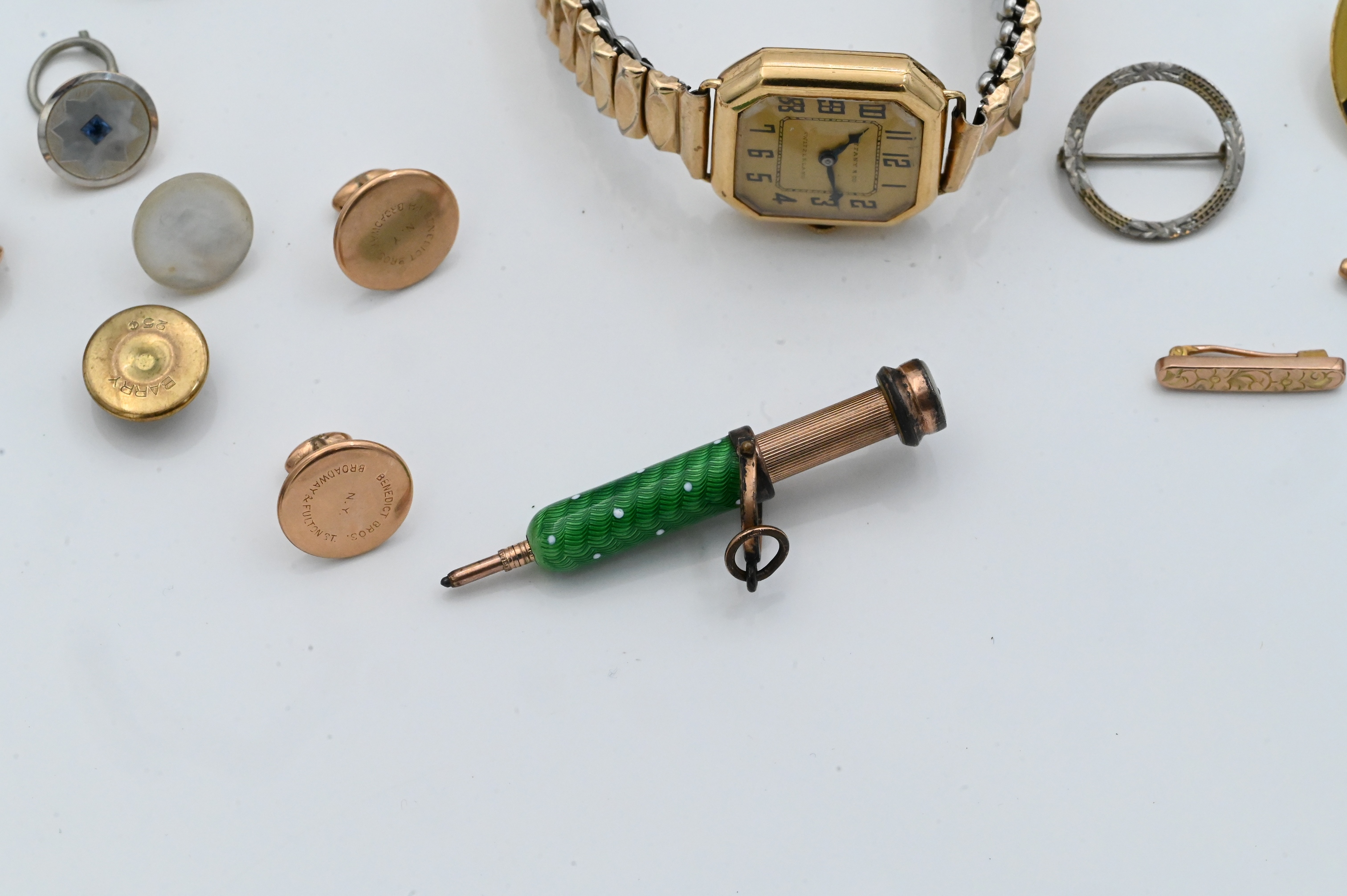 dial signed Tiffany & Co., with aftermarket metal expandable bracelet, together with assorted low karat gold, gold-filled, and metal jewelry items such as buttons, studs, pins, and vinaigrette pieces, total combined weight approximately 17.5 dwt (27.2 grams).