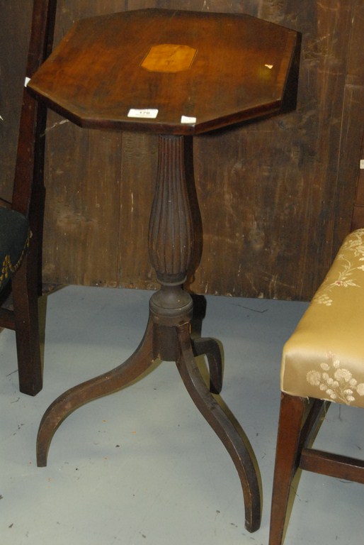 Lot 170: Hepplewhite mahogany candlestand retaining original finish with rectangular canted corner top, set on unusual turned and reeded bulb…