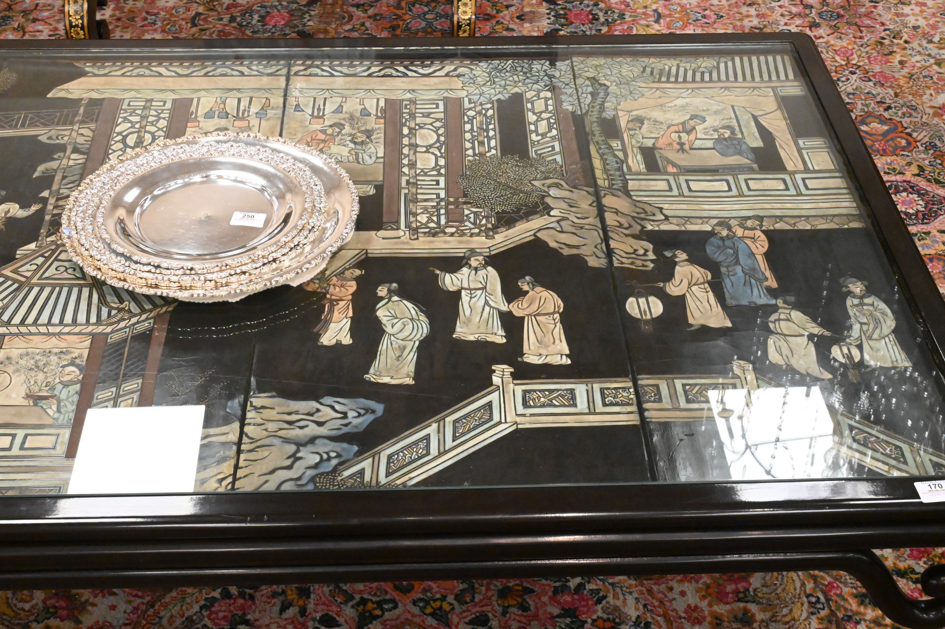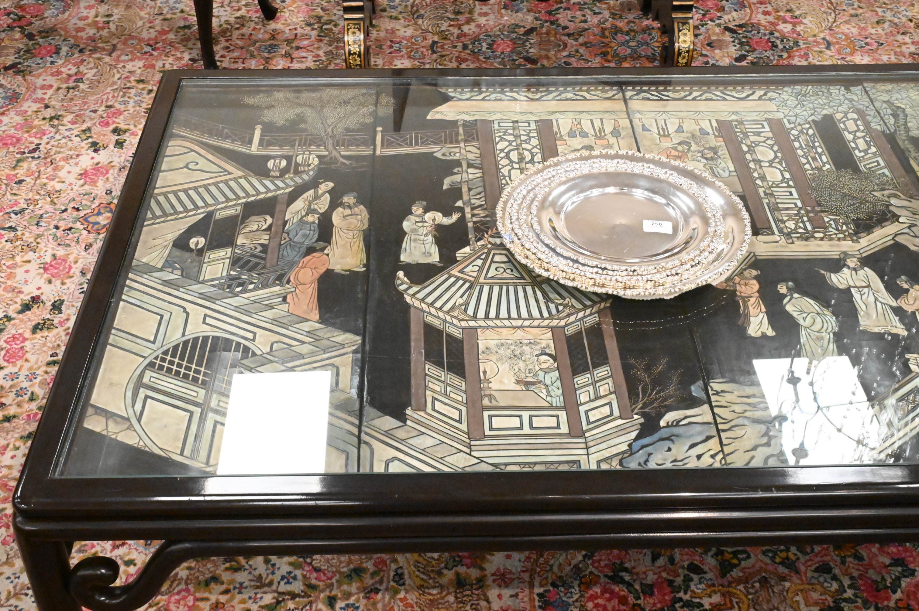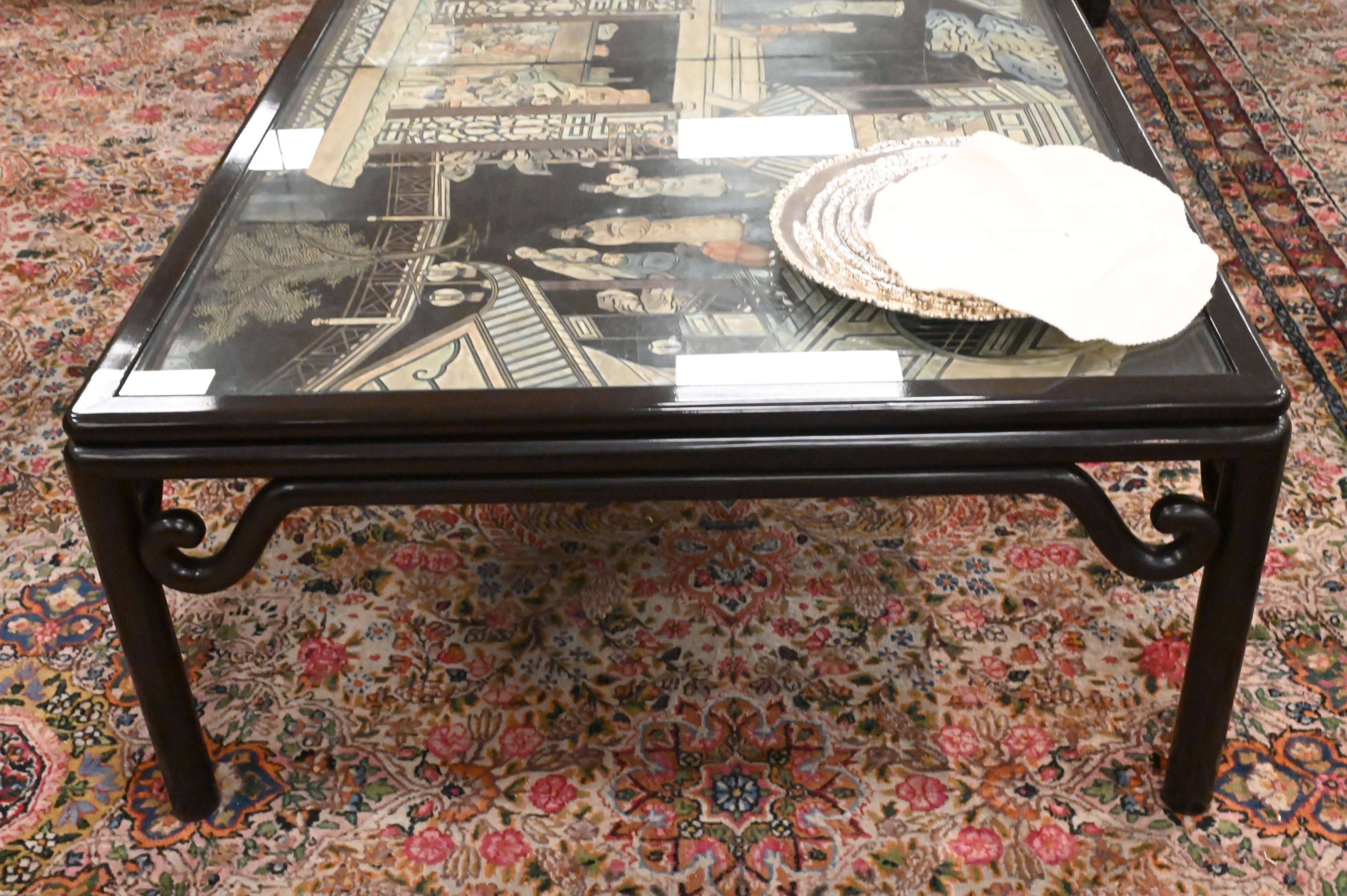 Set in dark brown lacquered base, with inset glass