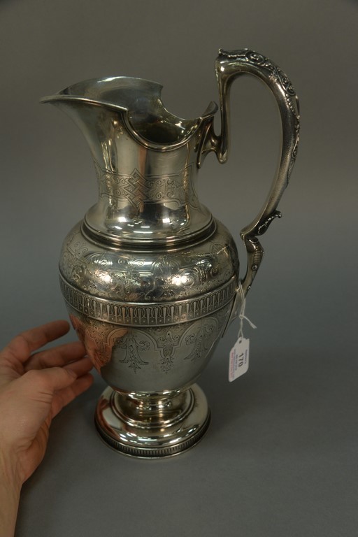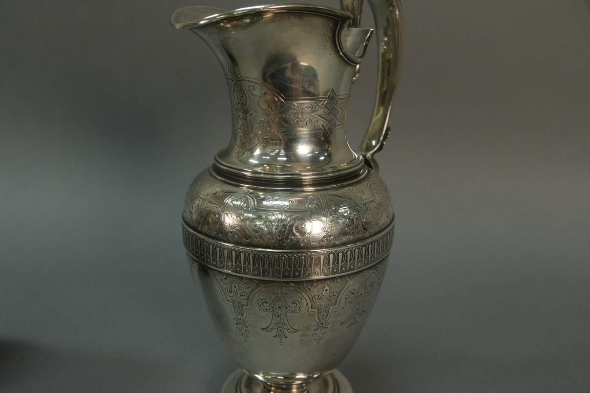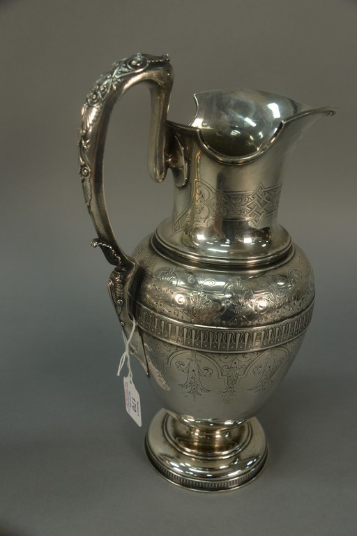 Lot 170: Large Tiffany sterling silver ewer having hand chased and engraved classical design, made by John C. Moore, marked on bottom: Tiffan…