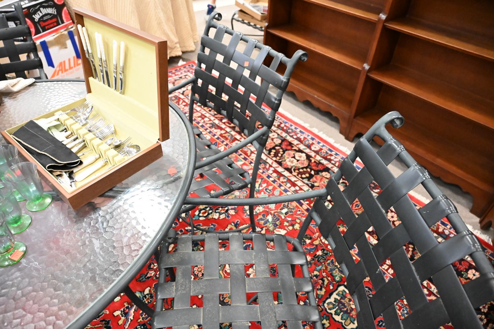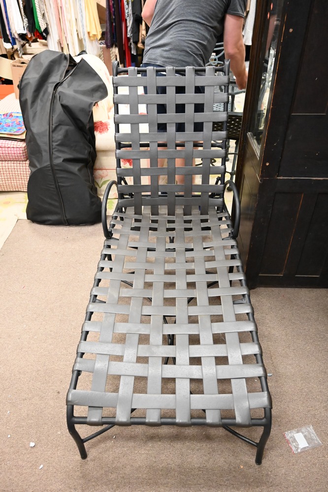 Lot 170: Nine Piece Brown and Jordan Outdoor Patio Set, to include an oval glass top table, six armchairs, chaise lounge, along with glass top side table, table height 28 inches, top 48″ x 68″.