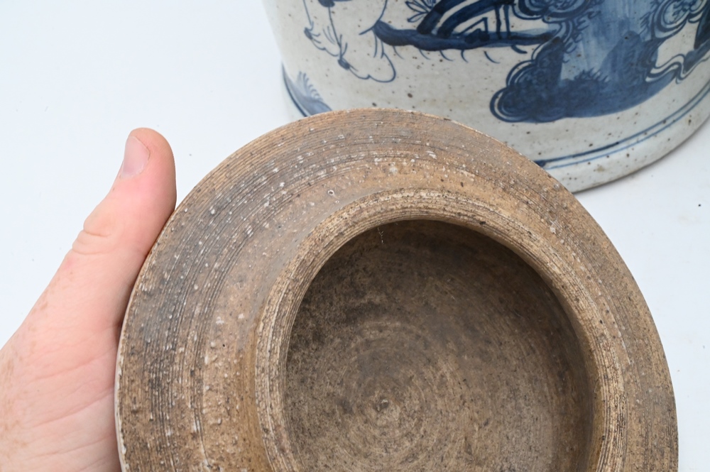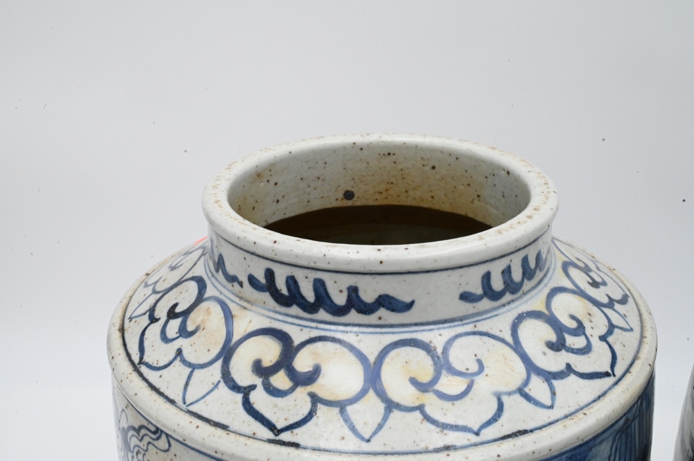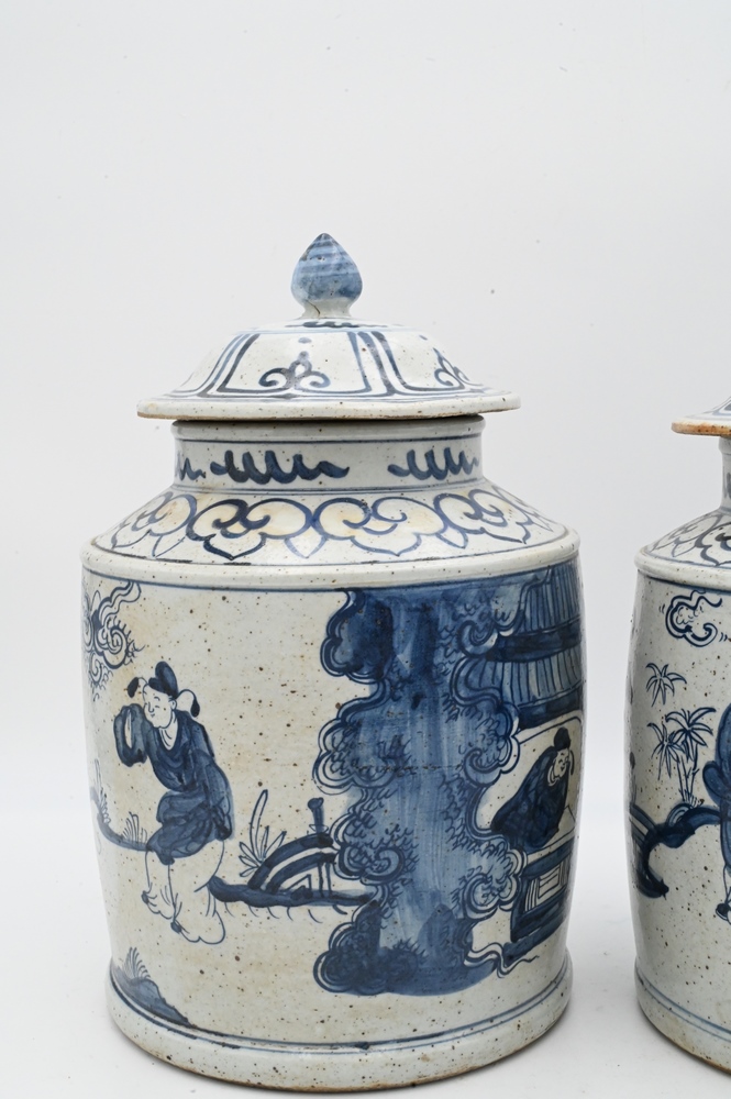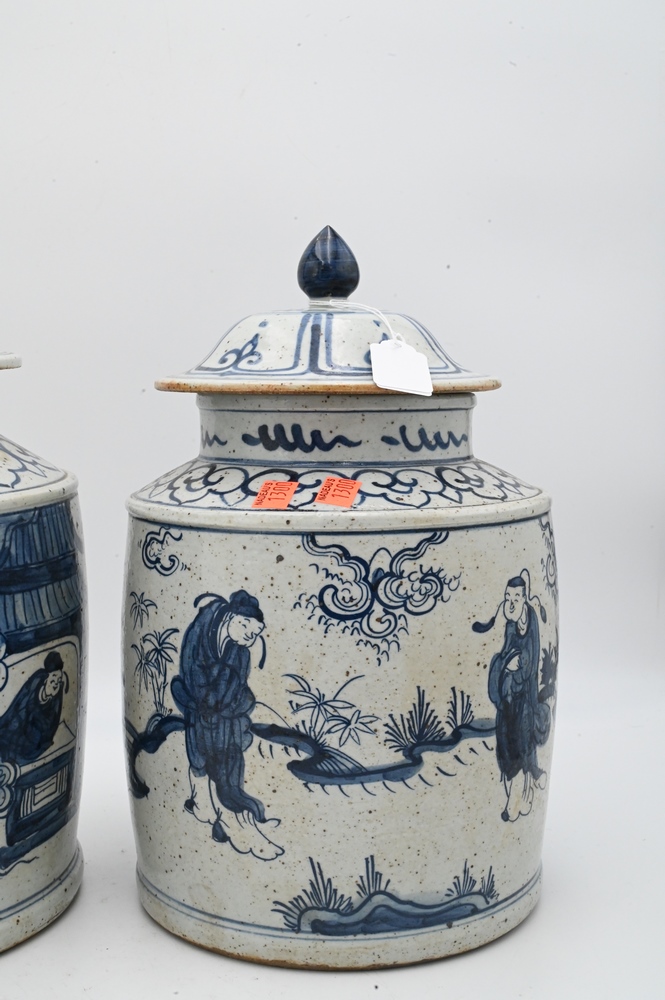 Pair of Chinese Porcelain Covered Jars, painted with figures, height 14 inches.