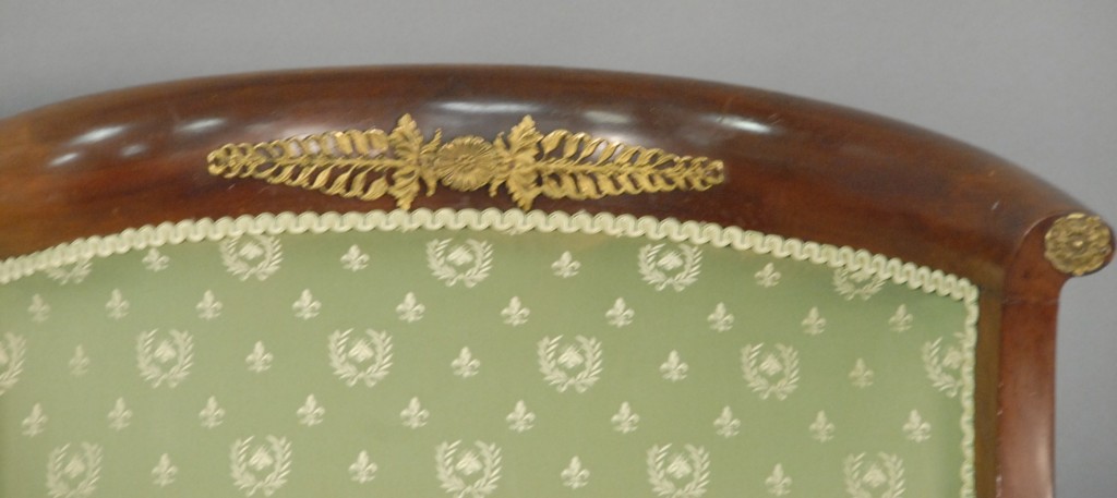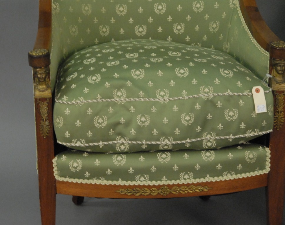 Pair of Napoleonic style mahogany armchairs with bronze mounts, busts, and bronze paw feet in excellent upholstery. height 41in. 27in.