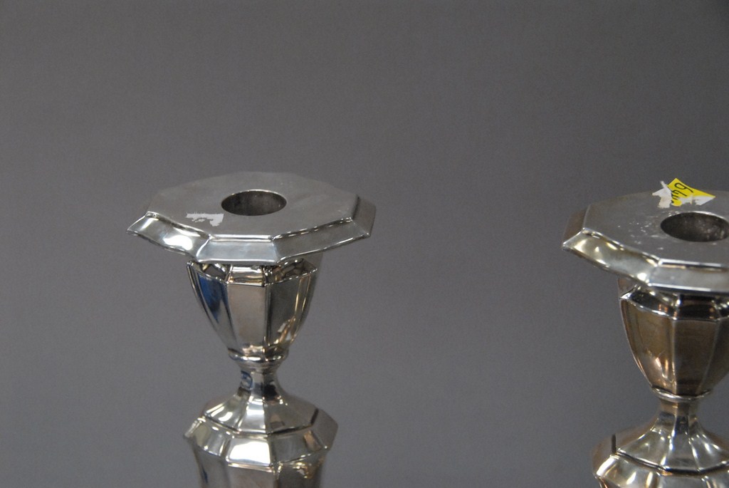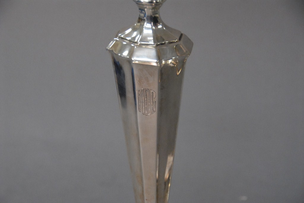 Lot 170: Pair of sterling silver candlesticks with eight side bases, weighted. Provenance: Estate of Judy McDonough Gengras of Stoner Drive, …