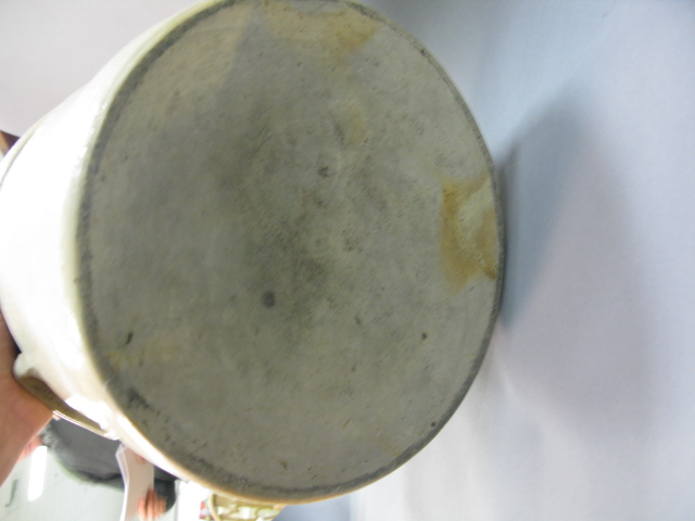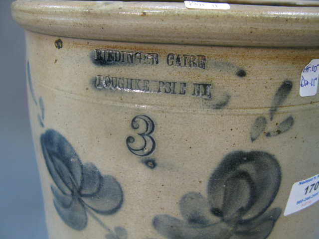Reidenger Caire NY three gallon stoneware crock with blue flower.