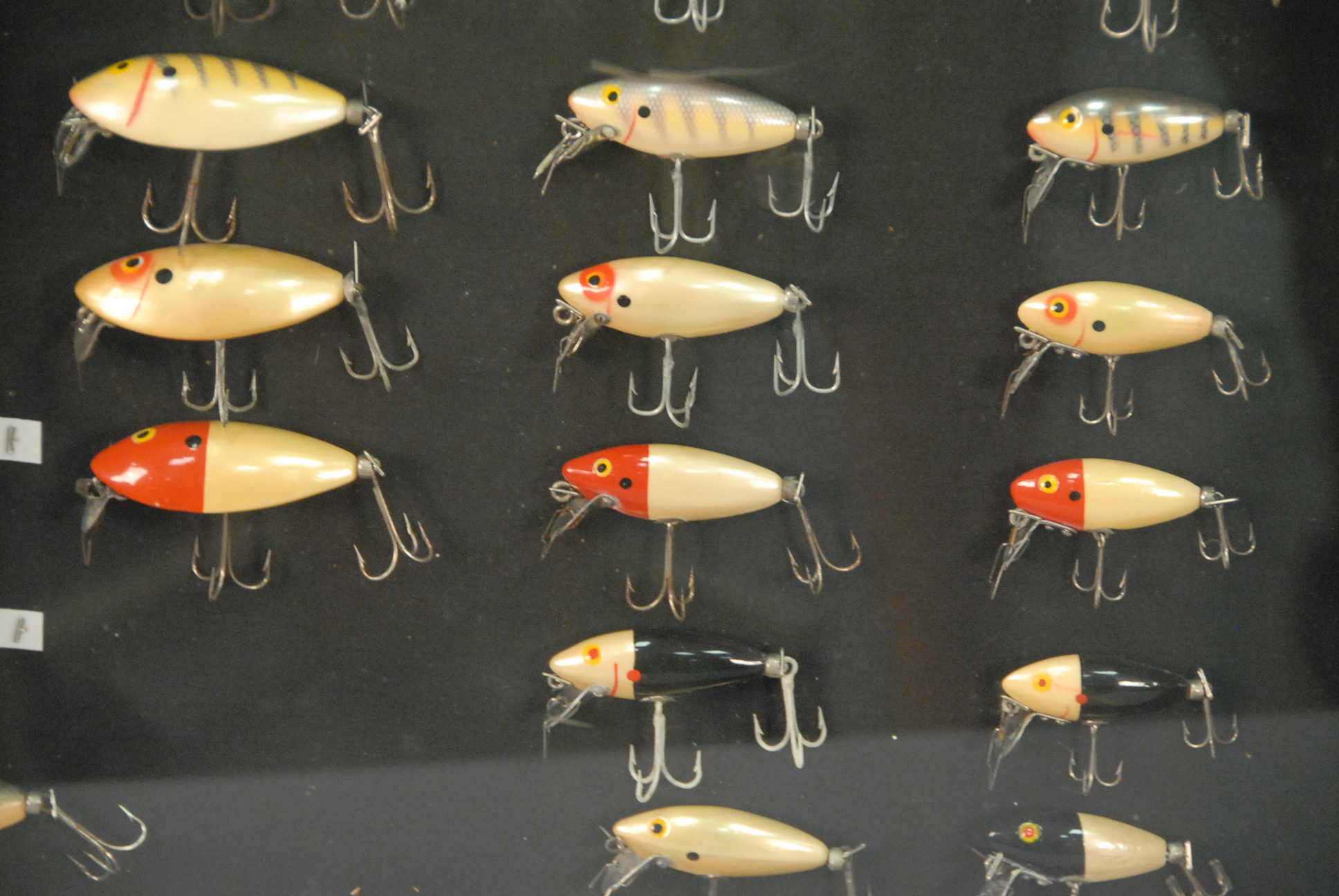 Lot 170: Sixty-seven Al Foss pork rind minnows and True Temper Shads to include Oriental, Skidders, Musky, Little Egypt, Shimmy, Crippled sha…