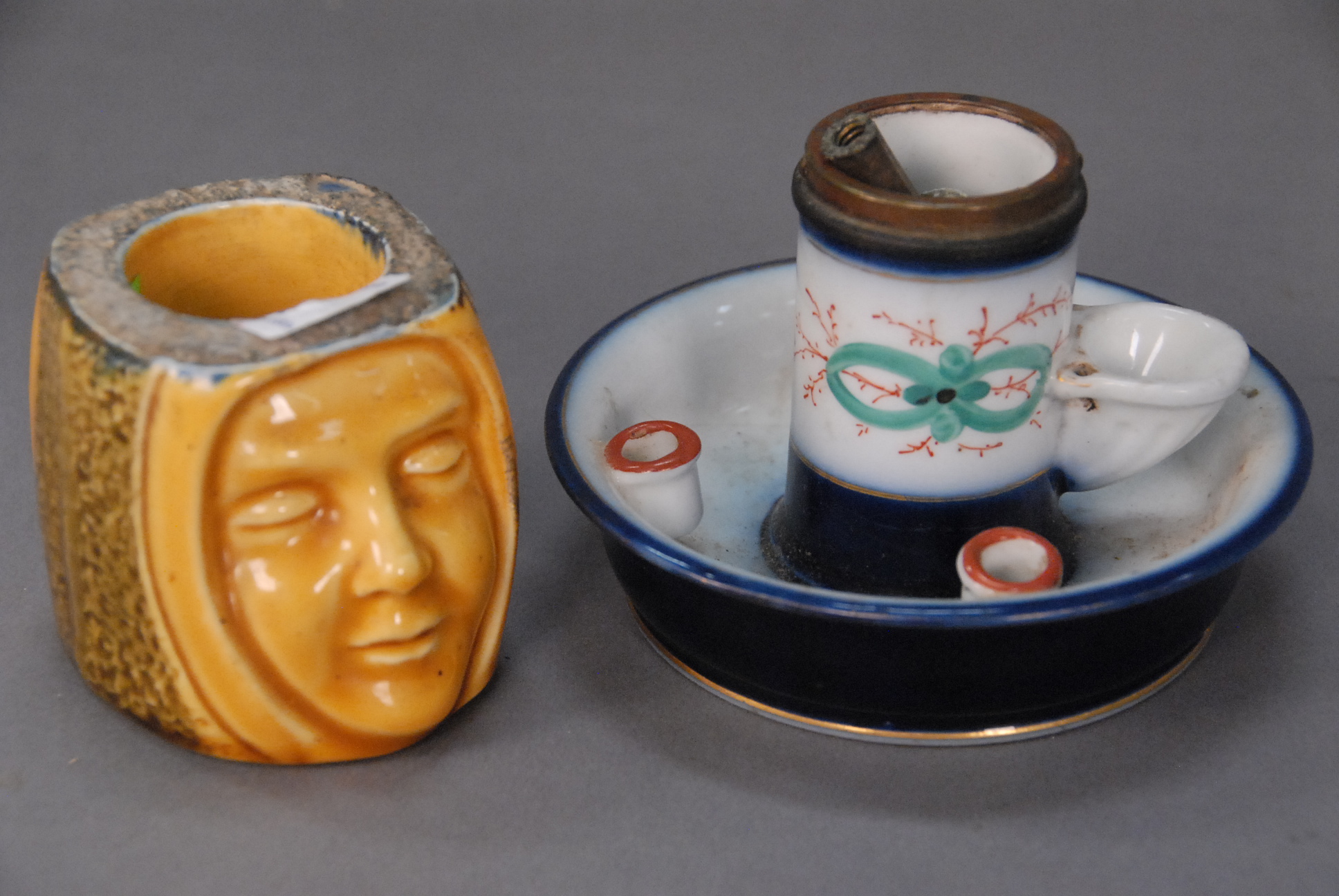Two inkwells to include a glazed double faced inkwell having closed eyed woman’s face on one side and open eyed man’s face on the other and a porcelain inkwell/quill holder missing cover.