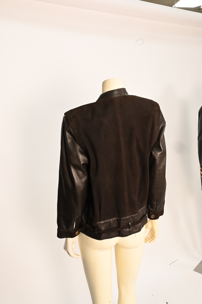 Lot 170: Vintage Celine Brown Leather/Suede Jacket, having stand up collar, leather sleeves and trim, front slip pockets and tie lower waist …