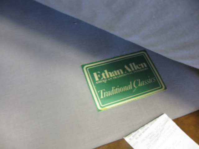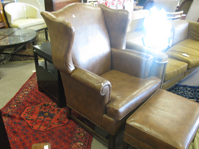 Vinyl Chippendale style upholstered wing chair and ottoman by Ethan Allen