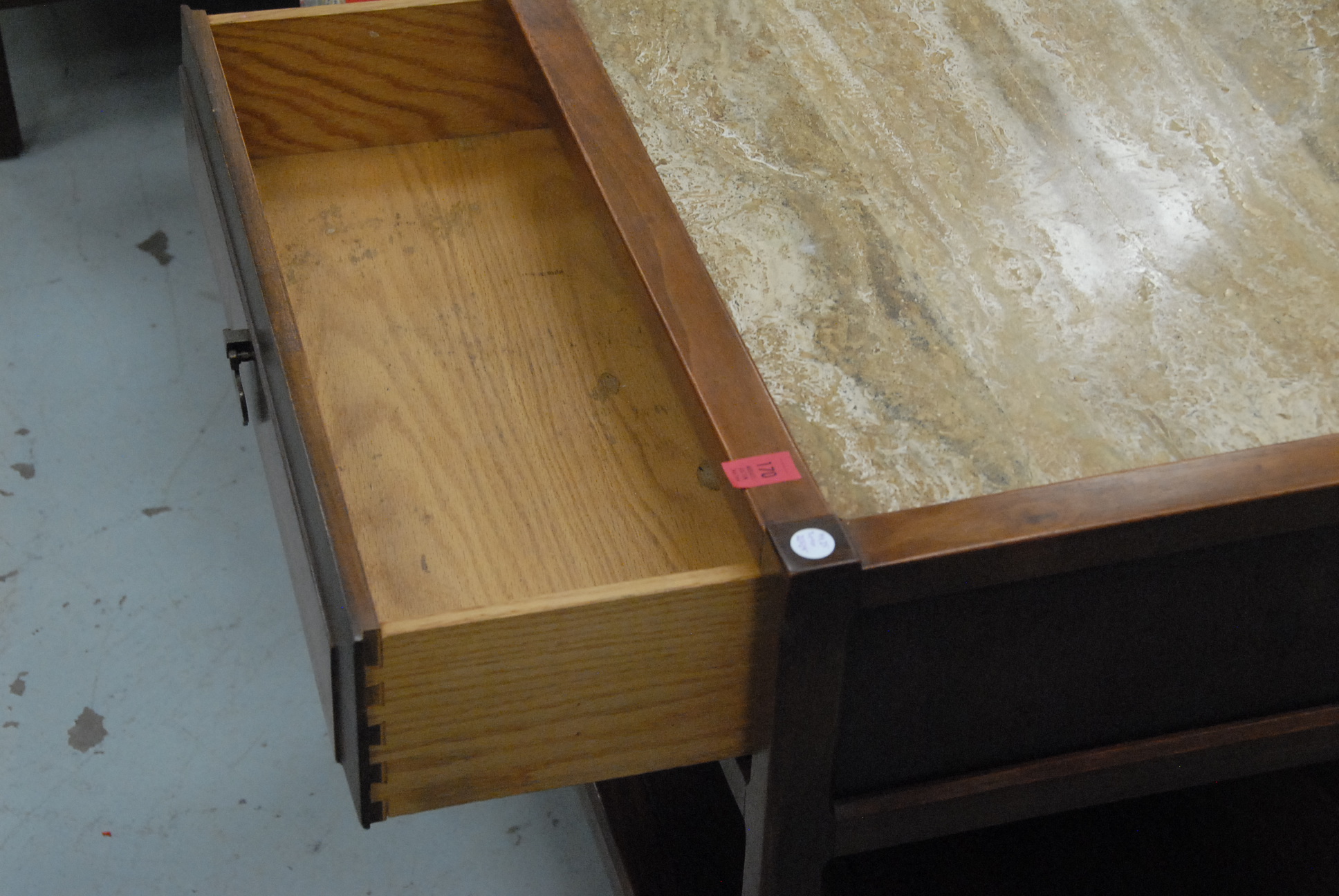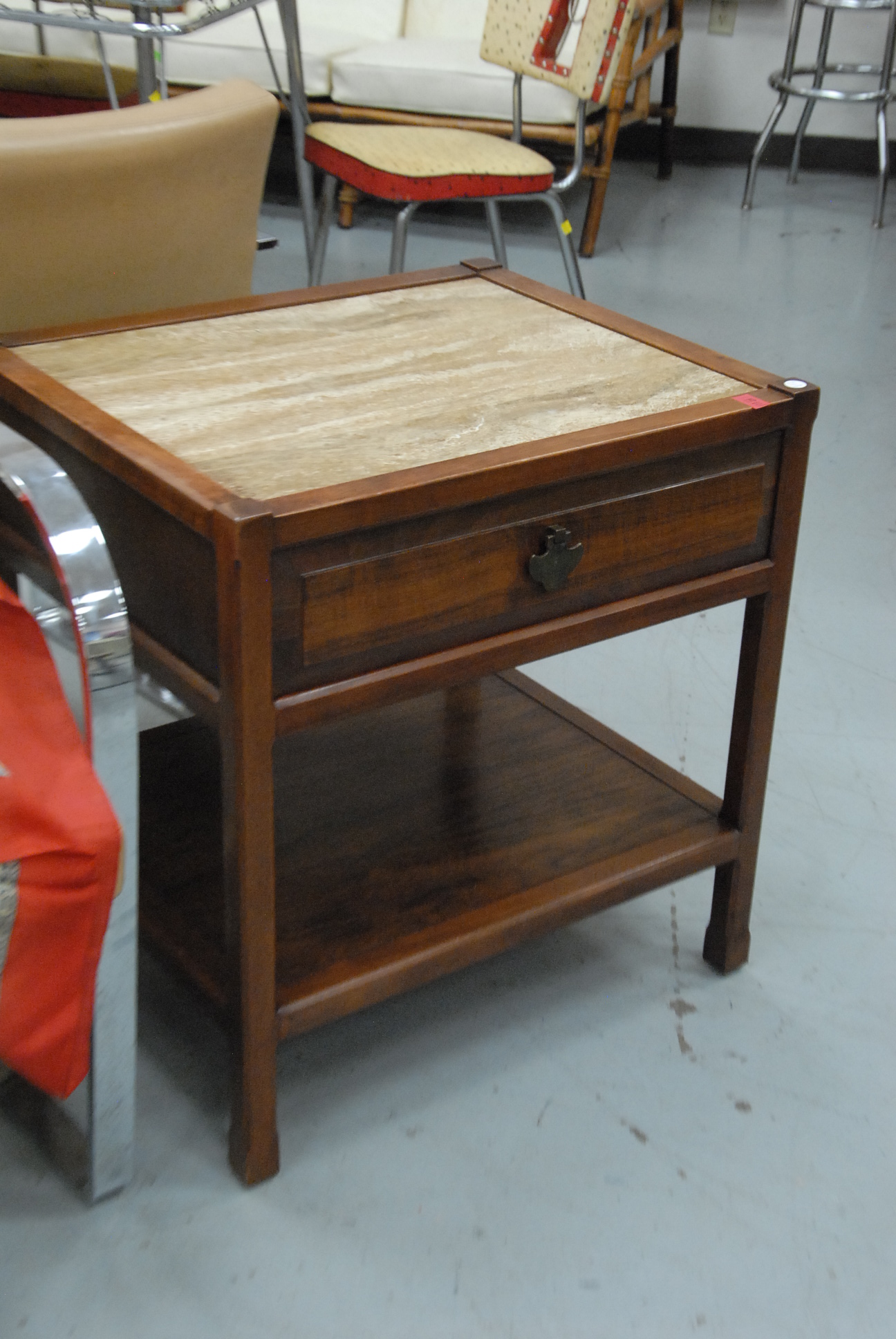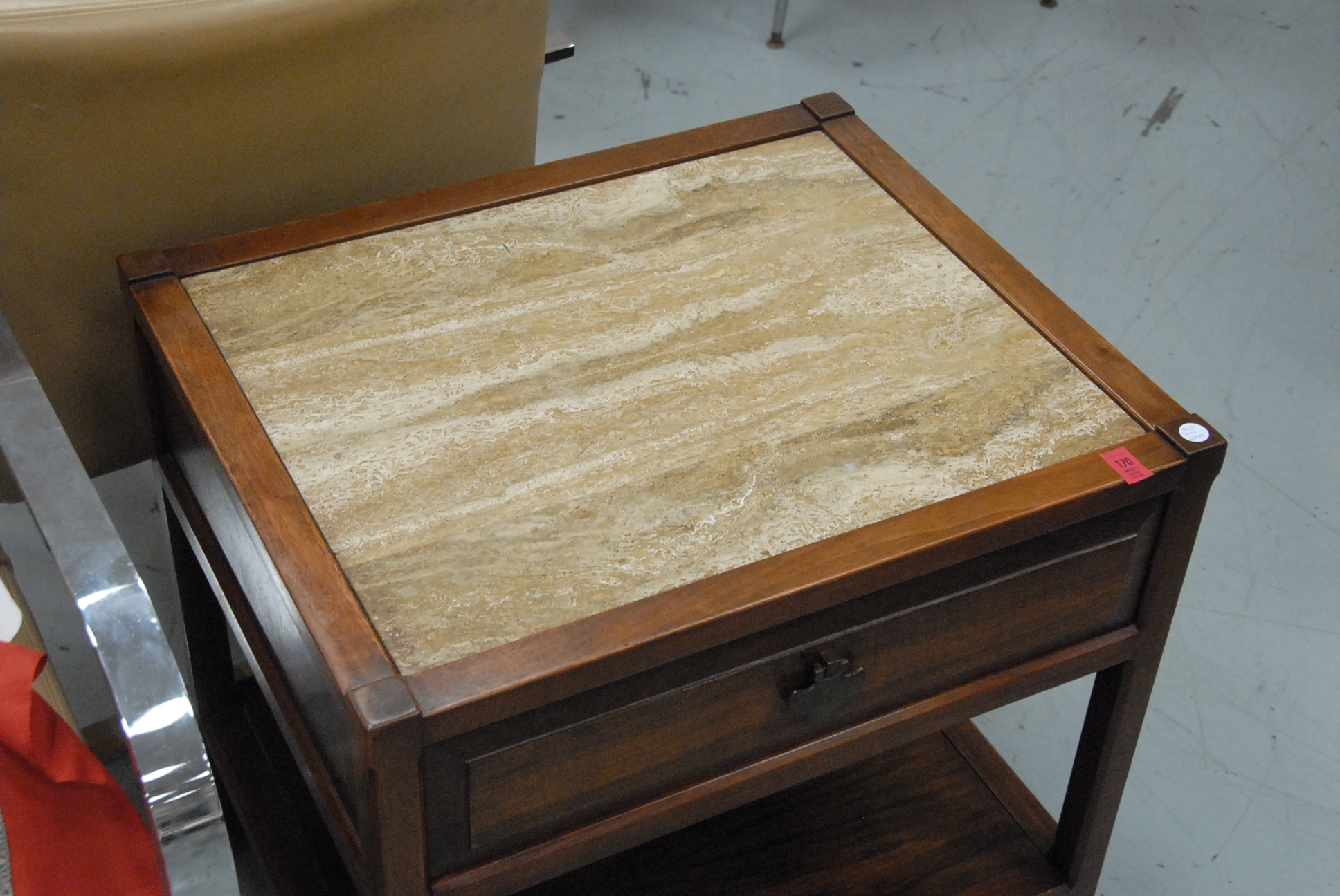 Widdecomb pair of end tables with inset marble tops and drawer, dated 1959, ht. 25in. top: 20 x 24