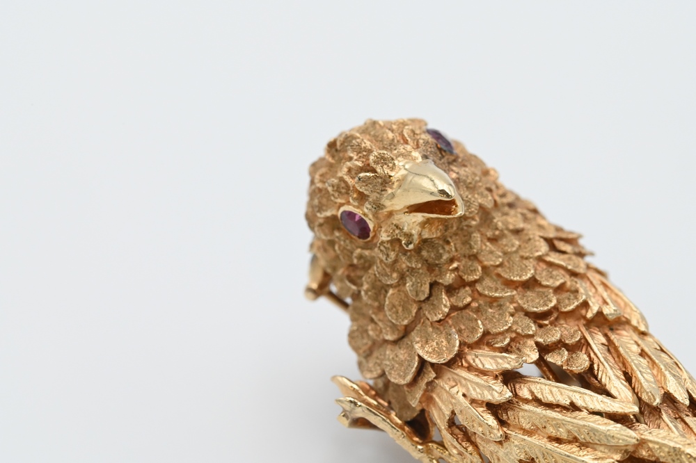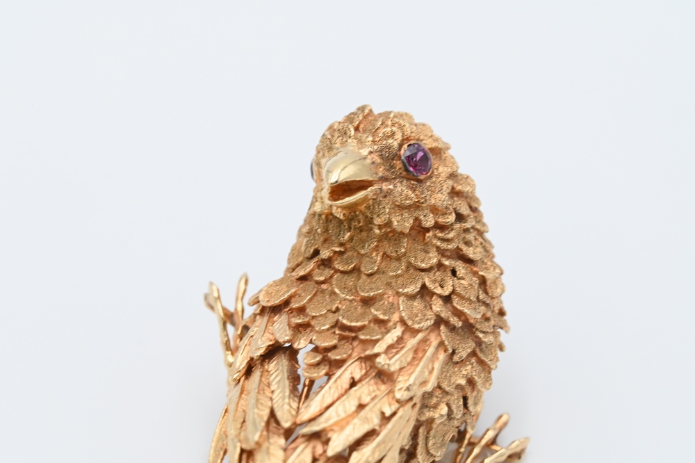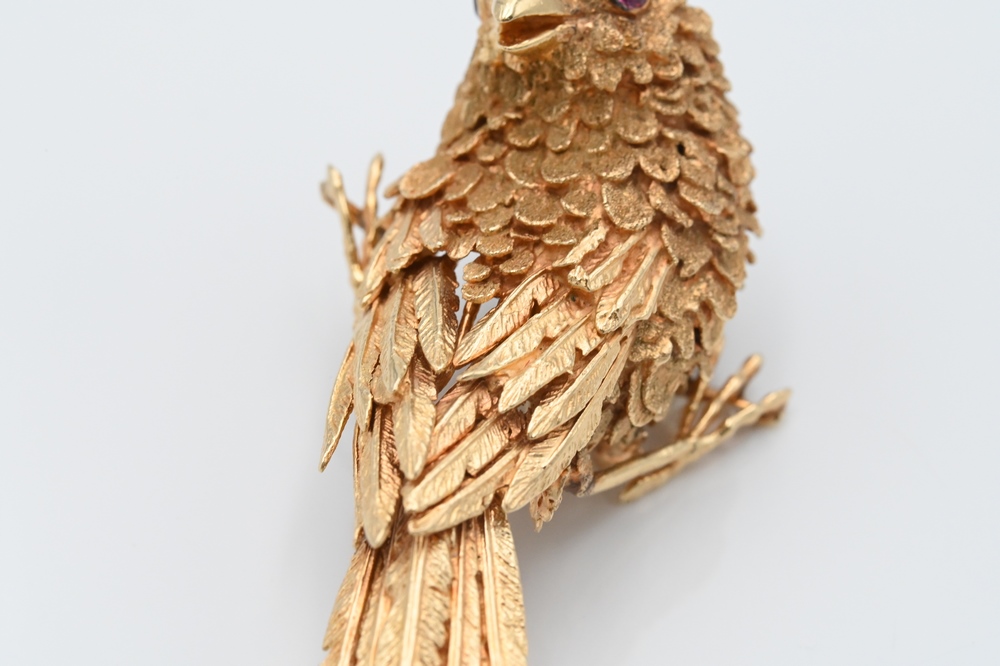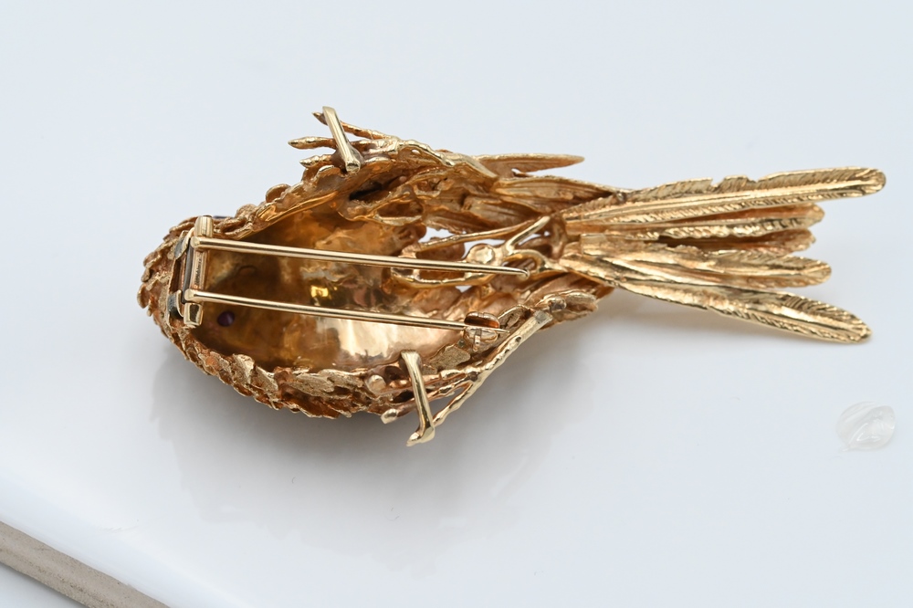 Lot 171: 14 Karat Yellow Gold Bird Brooch, having ruby eyes, length 2 3/4 inches, 29 grams.