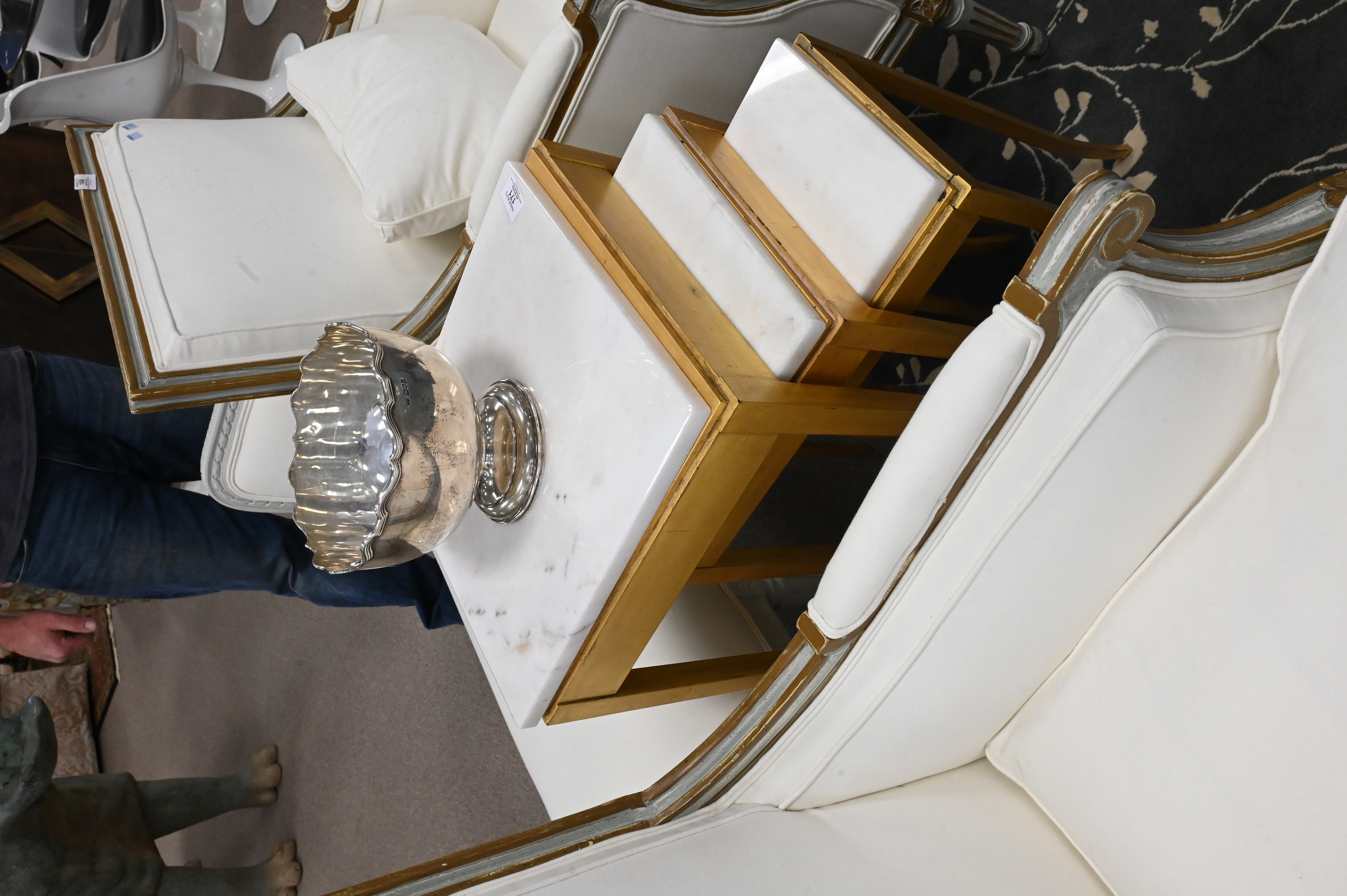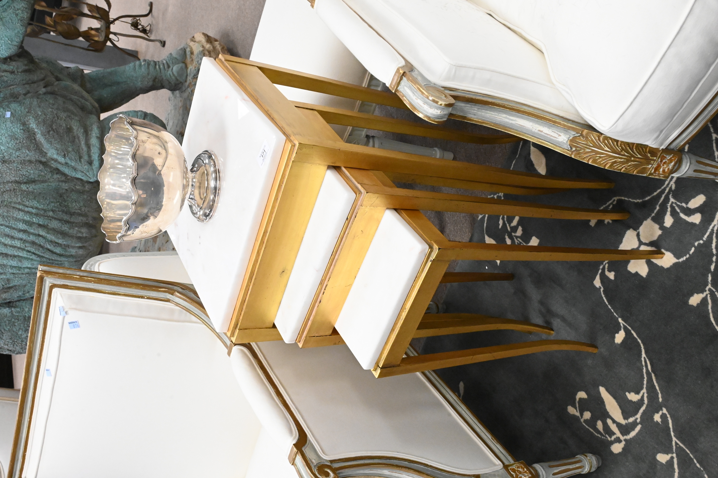 custom made, having detached white marble tops over giltwood body and flaring legs, label on underside