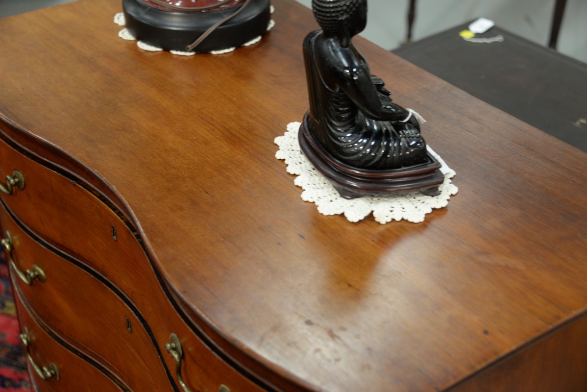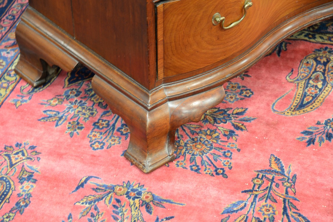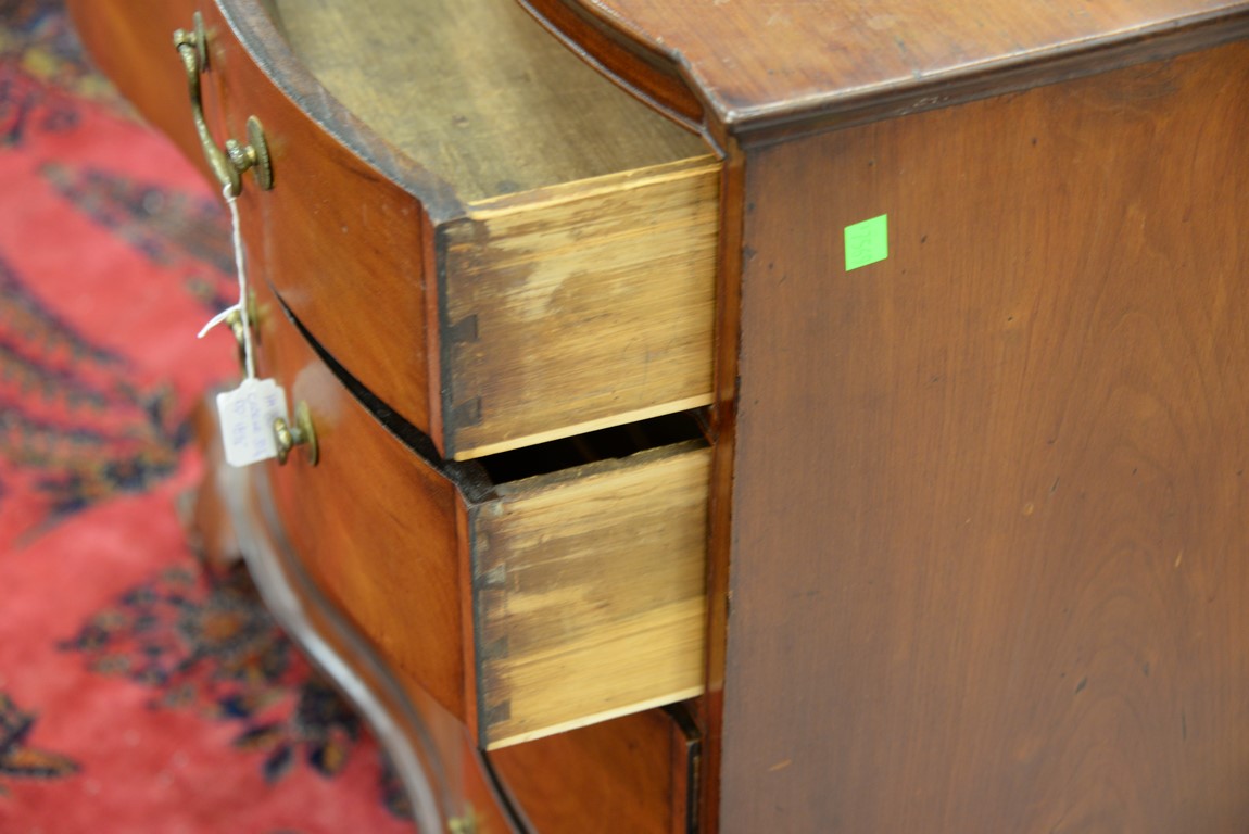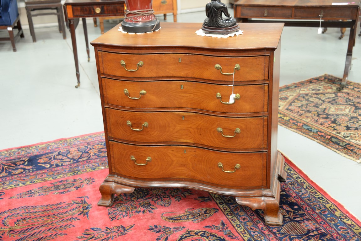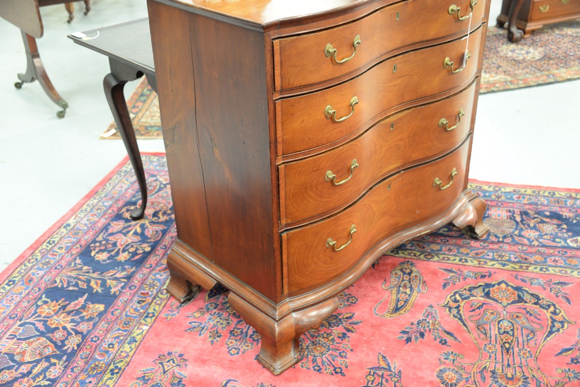 Lot 171: Chippendale cherry reverse serpentine chest having reverse serpentine top over four conforming drawers with block ends set on blocked ogee feet and quadrant blocking having original hardware, attributed to Eliphalet Chapin both back feet pieced.