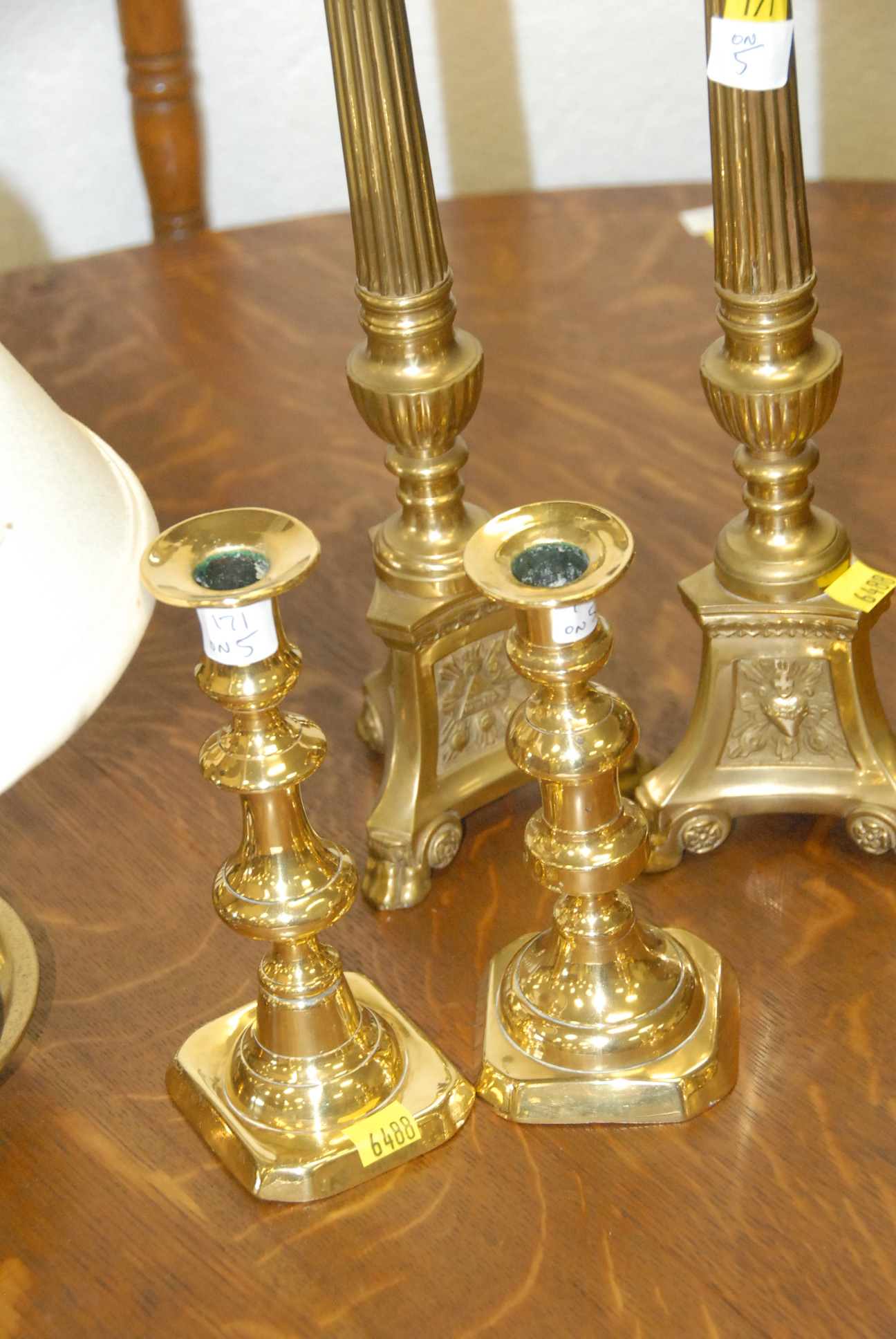 Lot 171: Five piece lot two antique brass push-up candlesticks, pair of tall brass candlesticks, and lamp.