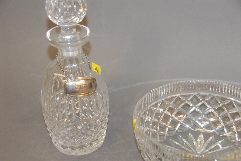 Four piece lot of Waterford crystal decanter with stopper having sterling silver Gin tag, bowl, vase, and picture frame. Provenance: Estate of Judy Gengras McDonough of West Hartford, CT.