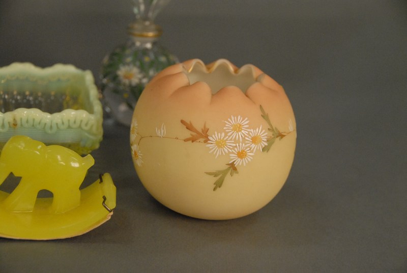 Lot 171: Group of art glass to include Burmese rose bowl, Fenton enameled rose bowl, Vaseline colored square bowl, small enameled bird box, p…