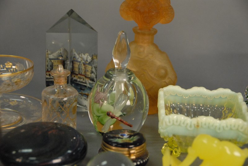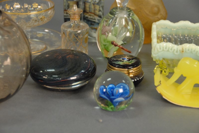 Group of art glass to include Burmese rose bowl, Fenton enameled rose bowl, Vaseline colored square bowl, small enameled bird box, perfumes, Burch paperweight, Peet Robison dragon fly perfume.