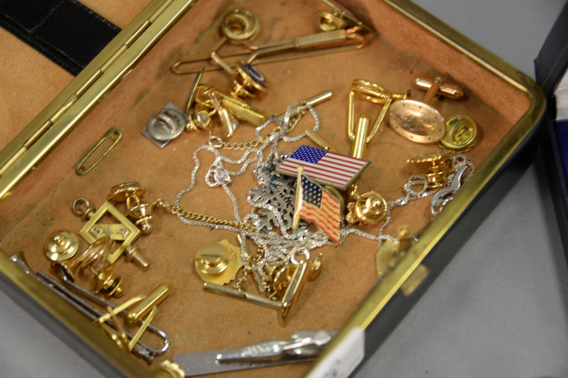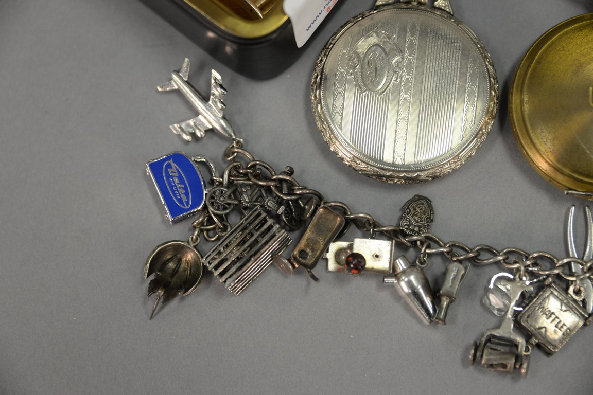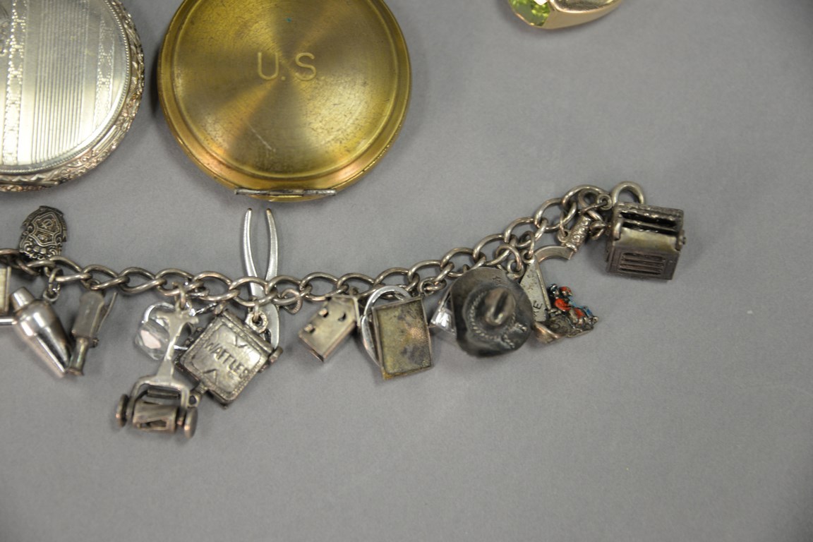 Lot 171: Group of jewelry and costume jewelry to include a sterling charm bracelet, 14K gold ring, cufflinks, 2 pocket watches, enameled silv…