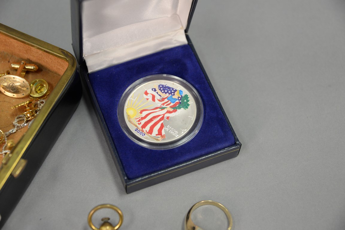 Group of jewelry and costume jewelry to include a sterling charm bracelet, 14K gold ring, cufflinks, 2 pocket watches, enameled silver 1 oz. silver coin.