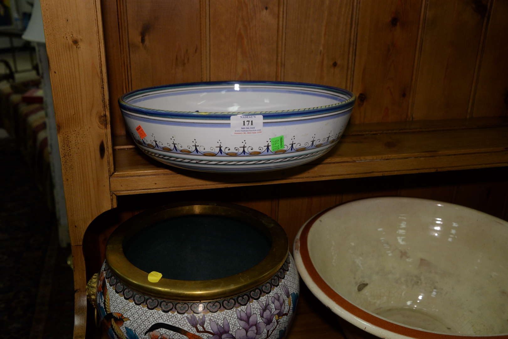 Lot 171: Group of Ten Large Ceramic Planters and Bowls ton include one cloisonne planter, one Italian fish platter and a large red Chinese bo…