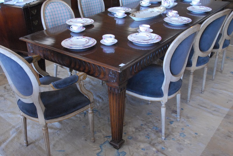 Lot 171: Mahogany Continental style dining table with two leaves. ht. 30in. top: 41 1/2 x 95 plus two 36 leaves opens to 167in.