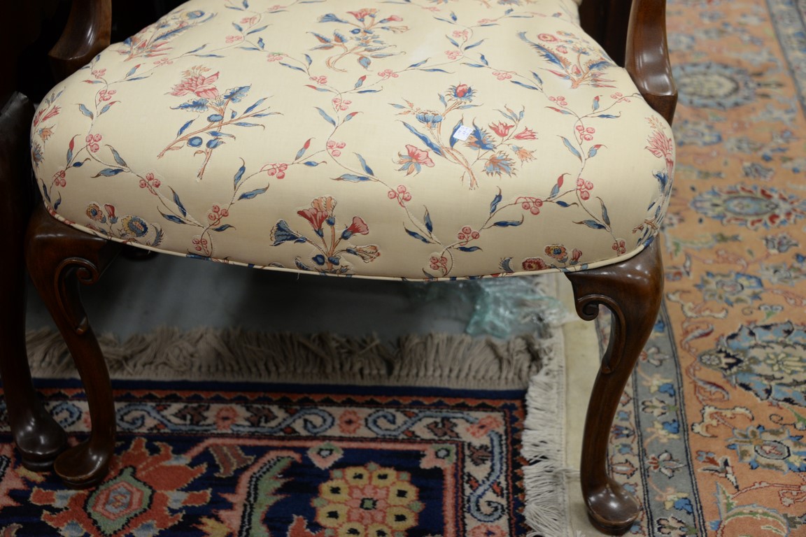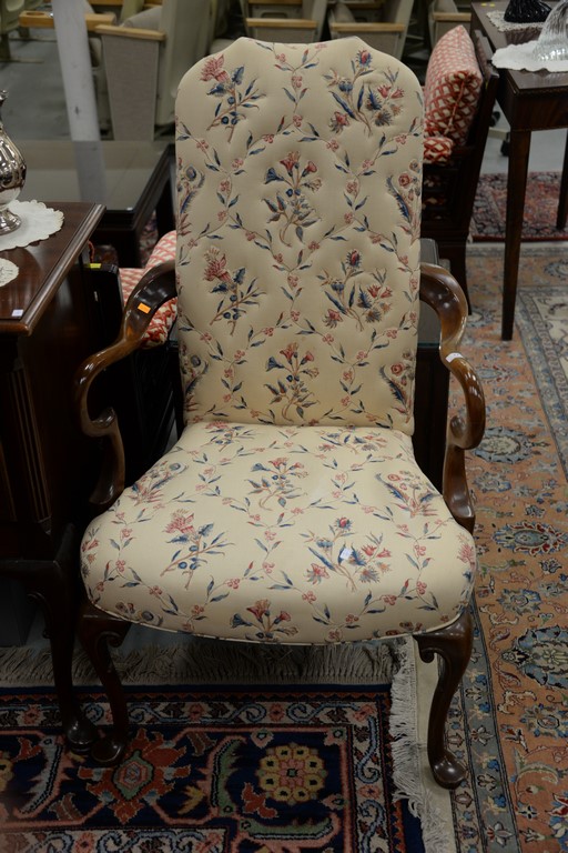 Pair of mahogany Queen Anne style armchairs tear in back of one chair.