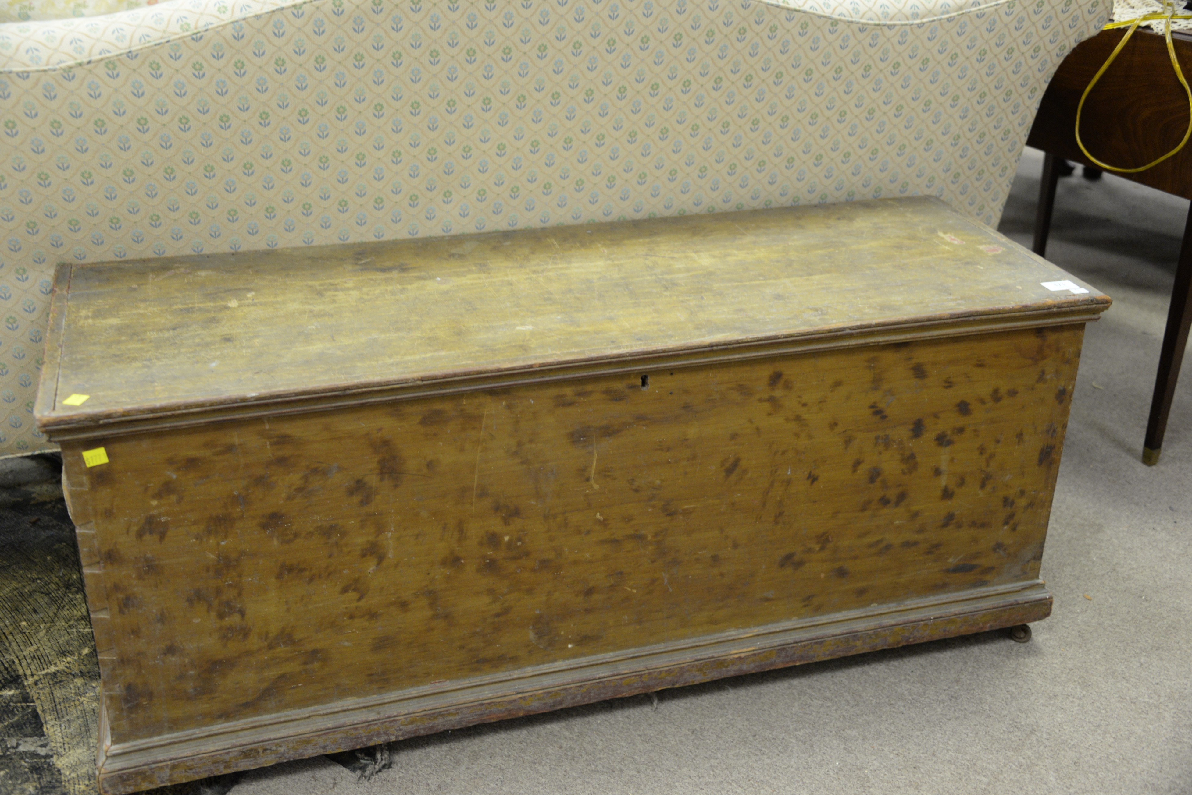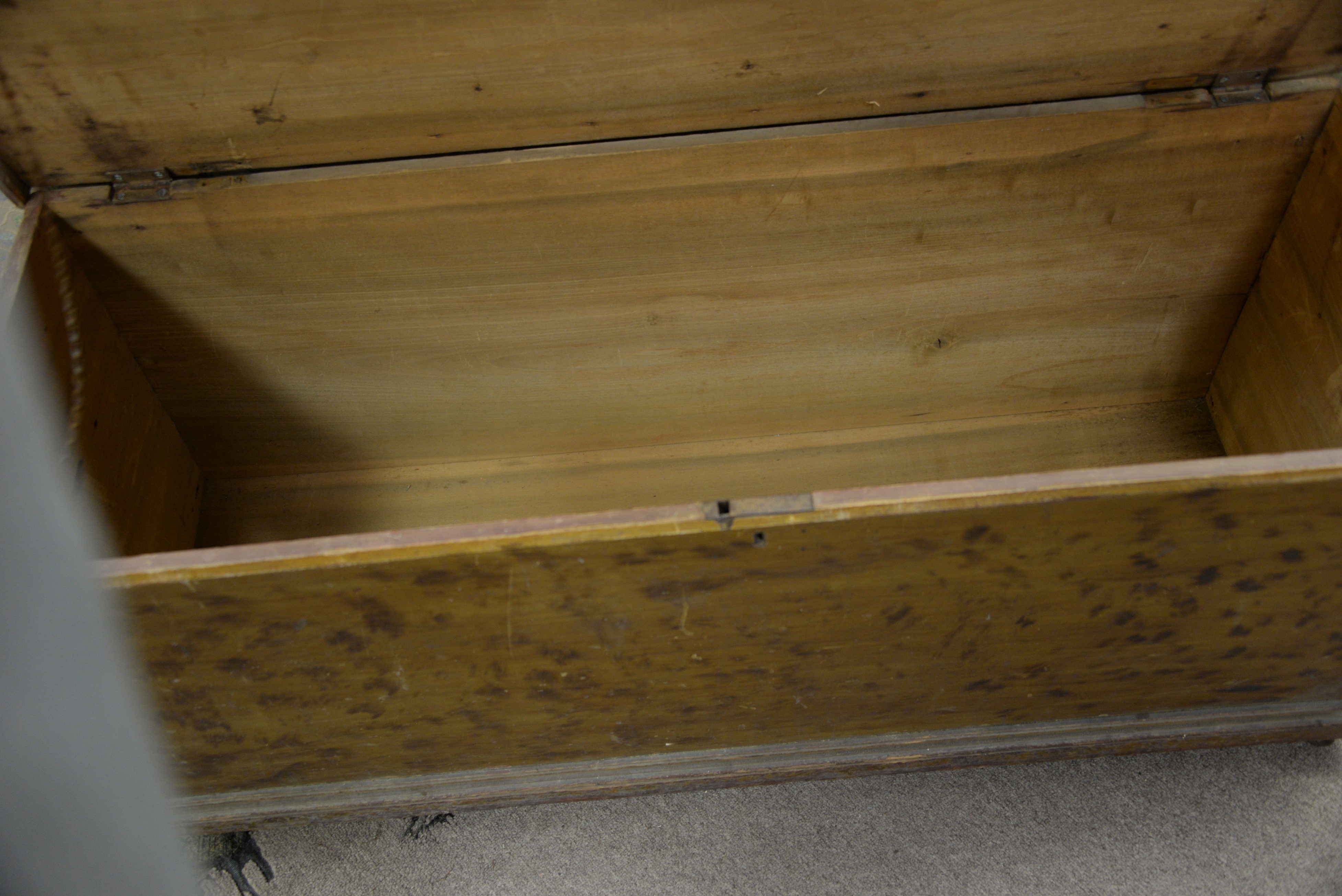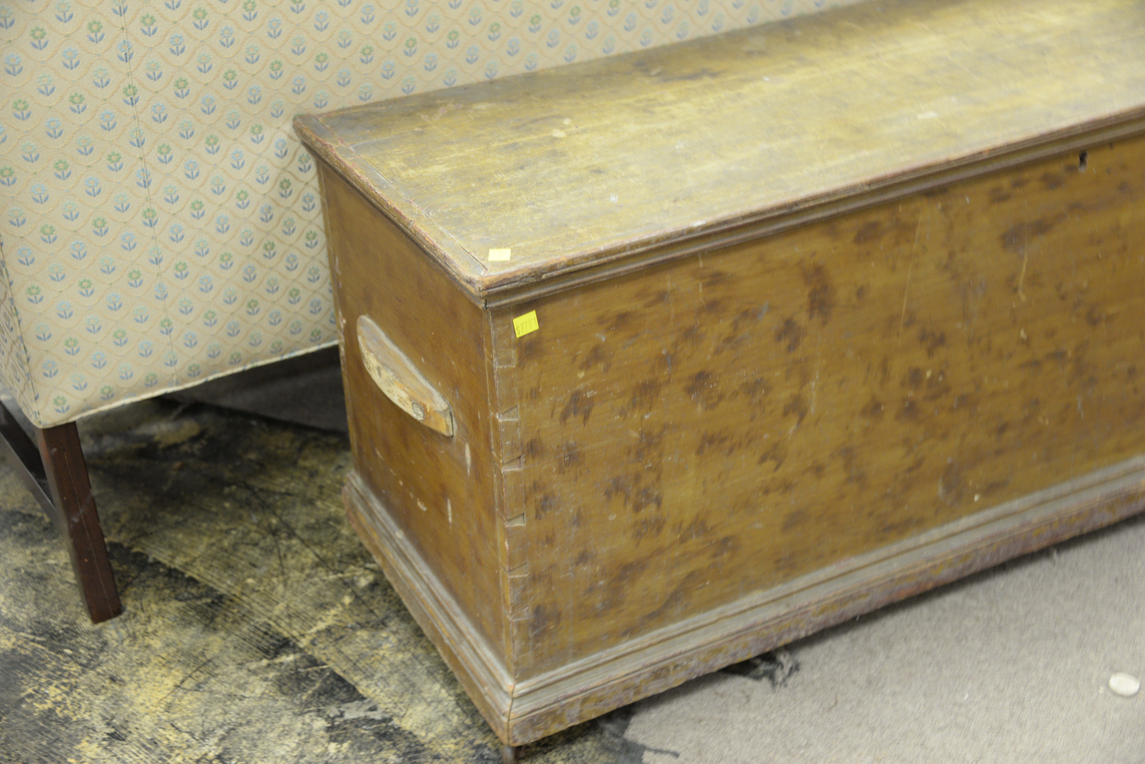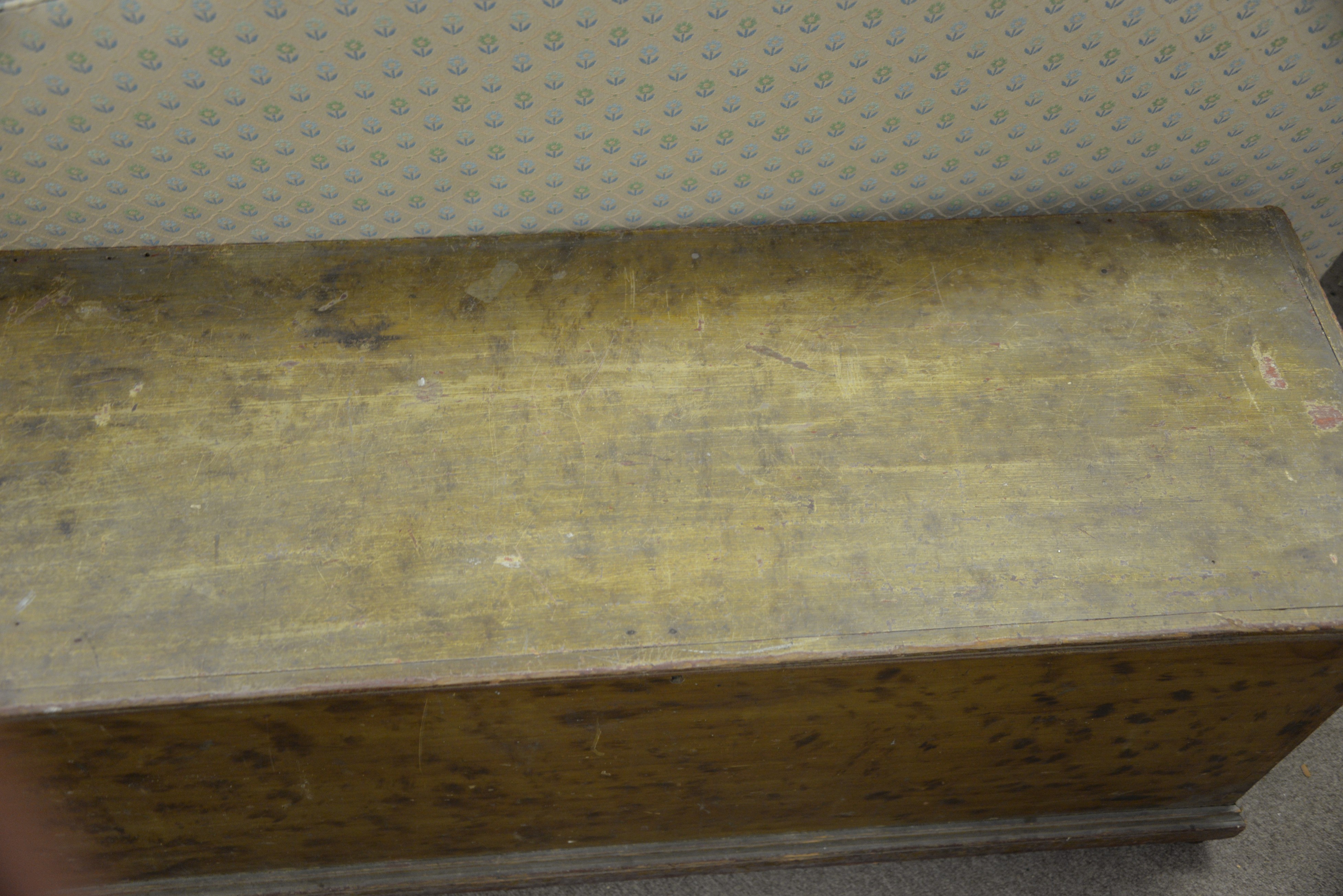 Primitive lift top blanket chest with original paint. ht. 20 in. wd. 47 in. dp. 16 in.