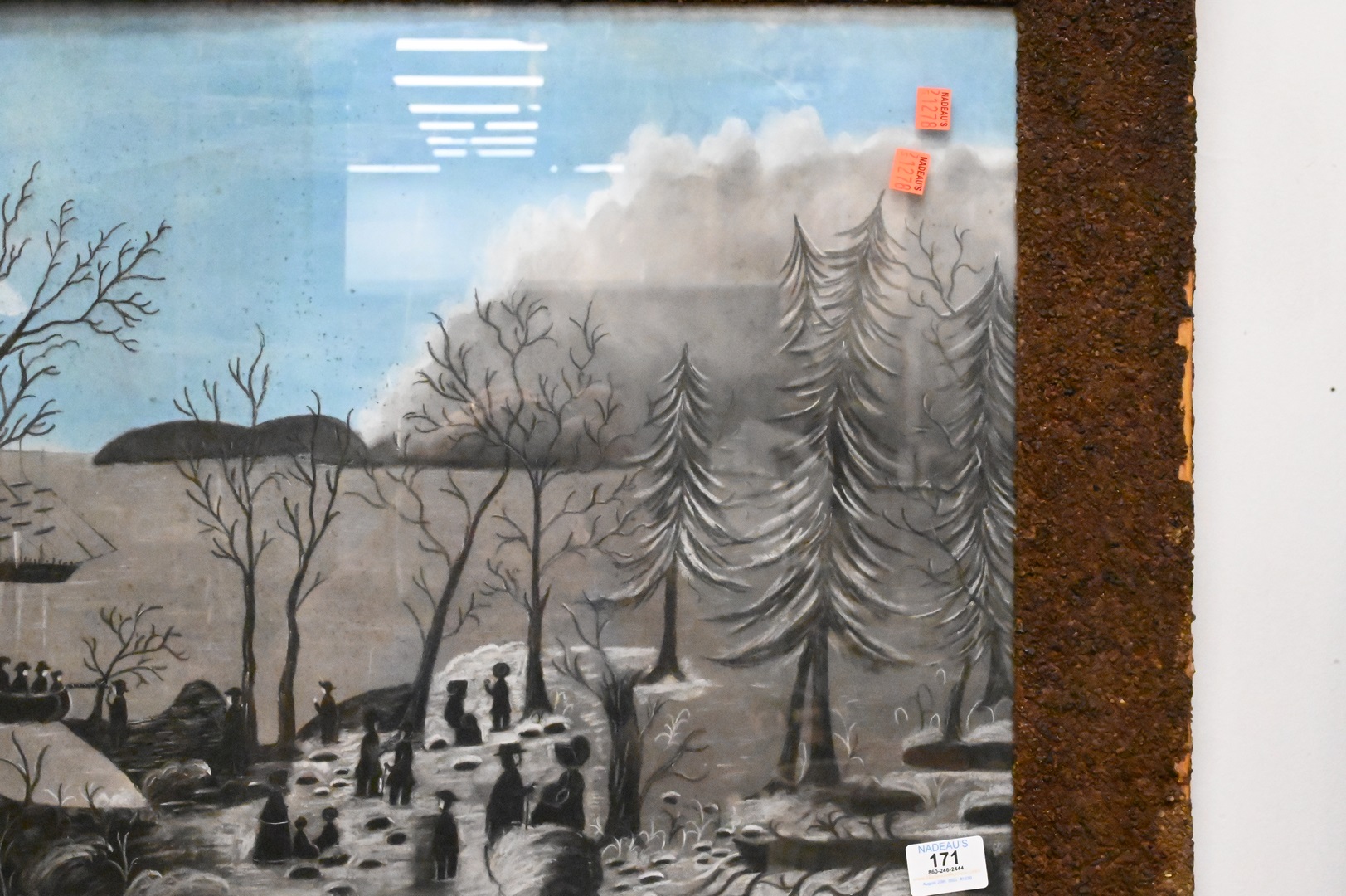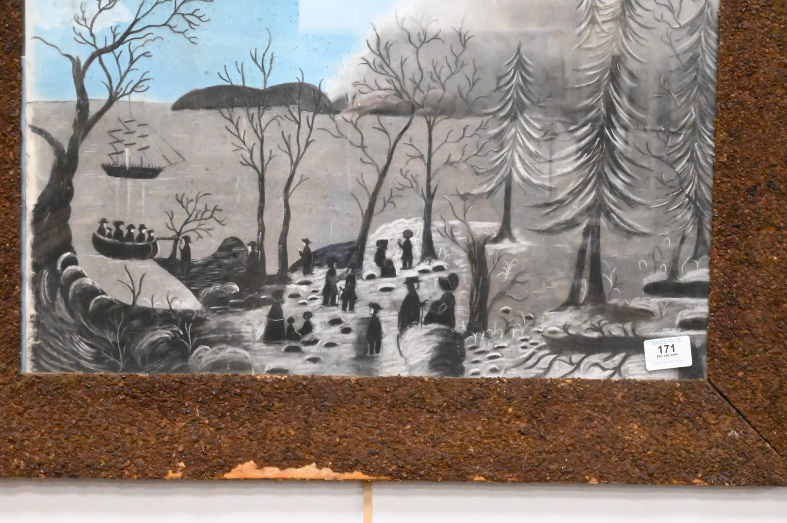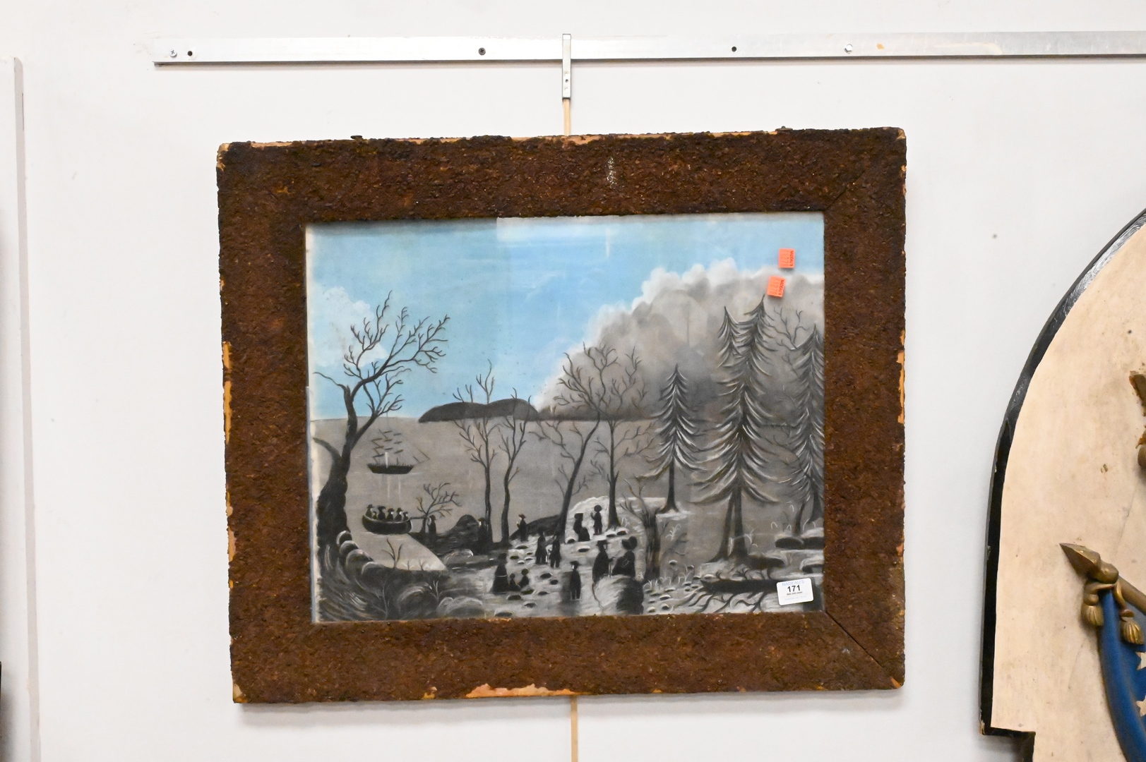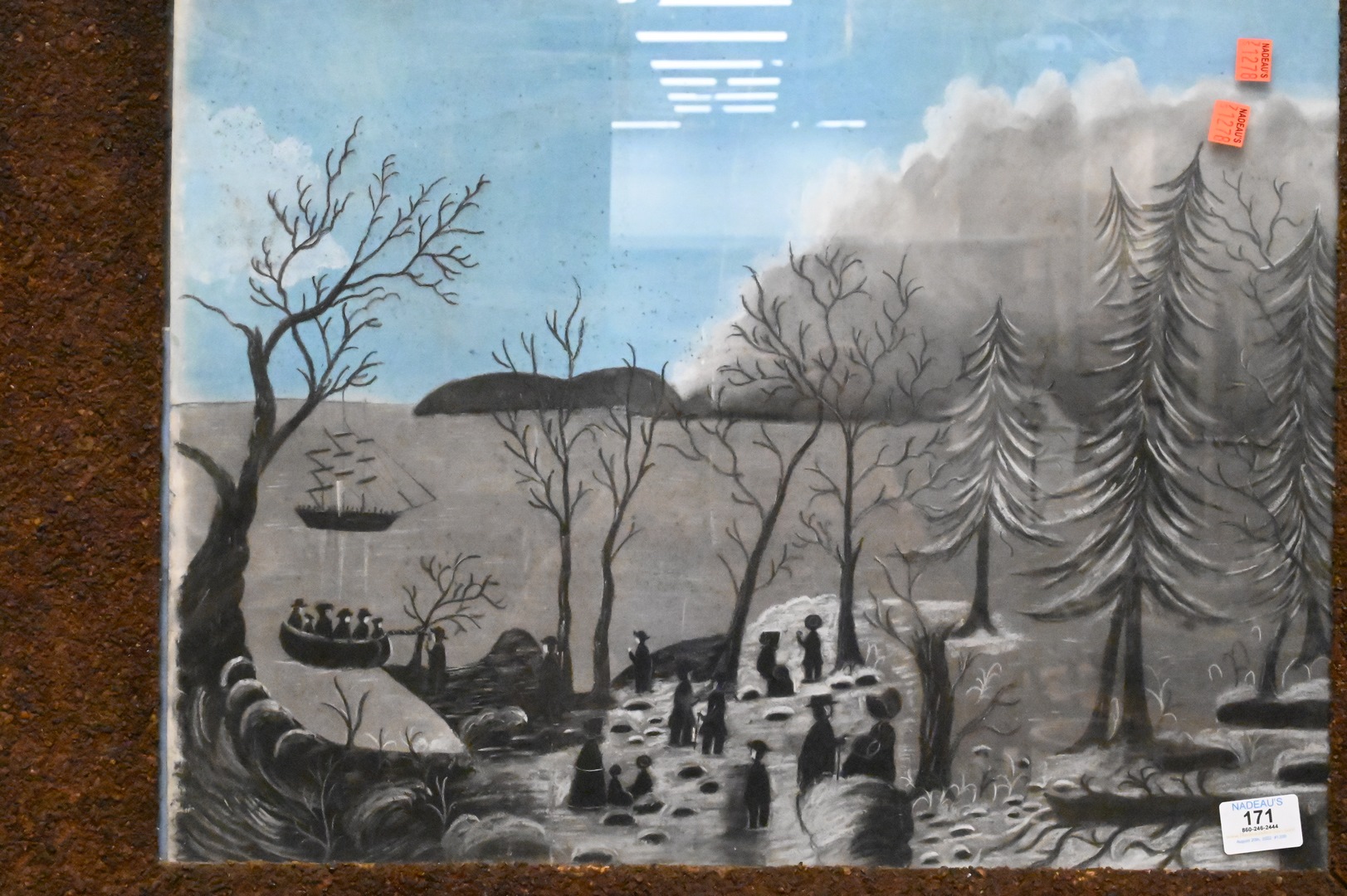 Primitive Sandpaper Painting, depicting the Pilgrims landing in America, unsigned, 18″ x 23″. Provenance: Estate of Peter Tillou, Litchfield, Connecticut.