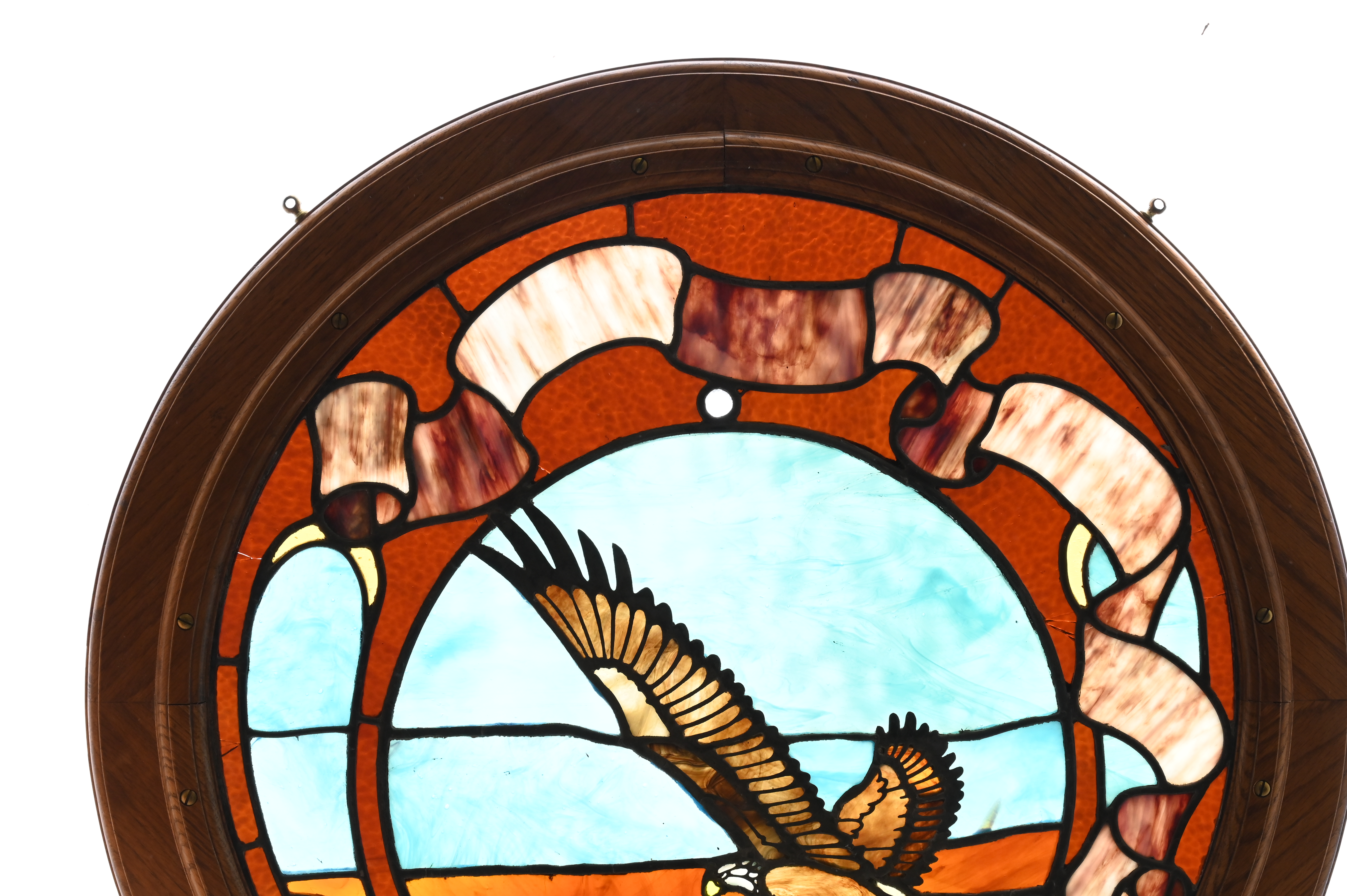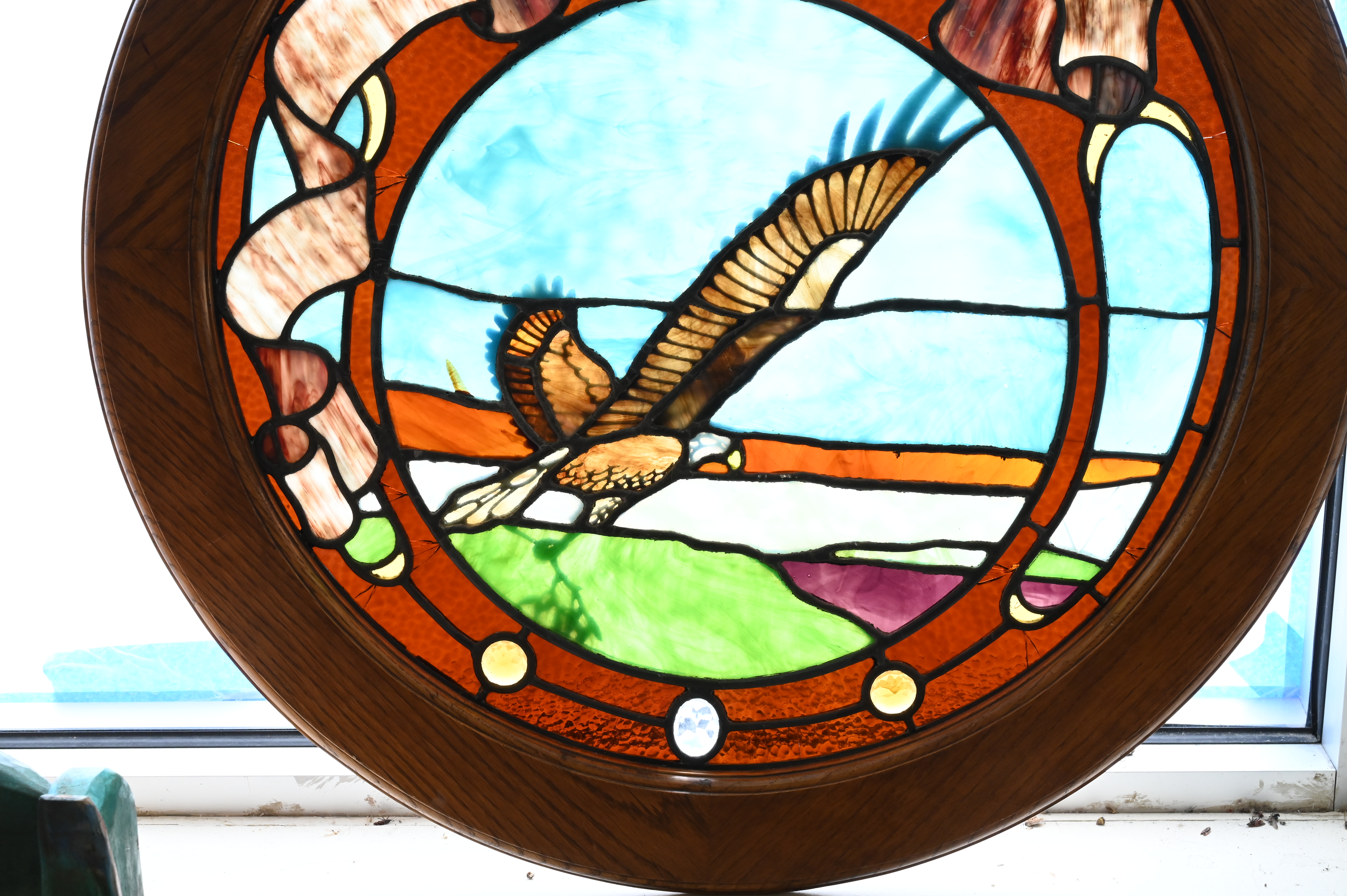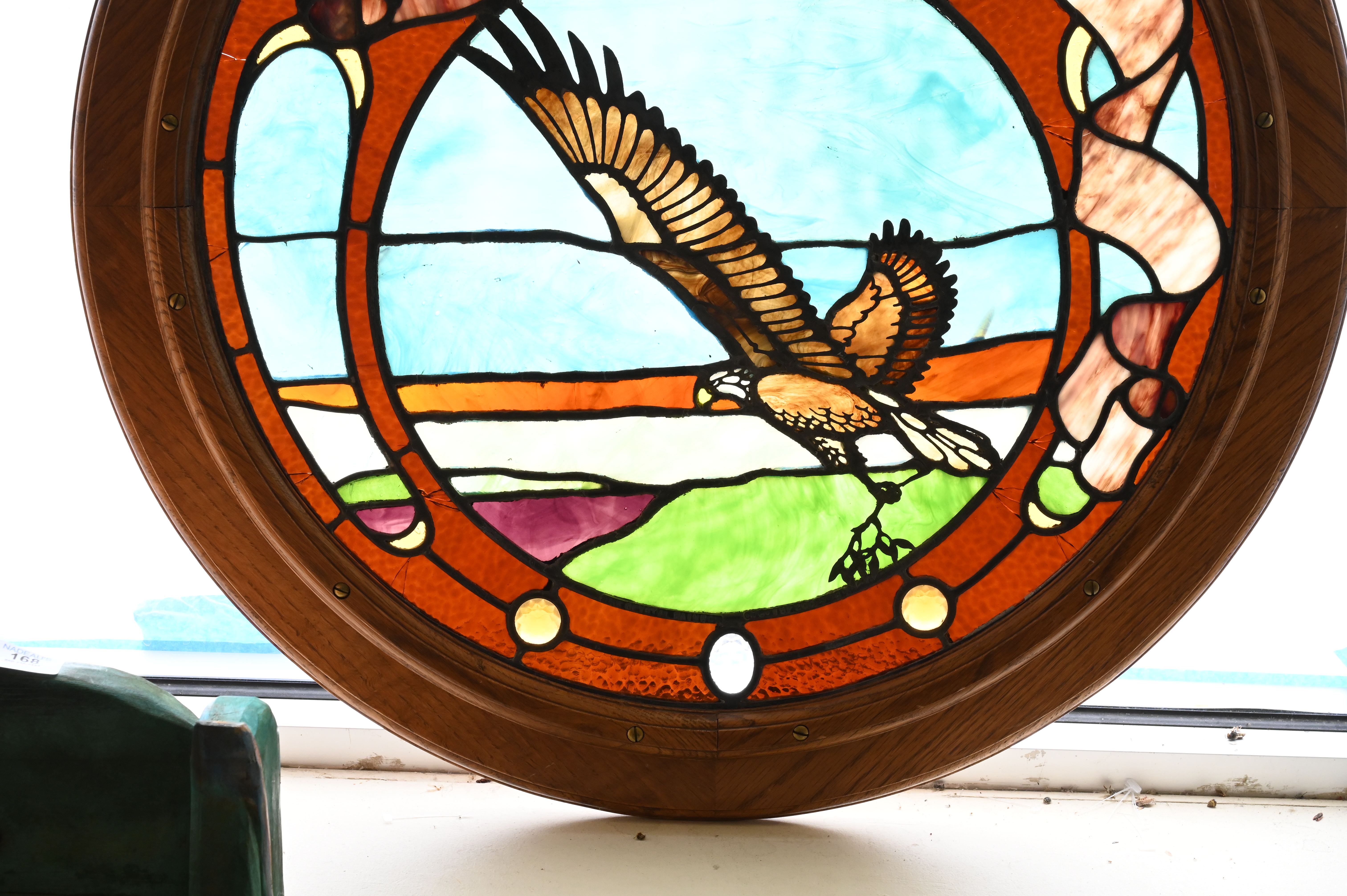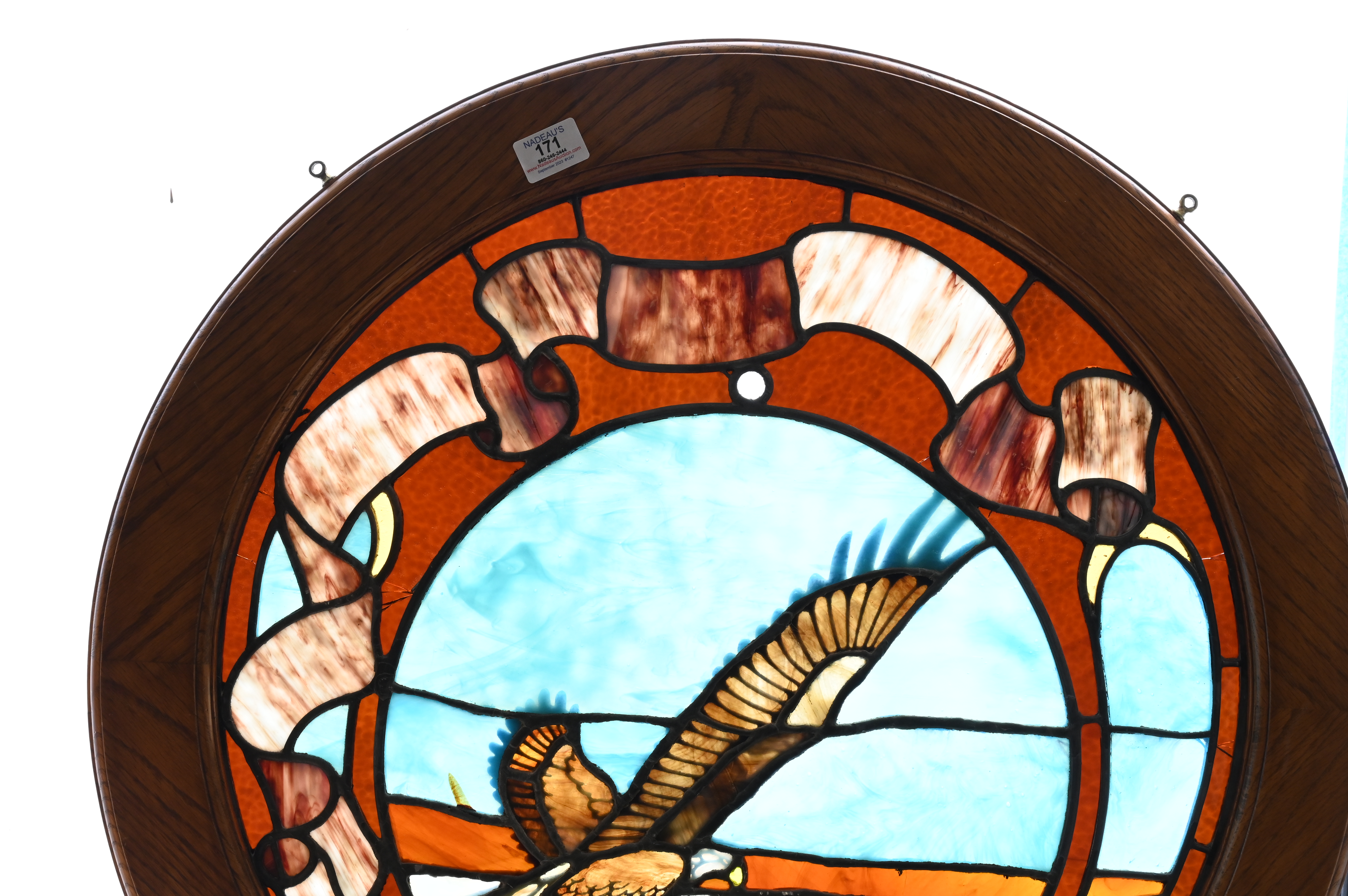 Round Leaded and Wooden Slag/Stained Glass Bald Eagle Window, “The Crystal Rainbow” stamped into lead, “a76.15/200.778”, one broken glass, diameter 30 inches.