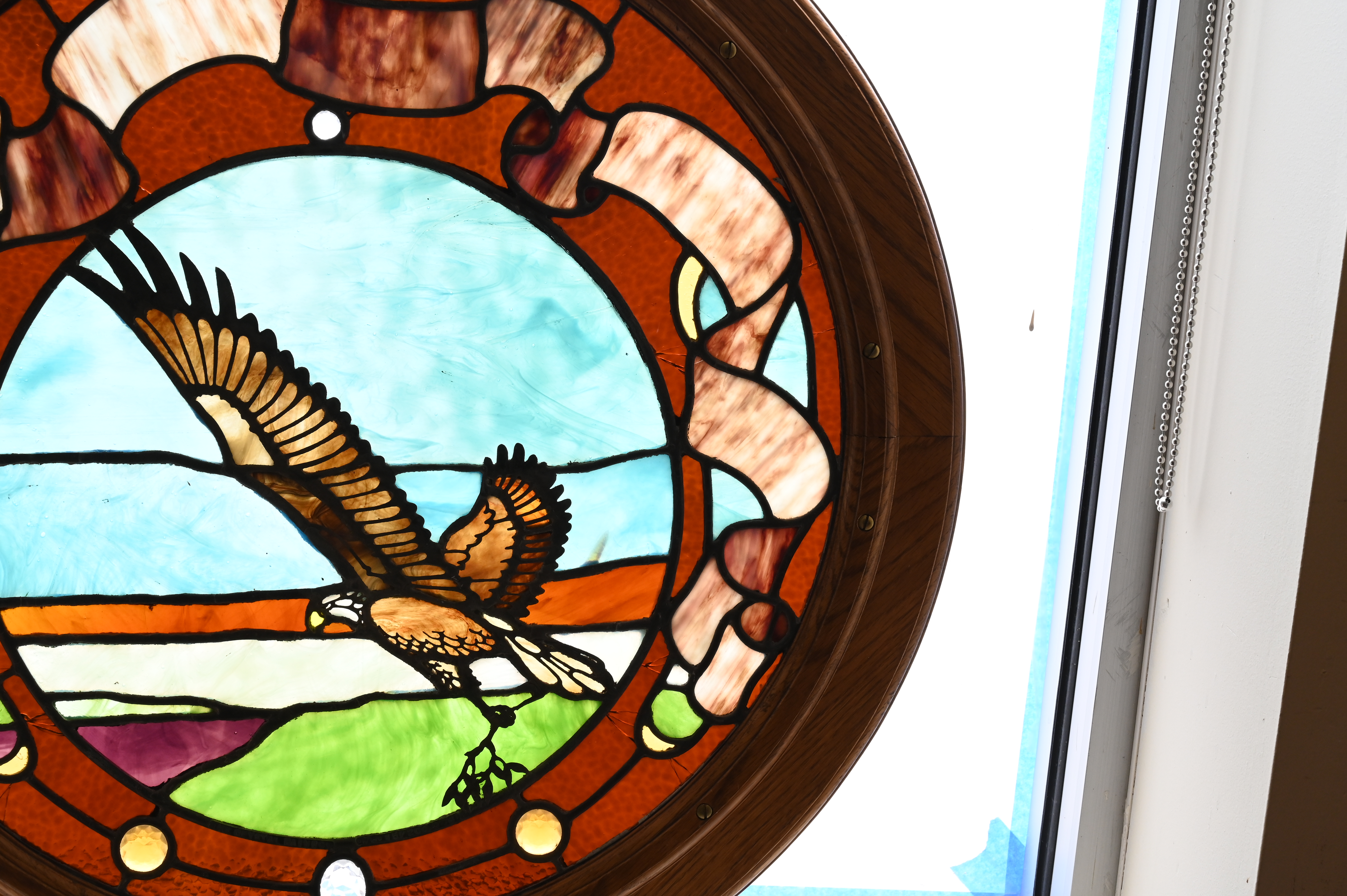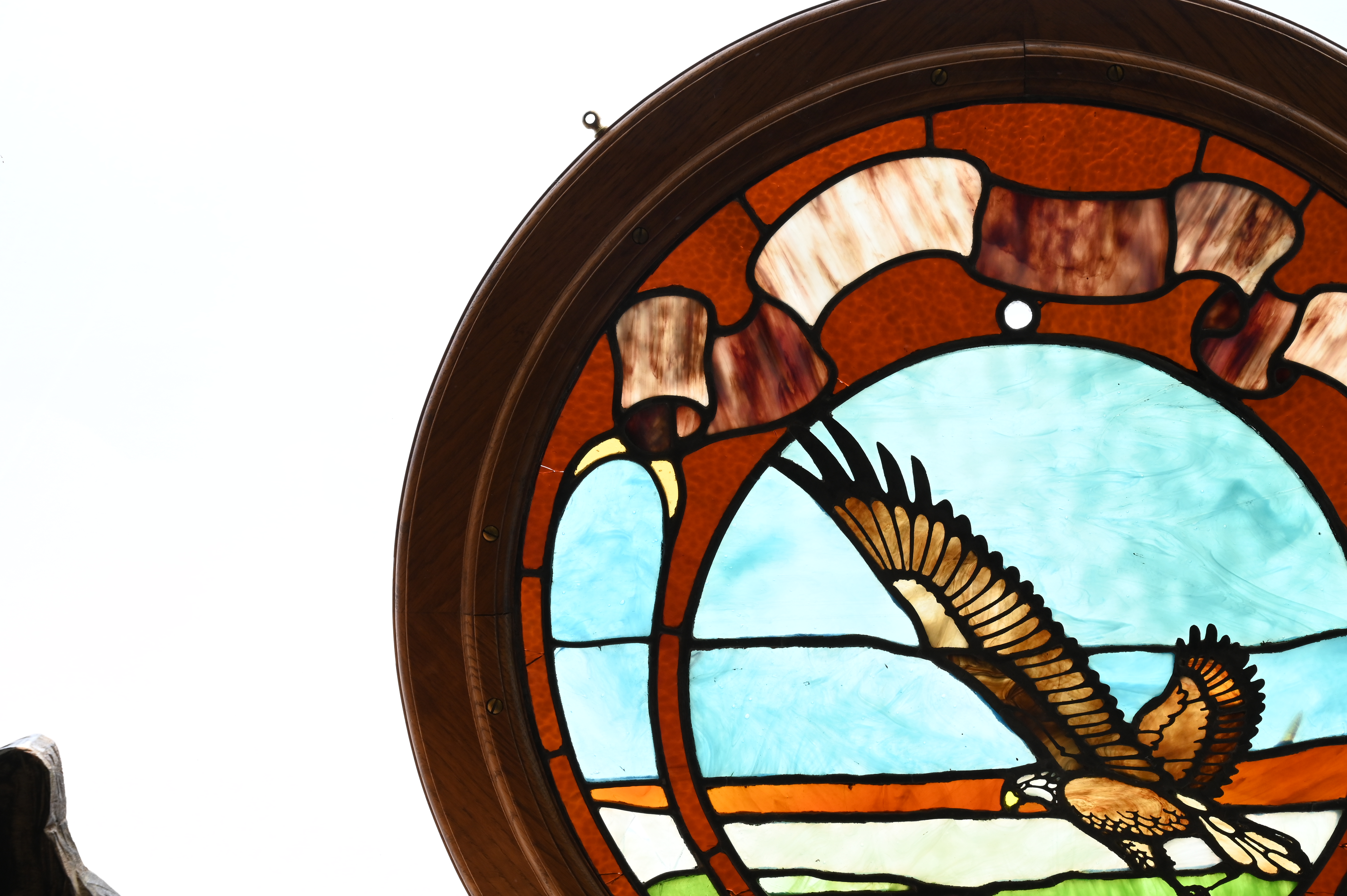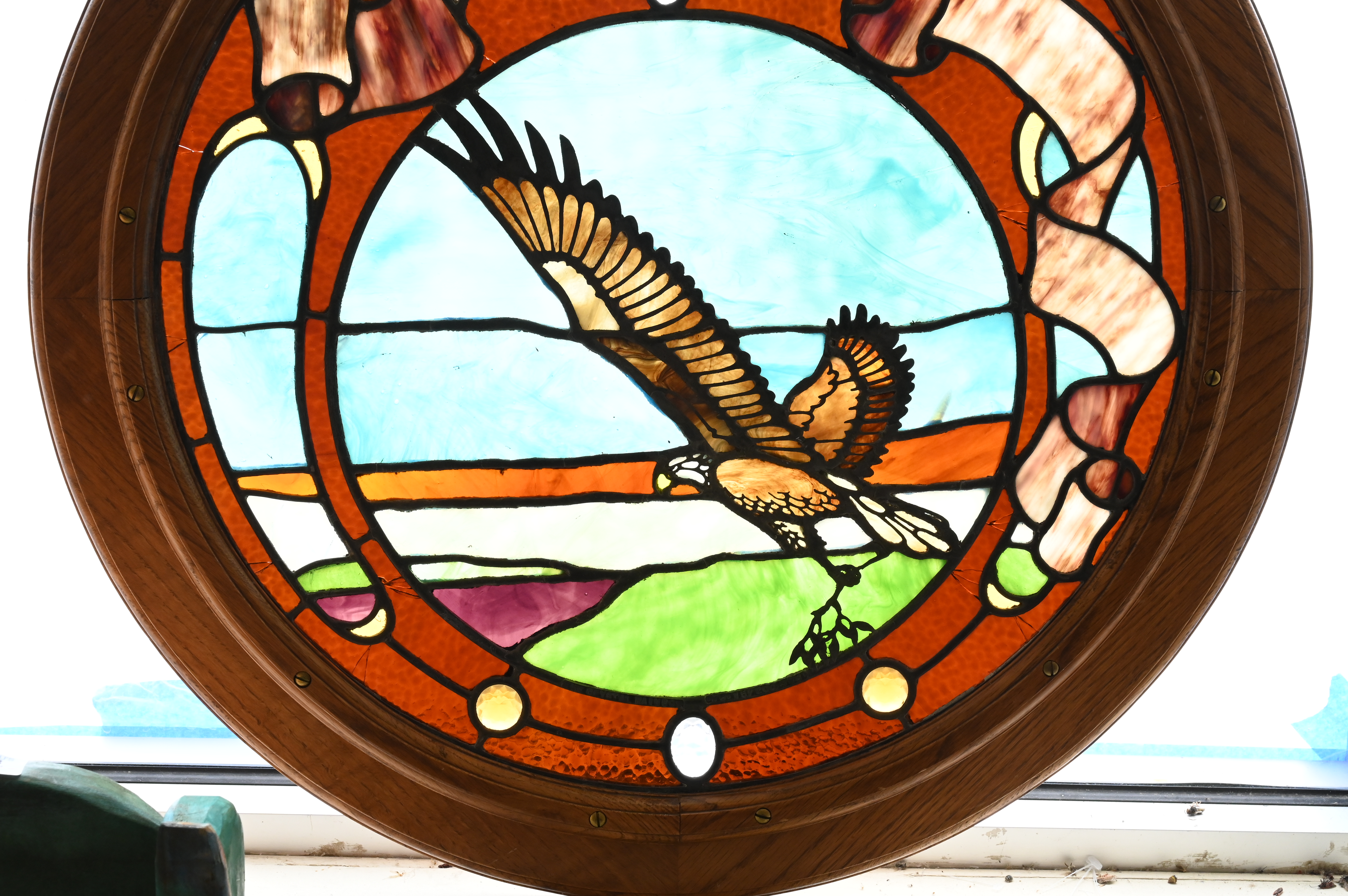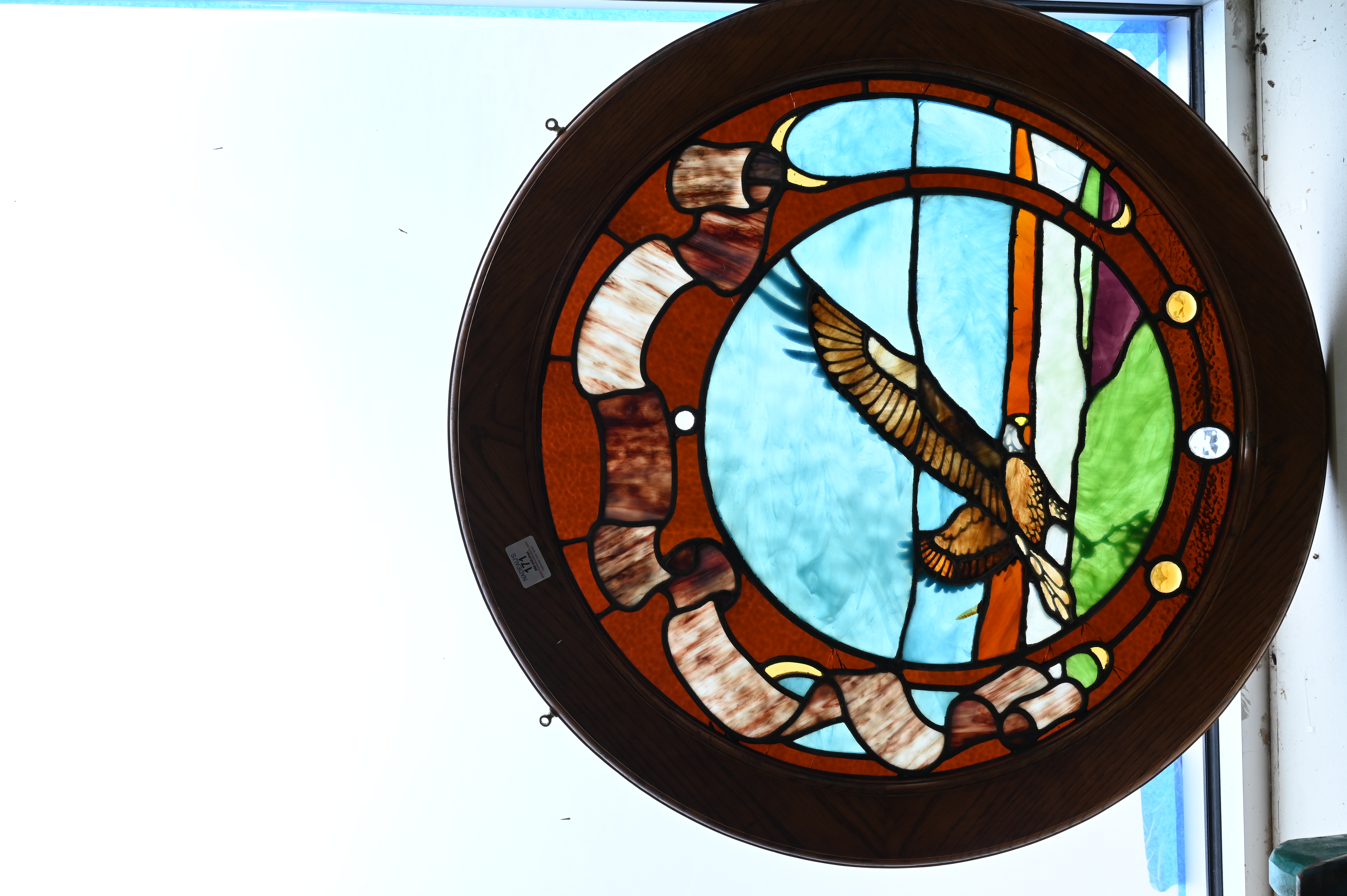 Round Leaded and Wooden Slag/Stained Glass Bald Eagle Window, “The Crystal Rainbow” stamped into lead, “a76.15/200.778”, one broken glass, diameter 30 inches.