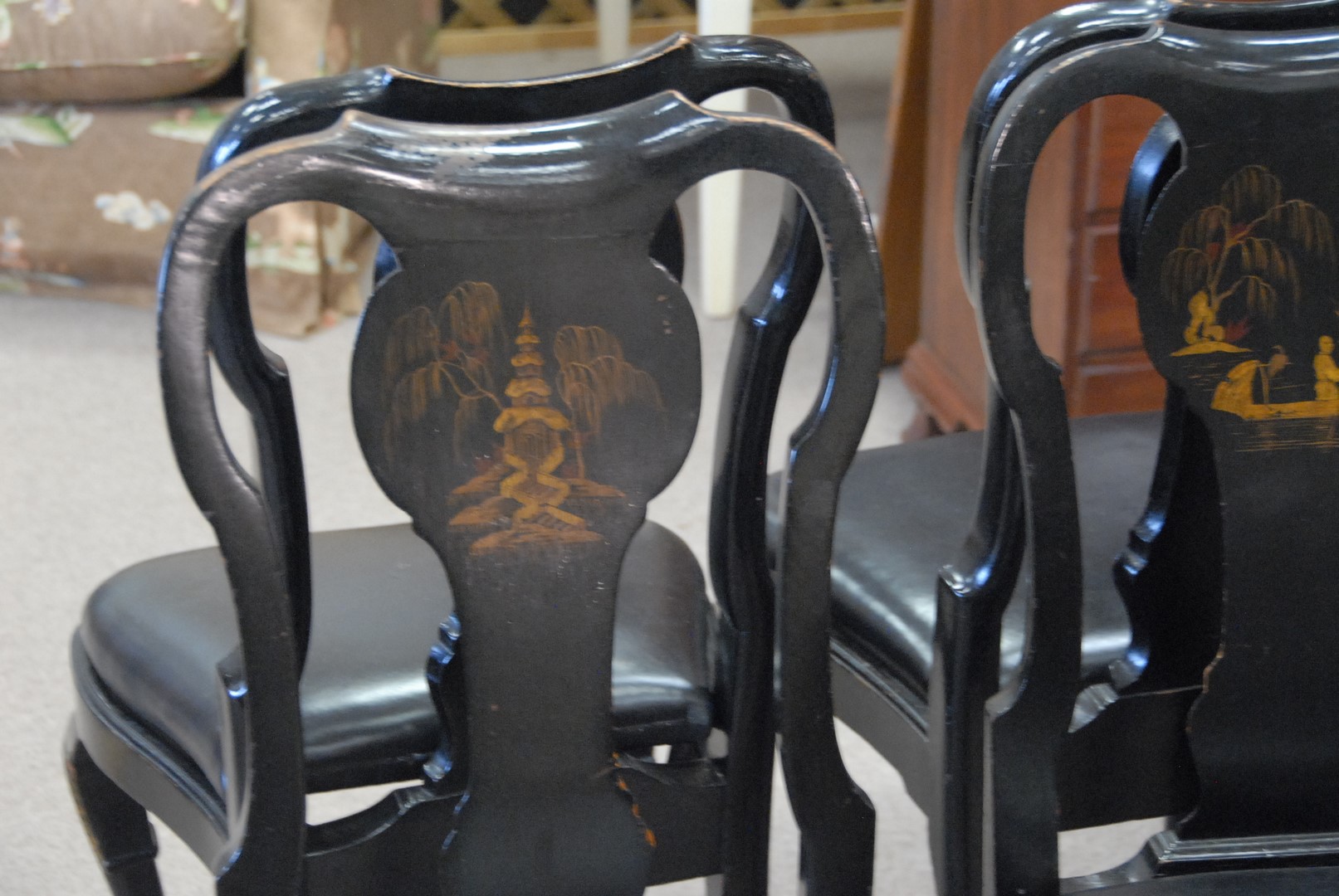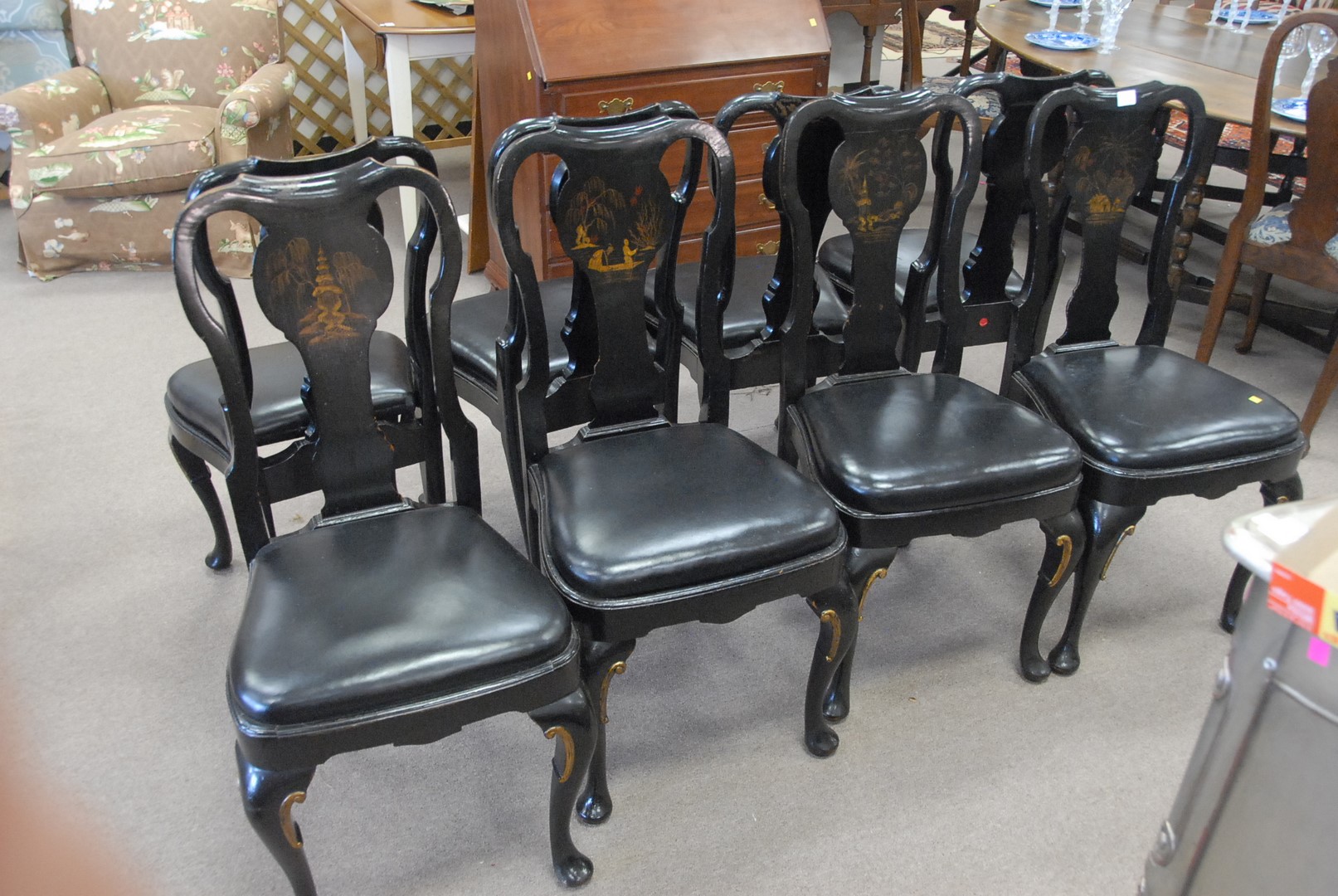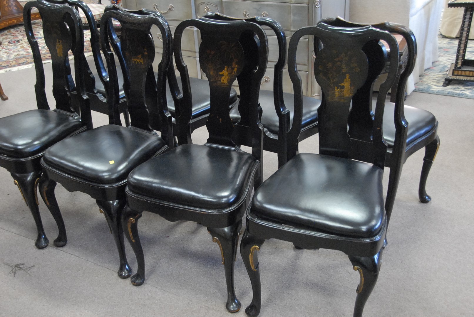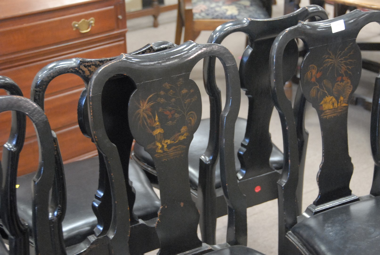 Lot 171: Set of eight oak Queen Anne style dining chairs, chinoiserie decorated with leather upholstered slip seats some paint loss.