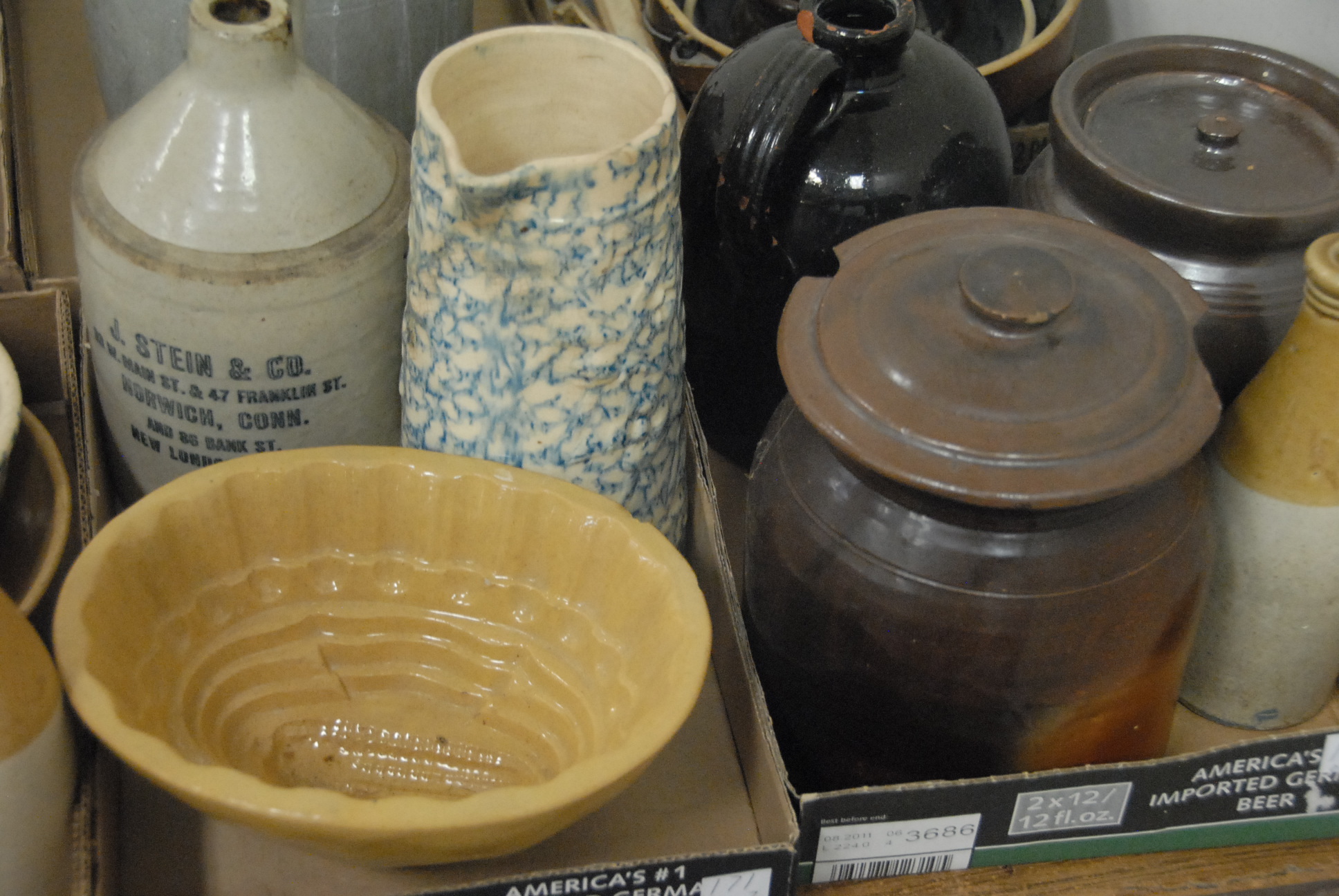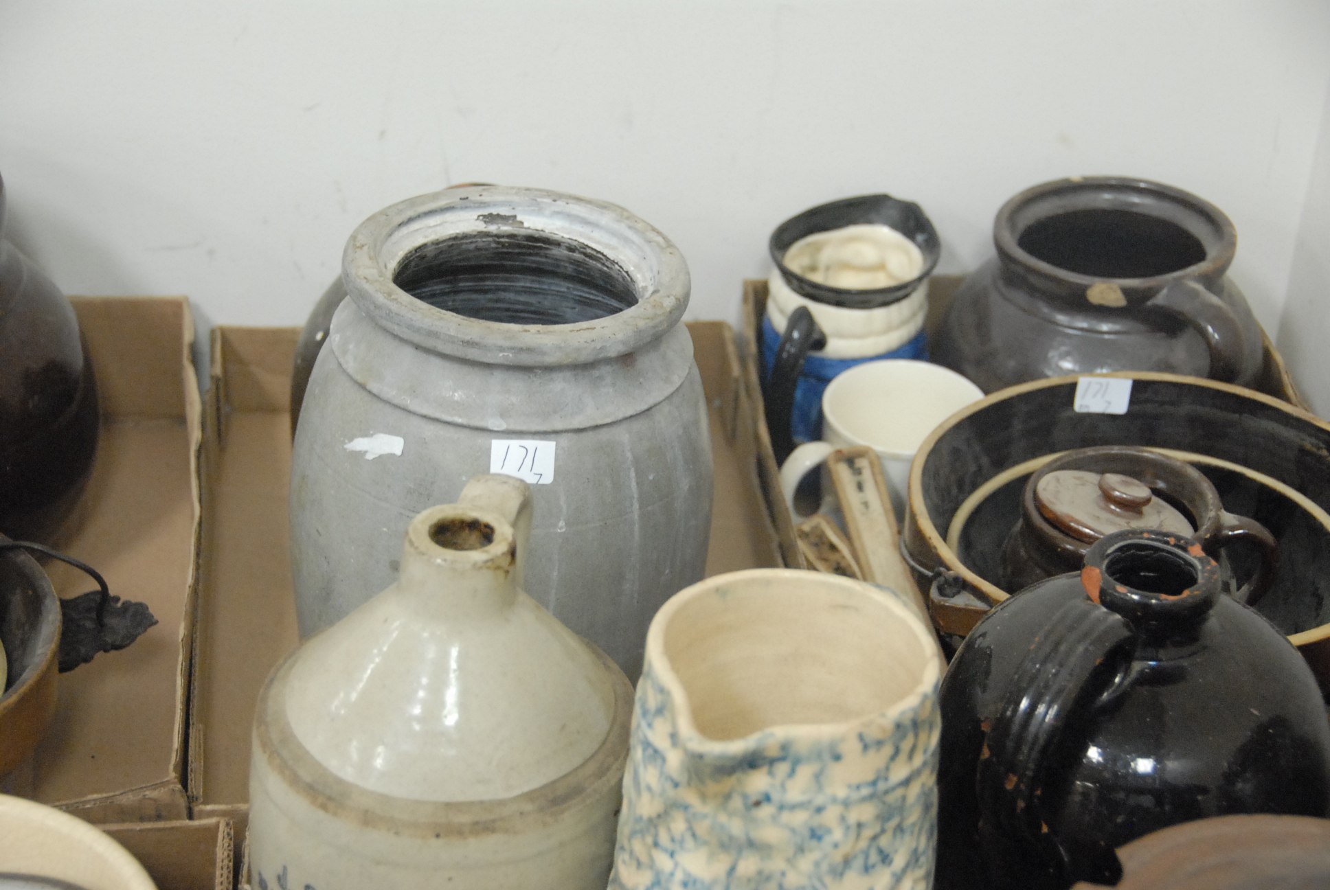 Seven box lots of various stoneware and brownware including jugs and crocks, pitcher, bowls, bottles, and misc.