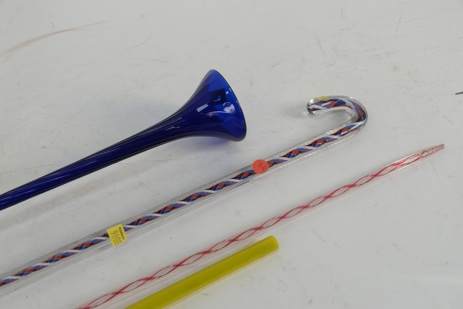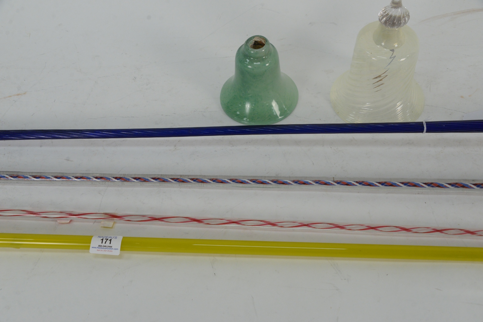 Lot 171: Six Piece English Glass Group, to include two nailsea canes with twist design one nailsea walking stick one blue blown glass coach horn, circa 1810 – 1850 tallest height 51 inches along with two nailsea glass bells, 19th century.
