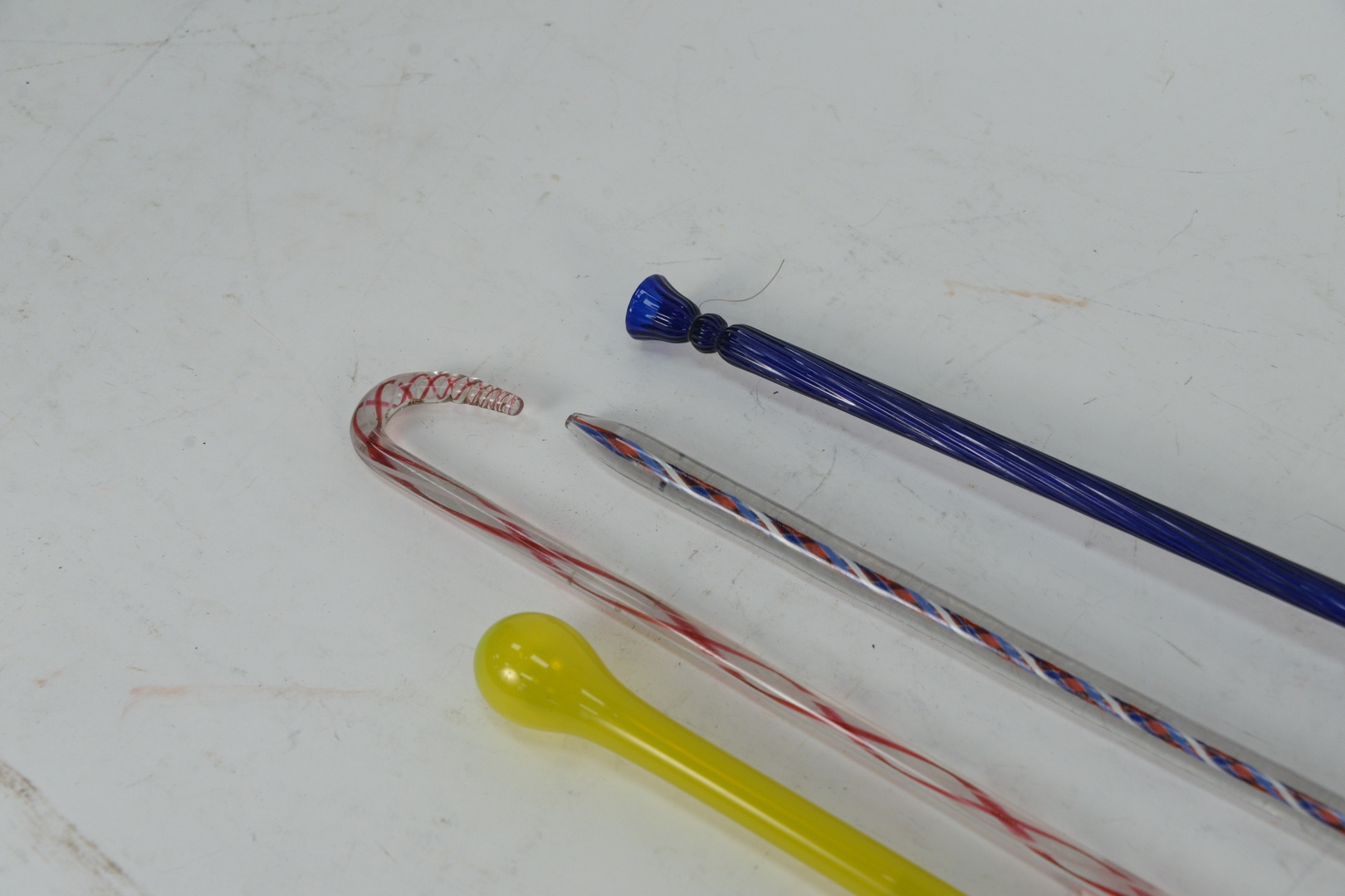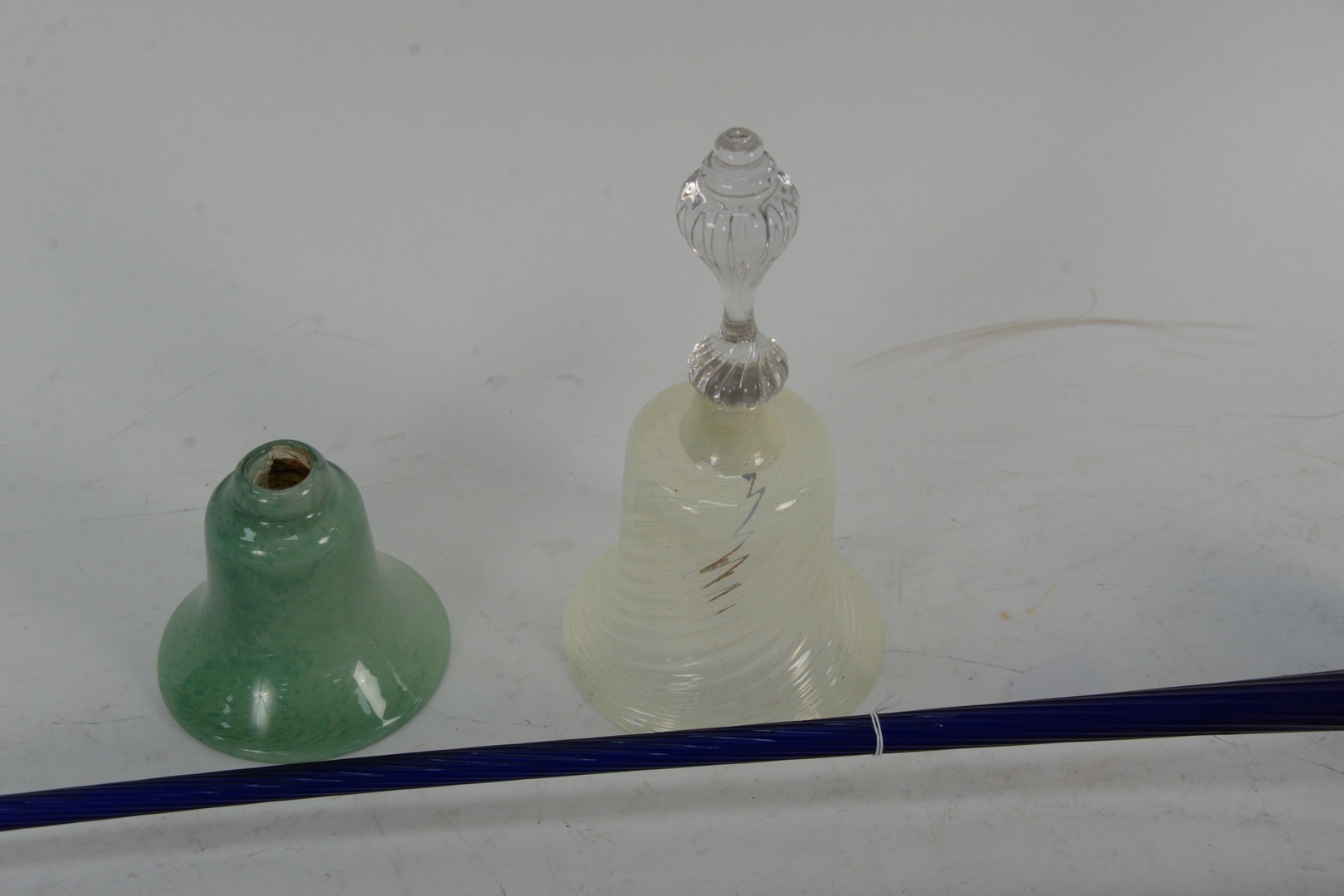 Six Piece English Glass Group, to include two nailsea canes with twist design one nailsea walking stick one blue blown glass coach horn, circa 1810 – 1850 tallest height 51 inches along with two nailsea glass bells, 19th century.