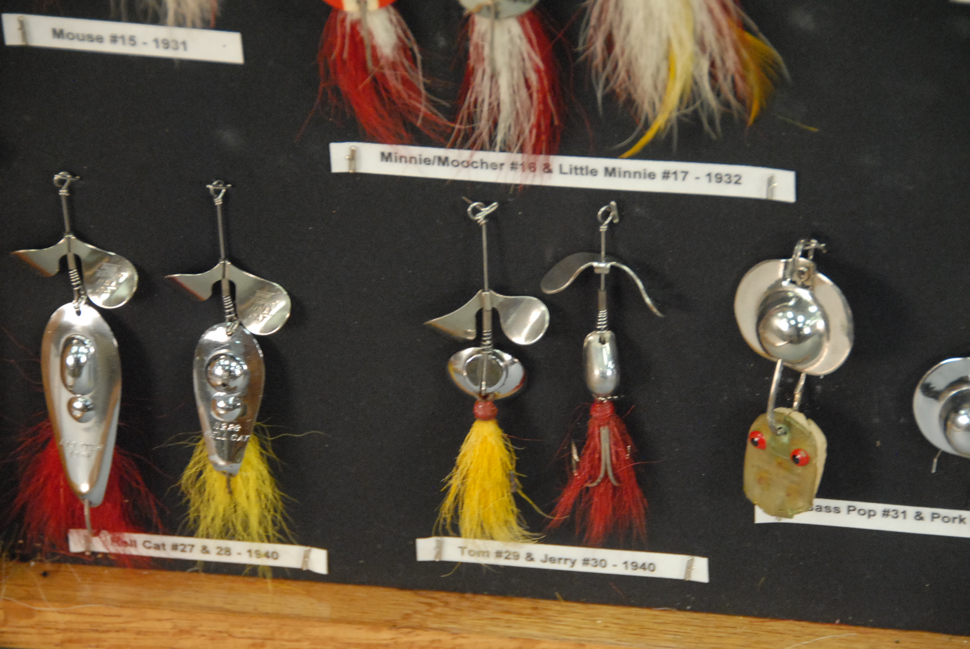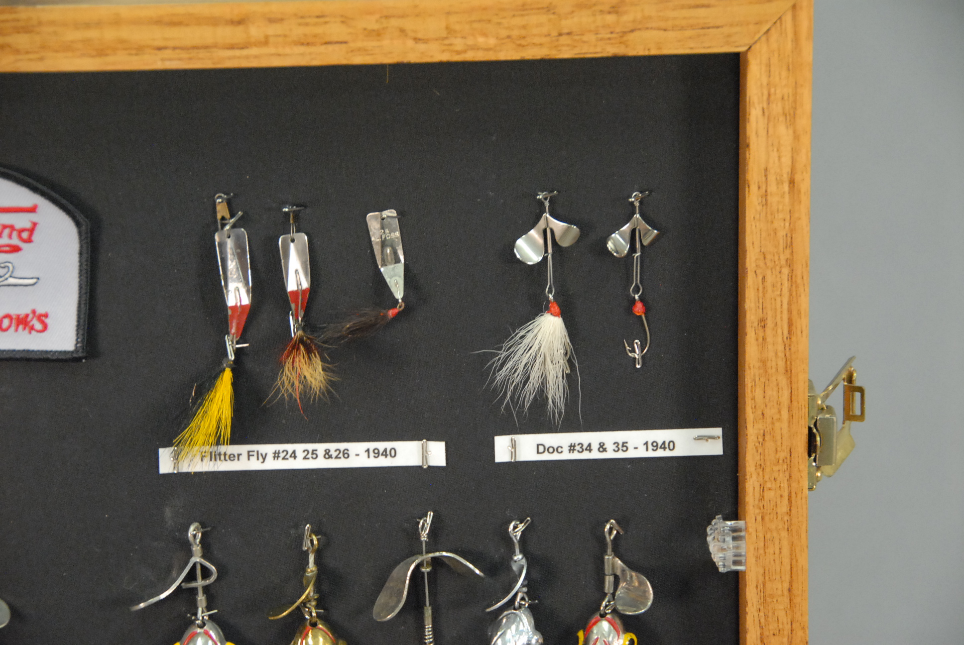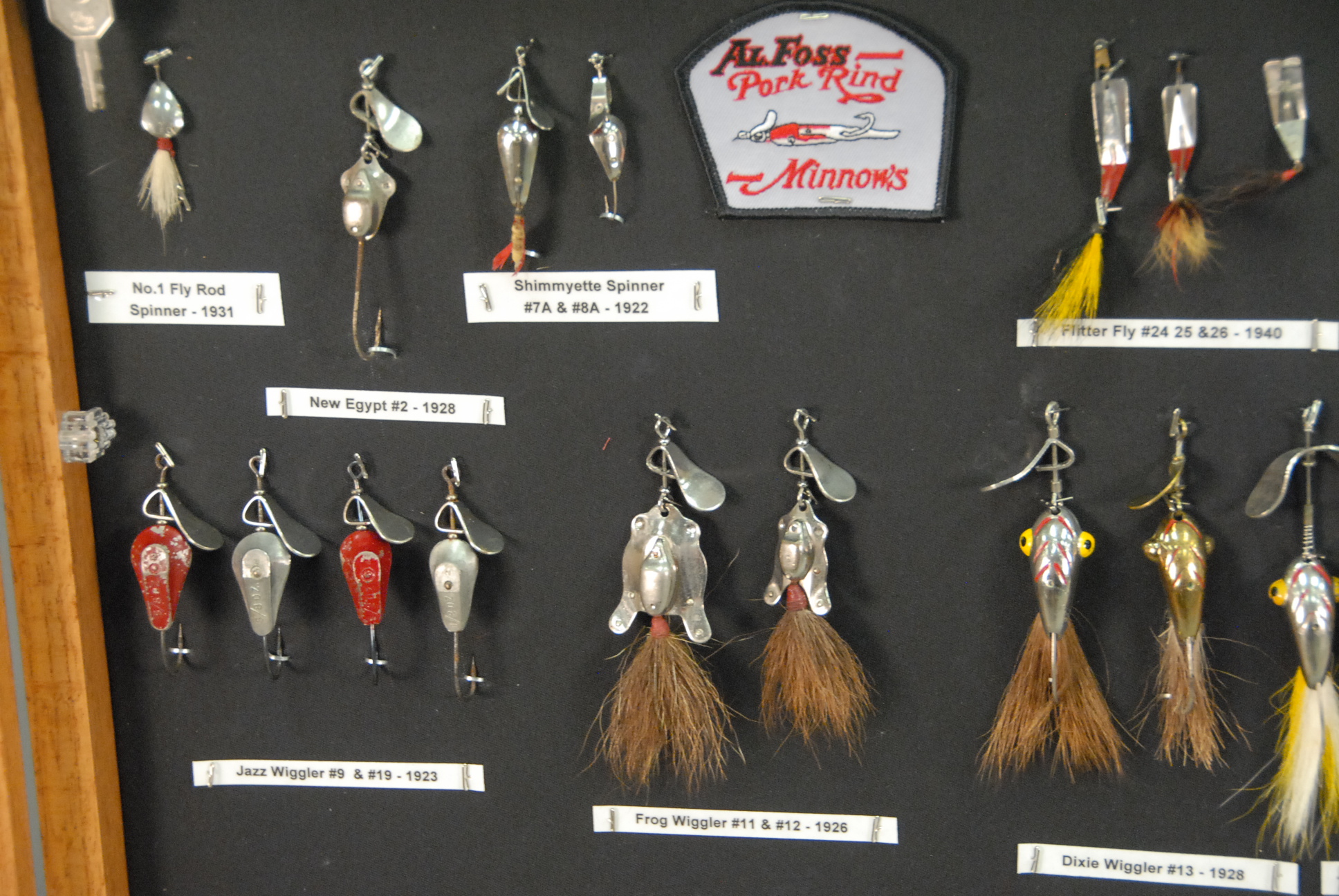 Thirty-seven Al Foss pork rind minnows and lure collection to include two Minnie Moocher #16, two Little Minnie #17, one Fly Rod Spinner 1931, one New Egypt #2 1928, two Shimmyette Spinner #7A & 8A 1922, three Flitter Fly #24, #25, & #26, two Doc #34 & #35 1940, four Jazz Wiggler #9 & #19, two Frog Wiggler #11 & #12, five Dixie Wiggler #13 & #14, two Mouse #15, two Fan Dancer #18, two Sheik #19 & #20, two Hell Cat #27 & #28, two Tom & Jerry, two Bass Pop and Porkchunk, and one Shimmy Spoon.