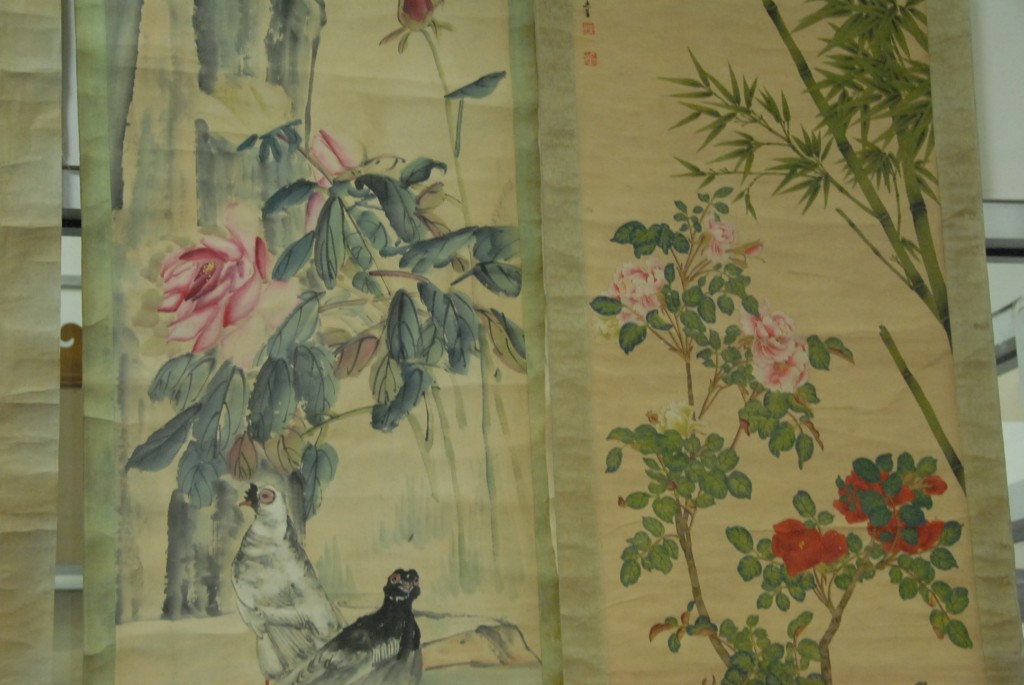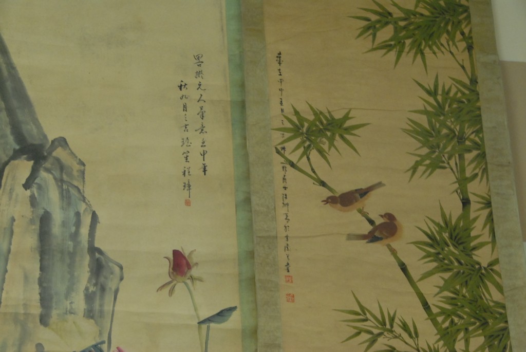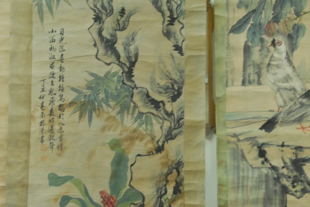 Three Oriental scrolls watercolors on paper having birds with blossoming flowering trees, 66 x 18, 68 x 18, 67 x 18.