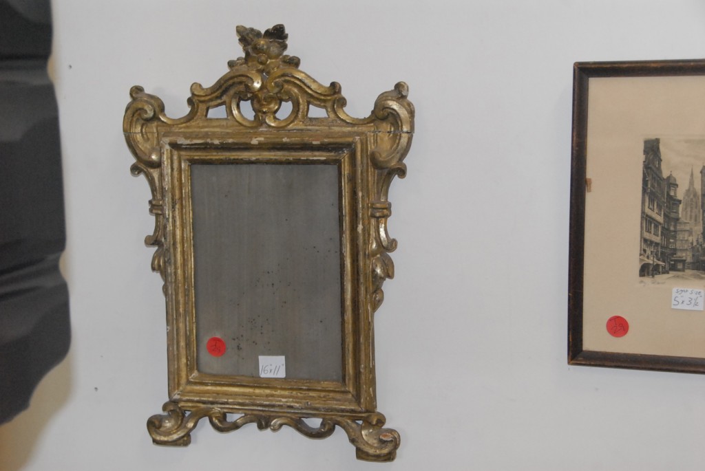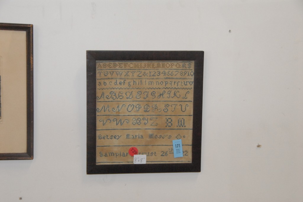 Three piece group early Continental mirror, pencil signed print, and small sampler.