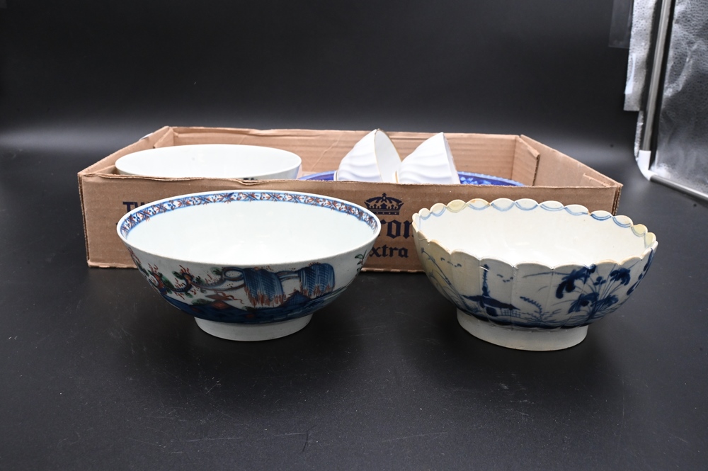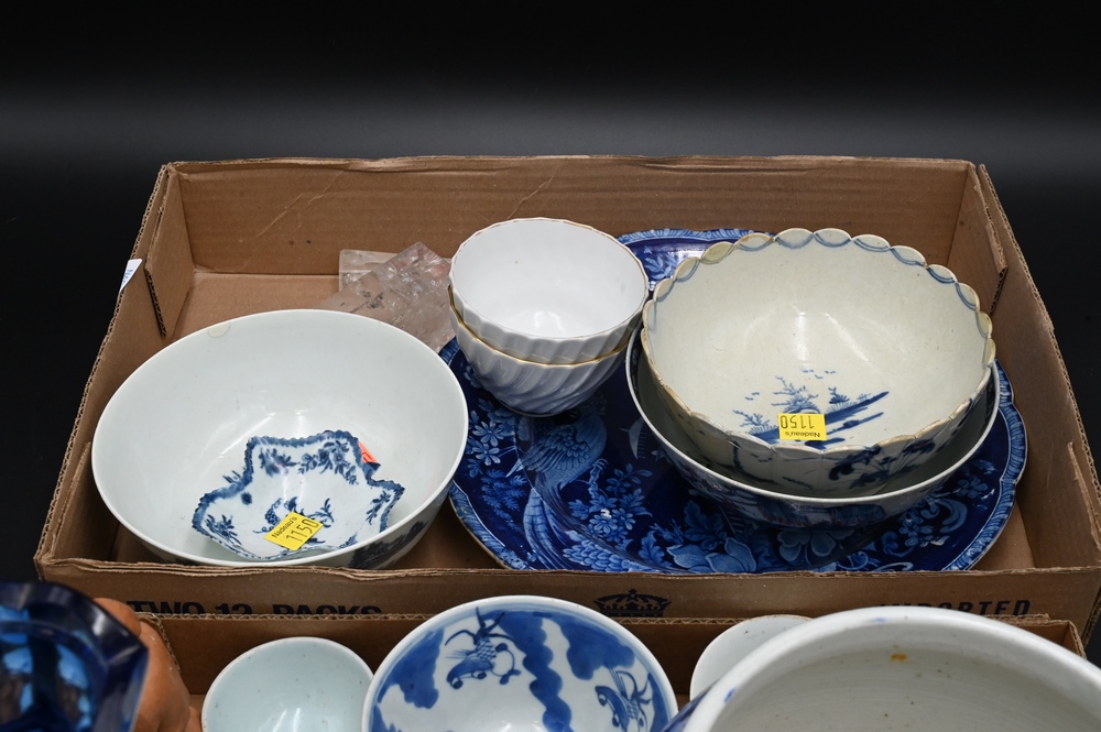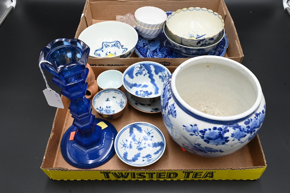 Lot 171: Two Tray Lots of Porcelain and Ceramic Items, to include Chinese porcelain vase, cups and saucers; Worcester bowl with painted Asian scene; Liverpool bowl; Staffordshire; along with a blue glass candlestick. Provenance: Estate of Wallace Bradway, New Haven, CT