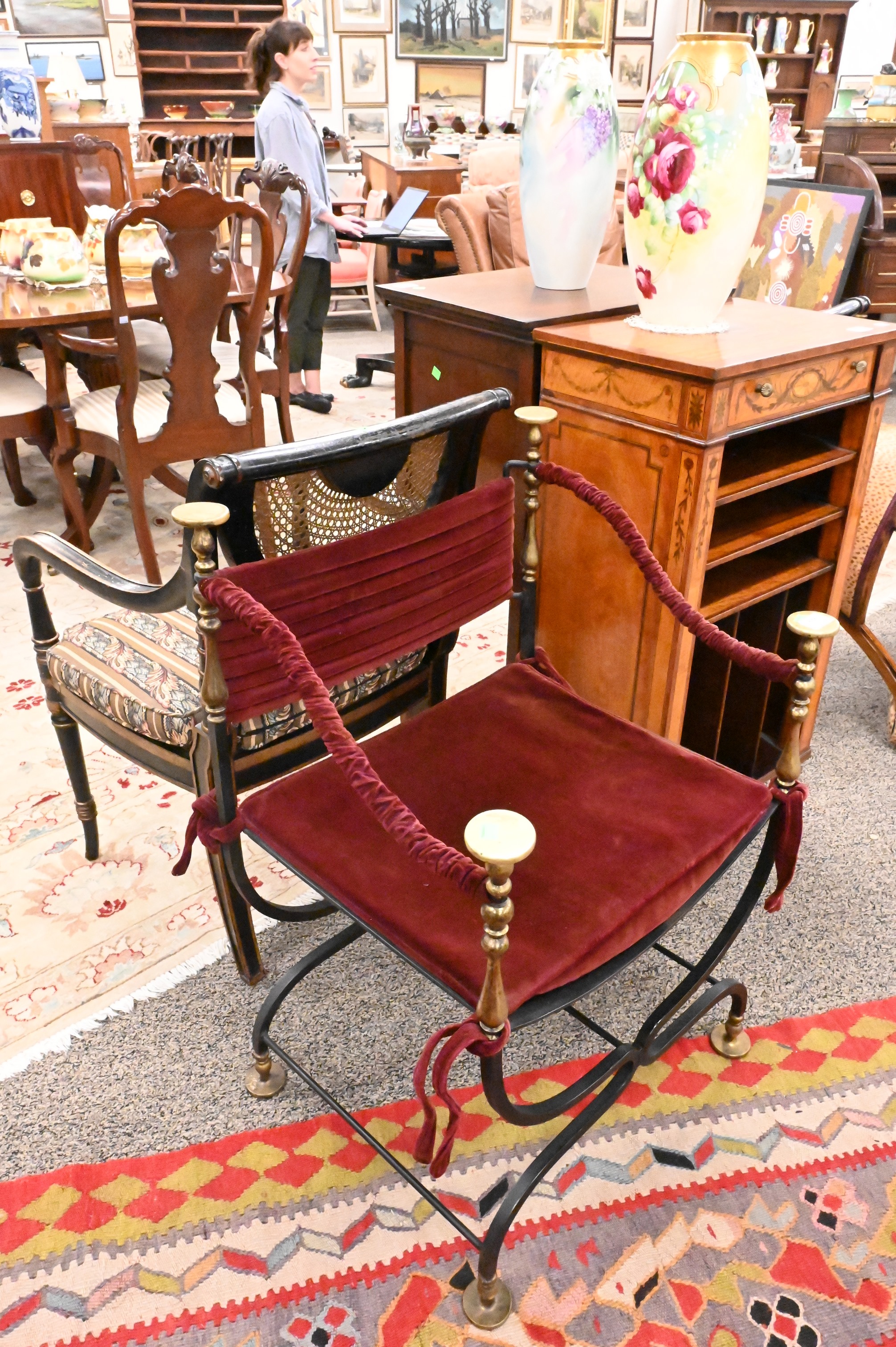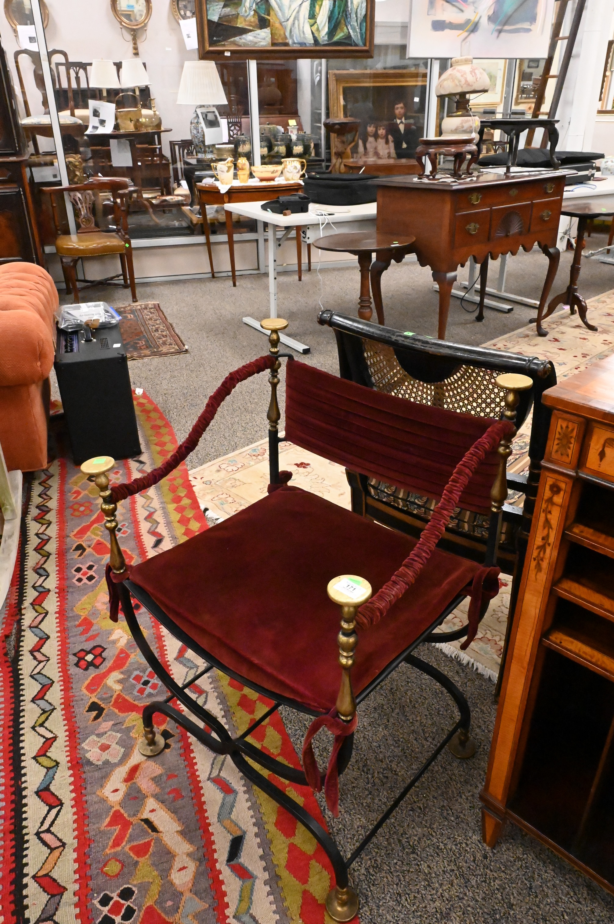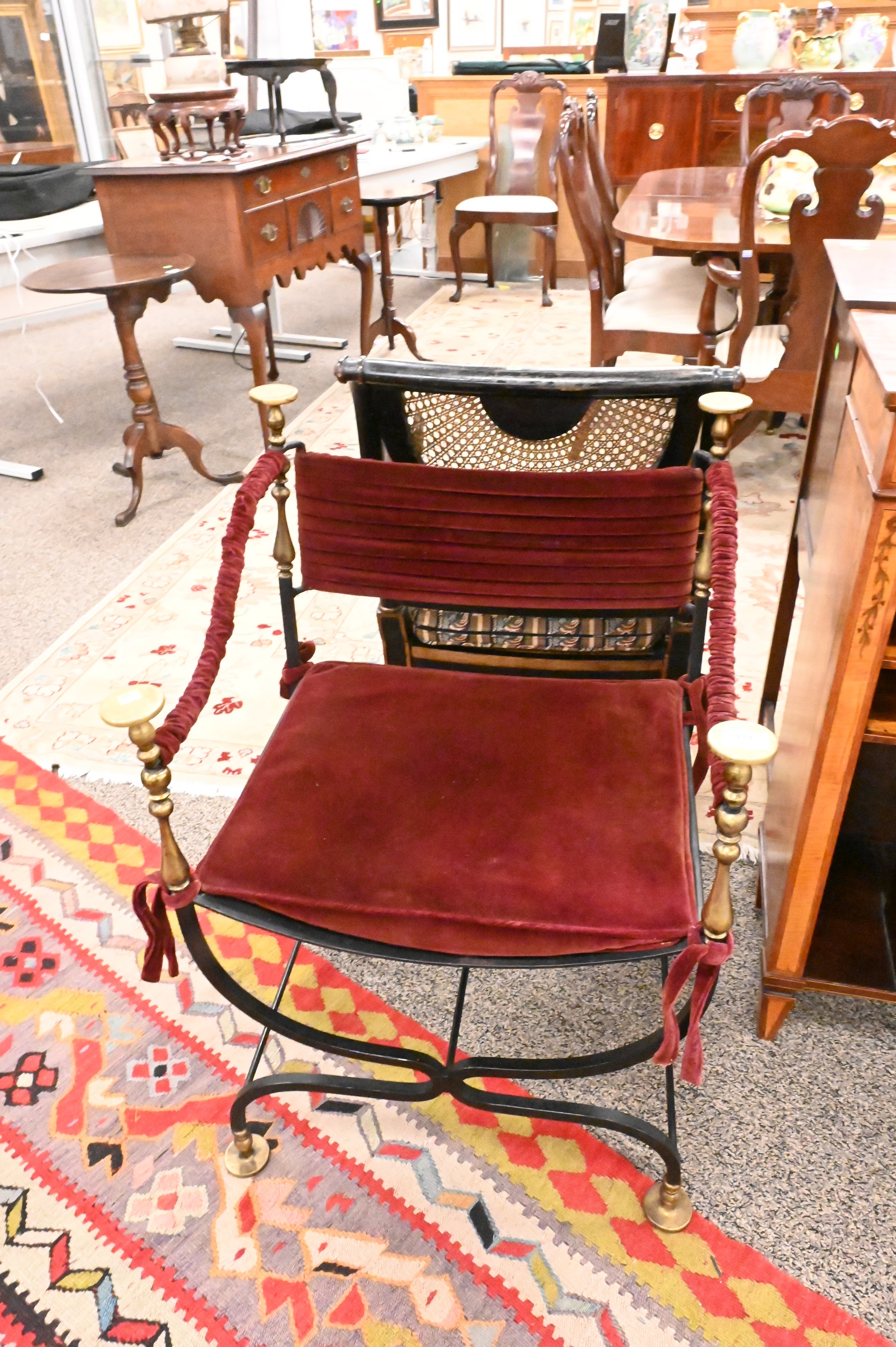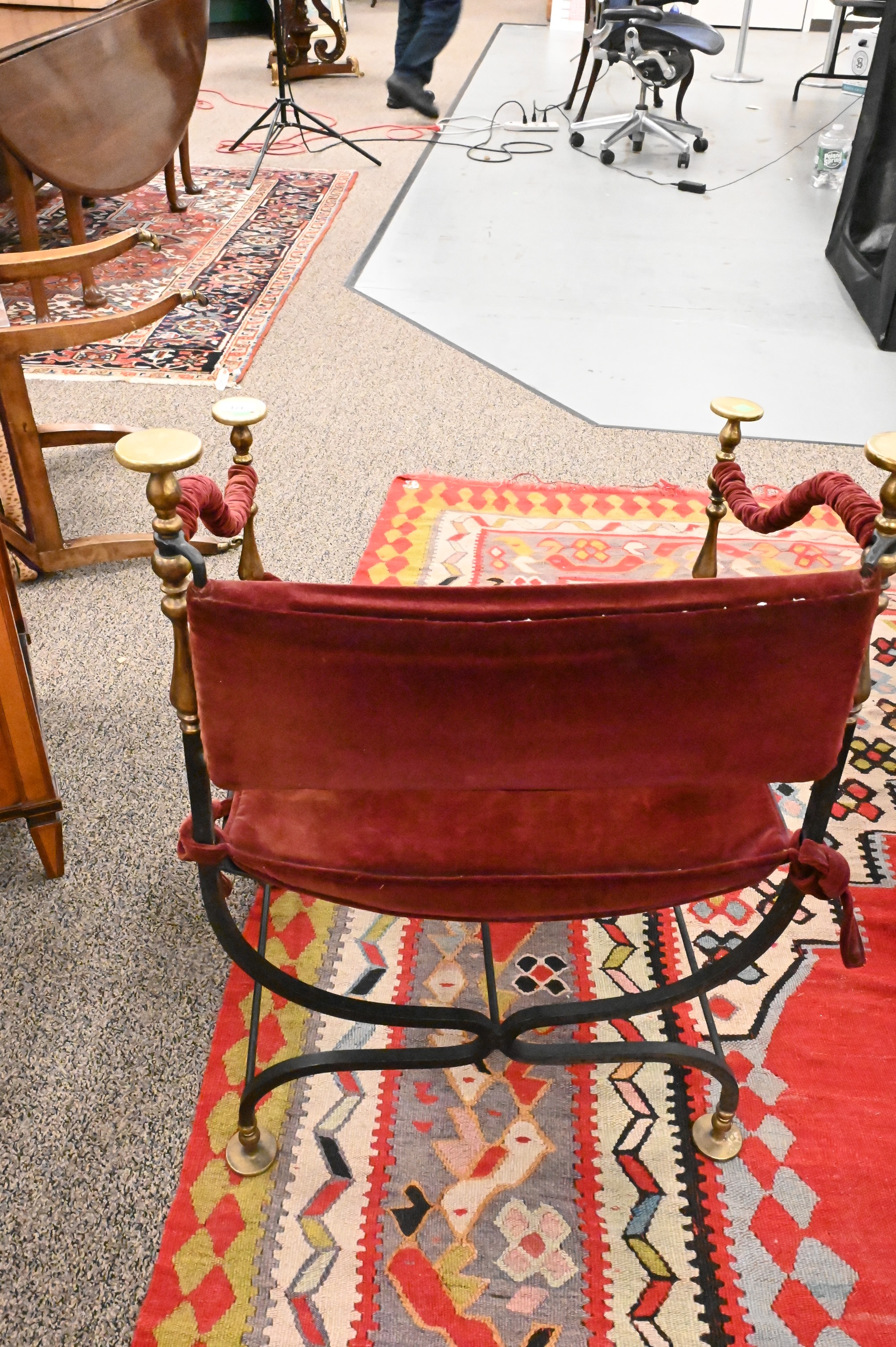 Wrought Iron and Brass Savonarola Chair, having velvet upholstery, seat height 17 inches, total height 34 1/2 inches, width 24 inches.