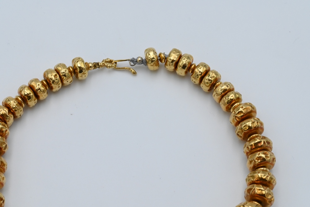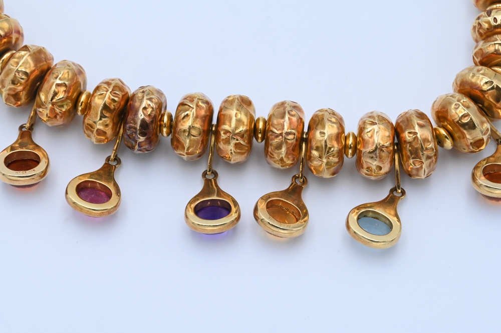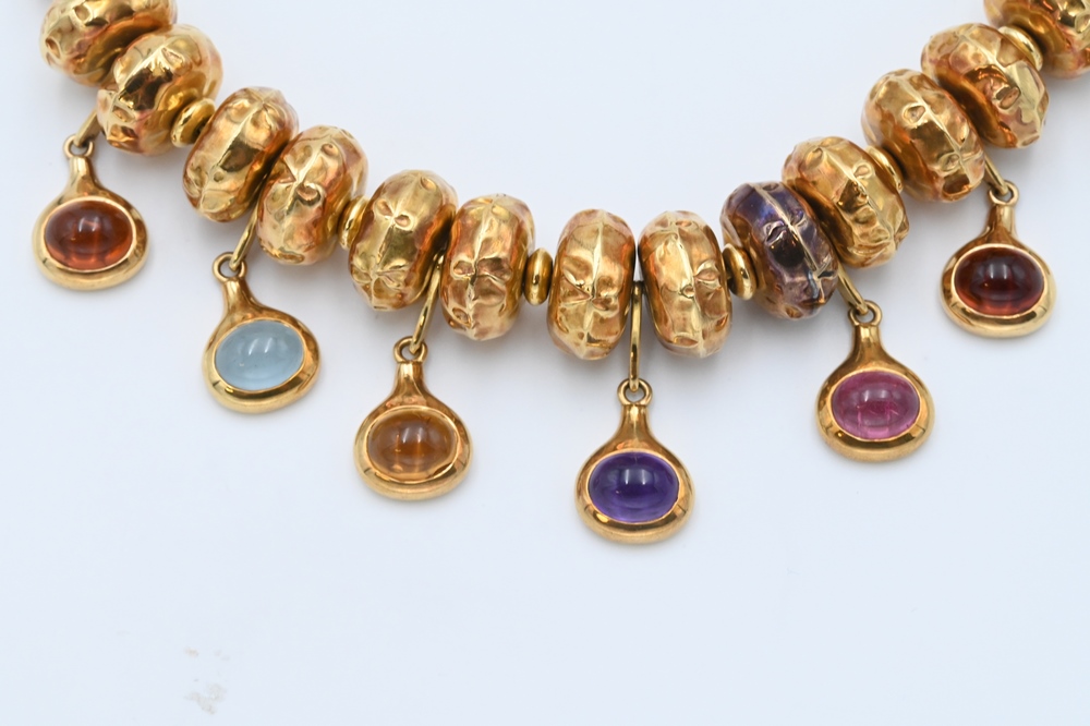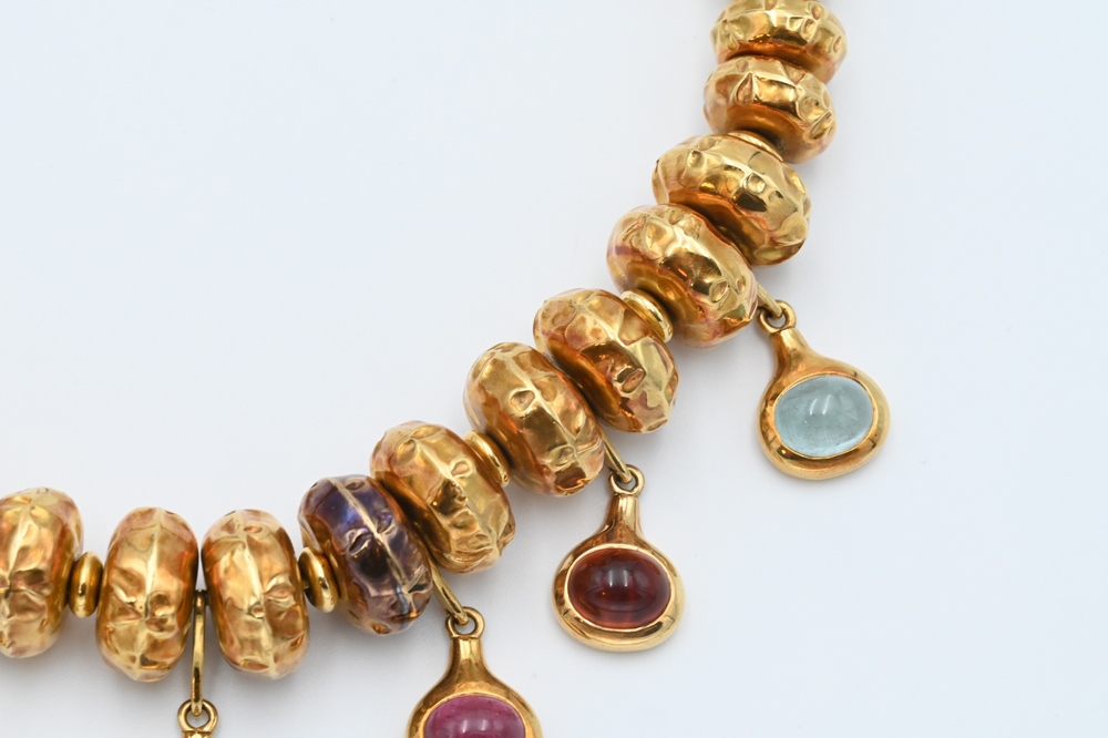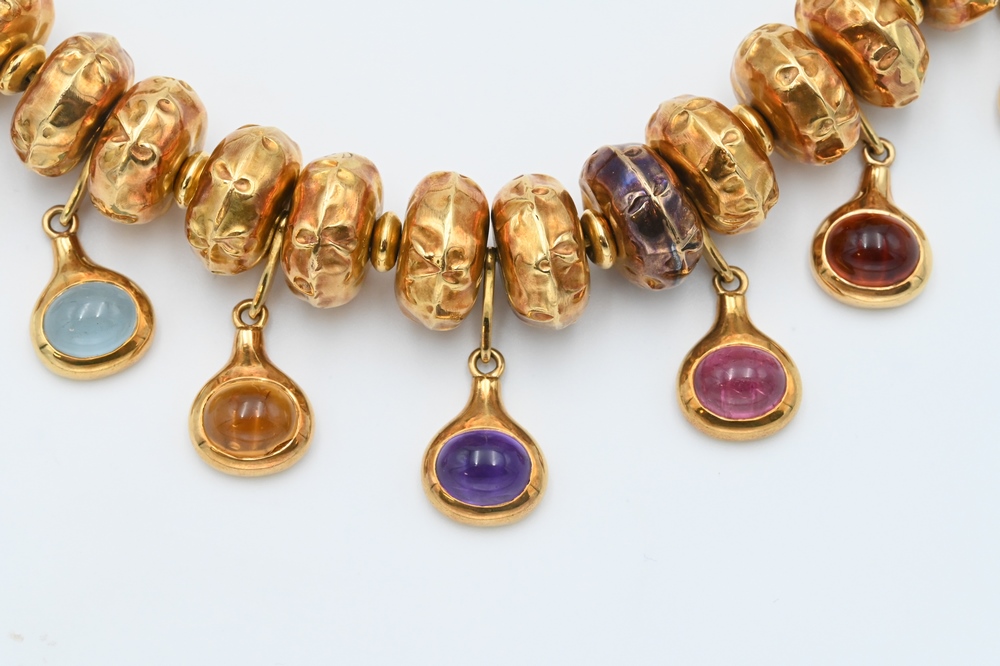 Lot 172: 18 Karat Gold Bead Necklace, having suppressed round beads along with seven hanging oval cabochon cut stones, length 14 1/2 inches, …