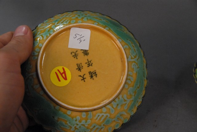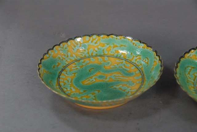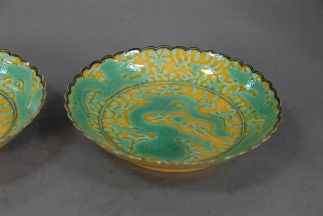 A pair of GuangXu mark yellow dishes with green dragon design