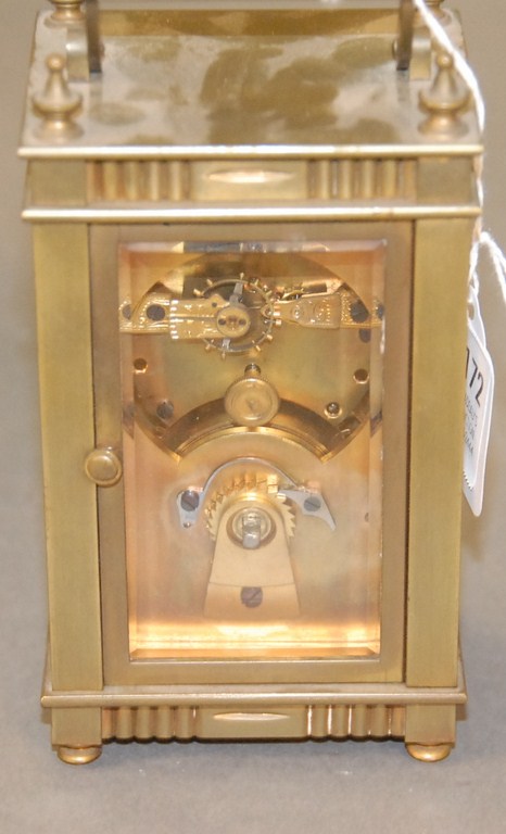 Lot 172: Boston Clock Company brass and glass carriage clock, ht. 5 3/4 chips in three corners of porcelain dial.