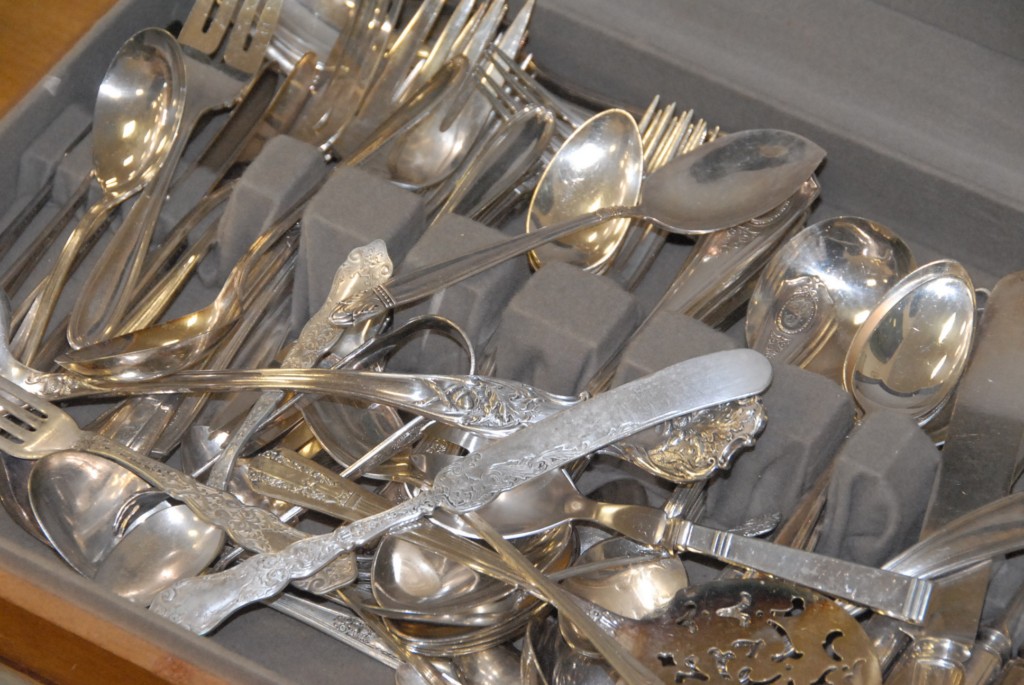Box of silverplated flatware and ladle.