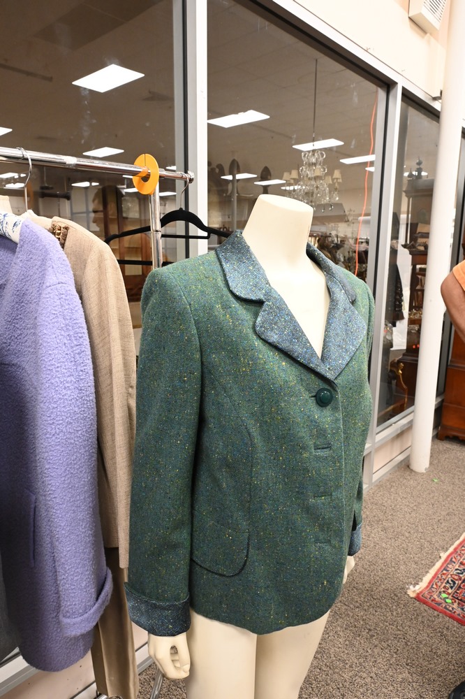 Eight Piece Lot by Italian Designer Juanita Sabbadini, to include a baby blue coat; lavender jacket; purple wool blend jacket; grey suit, jacket and pants; green tweed blazer; along with a tan suit with beaded neckline; size M/L; excellent condition, minimal wear.
