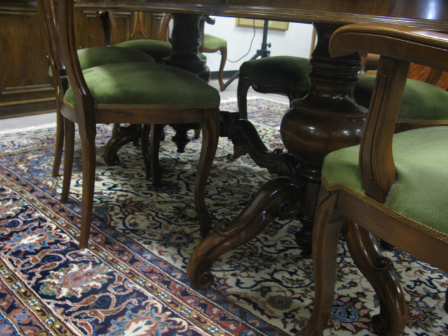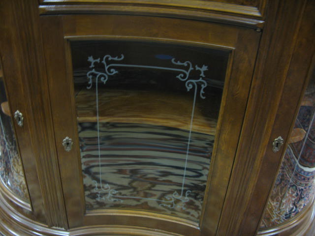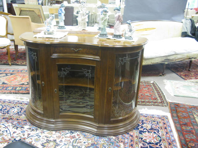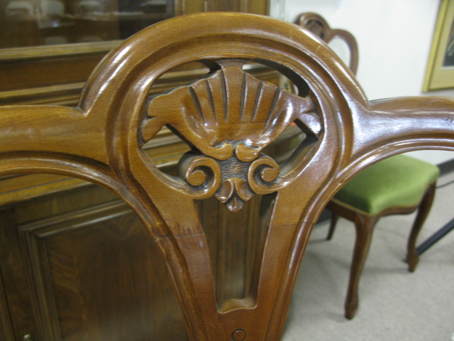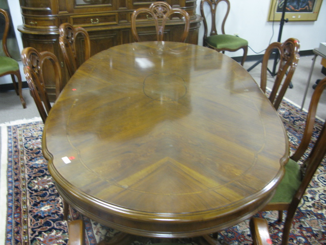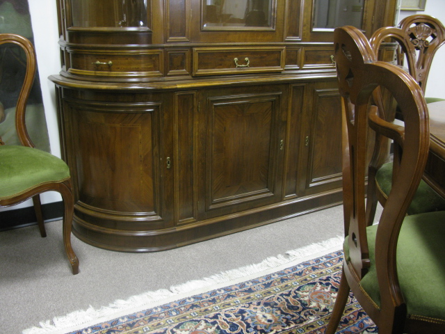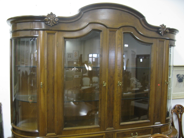 Eleven piece French style dining room set to include breakfront, eight Louis XV chairs, an oval inlaid table and a curio bowed glass server