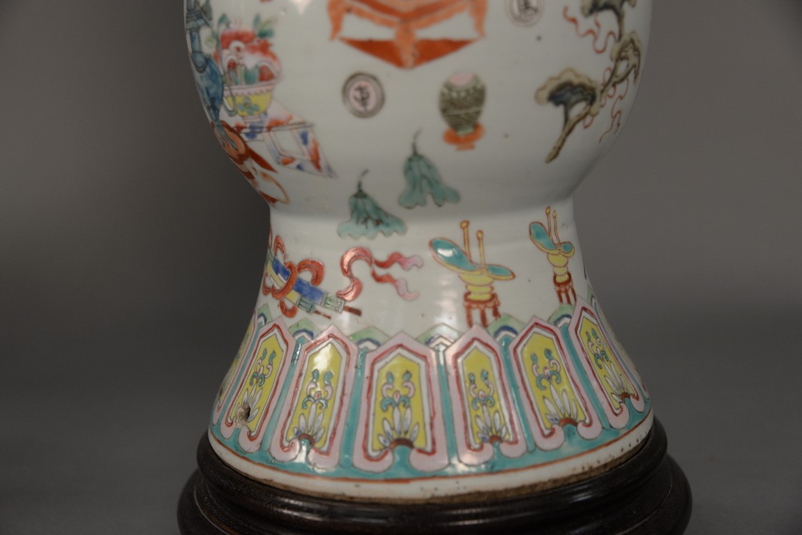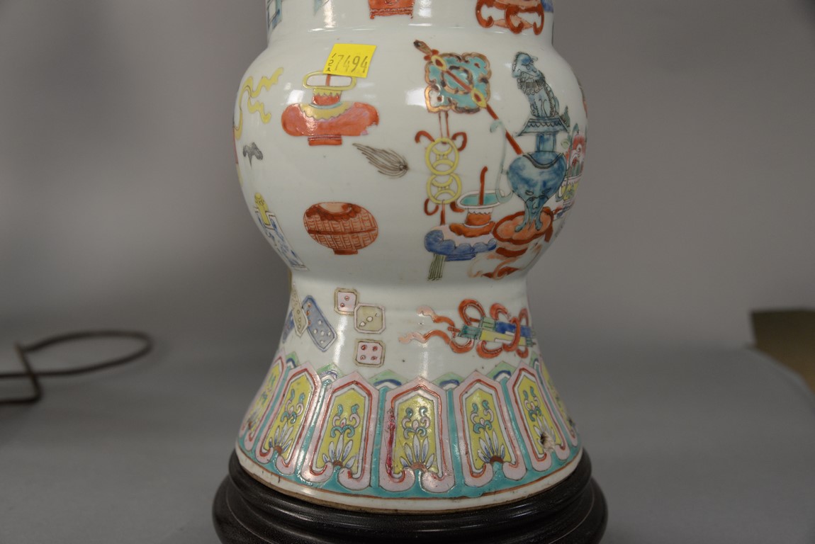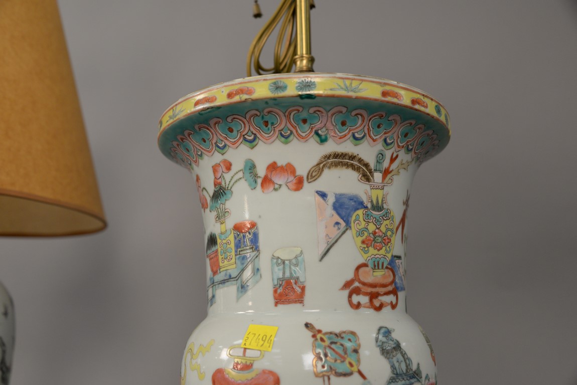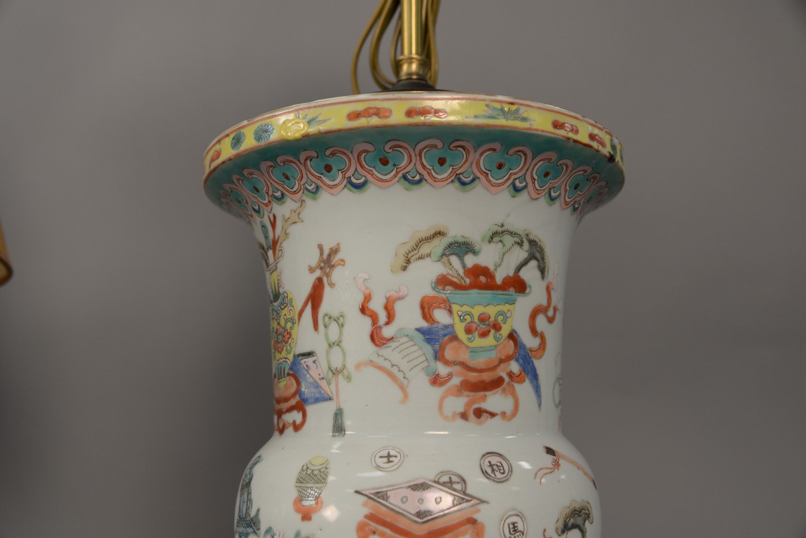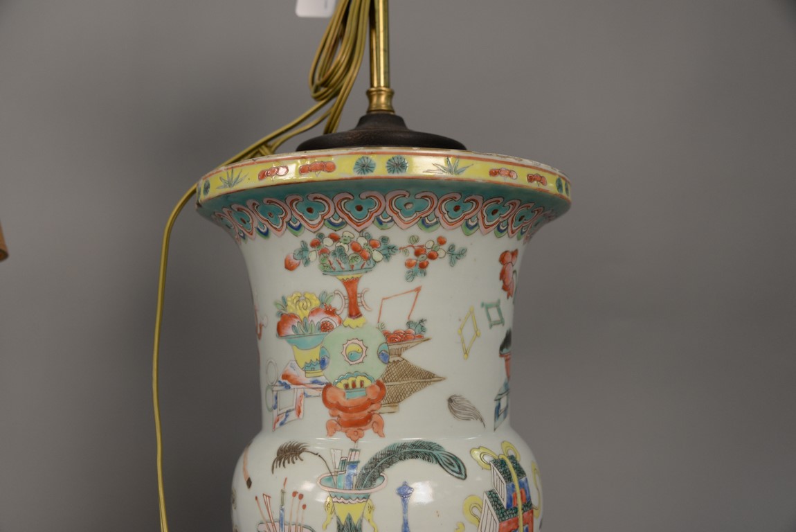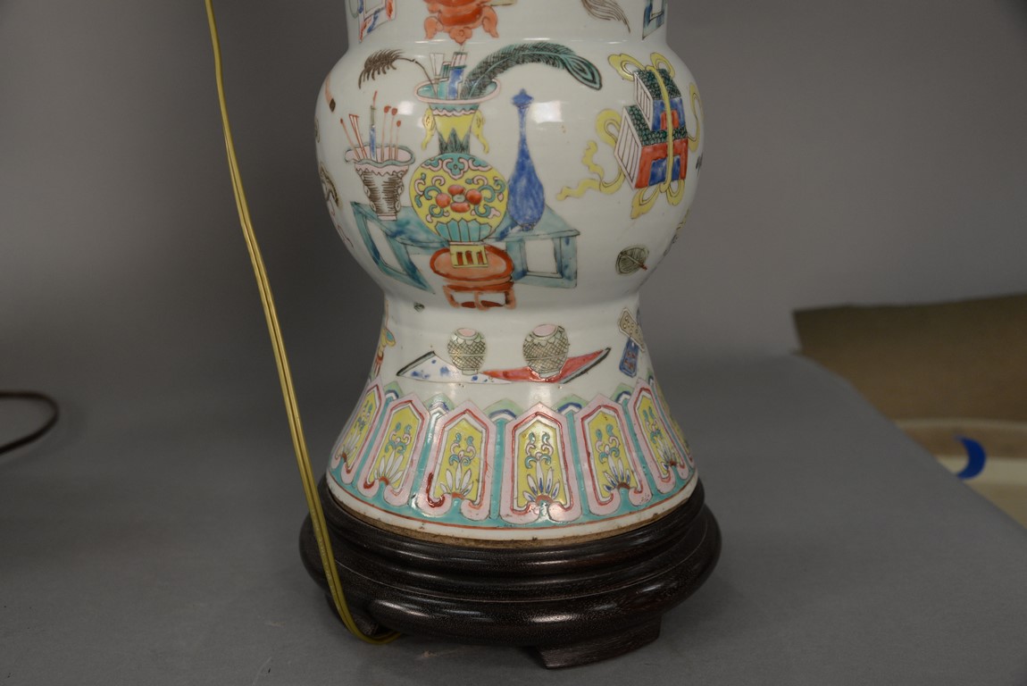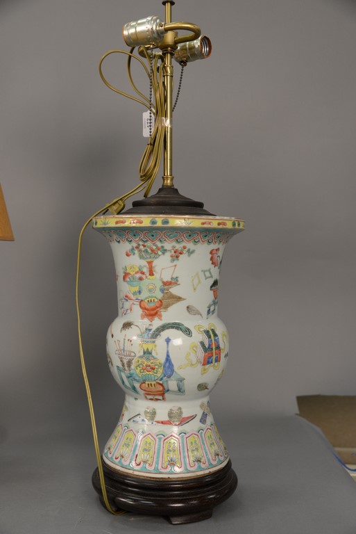 Lot 172: Famille Rose vase with painted scholar objects and vases of flowers, made into a table lamp, 19th century rim chips. vase ht. 14 in. total ht. 31 1/2 in.