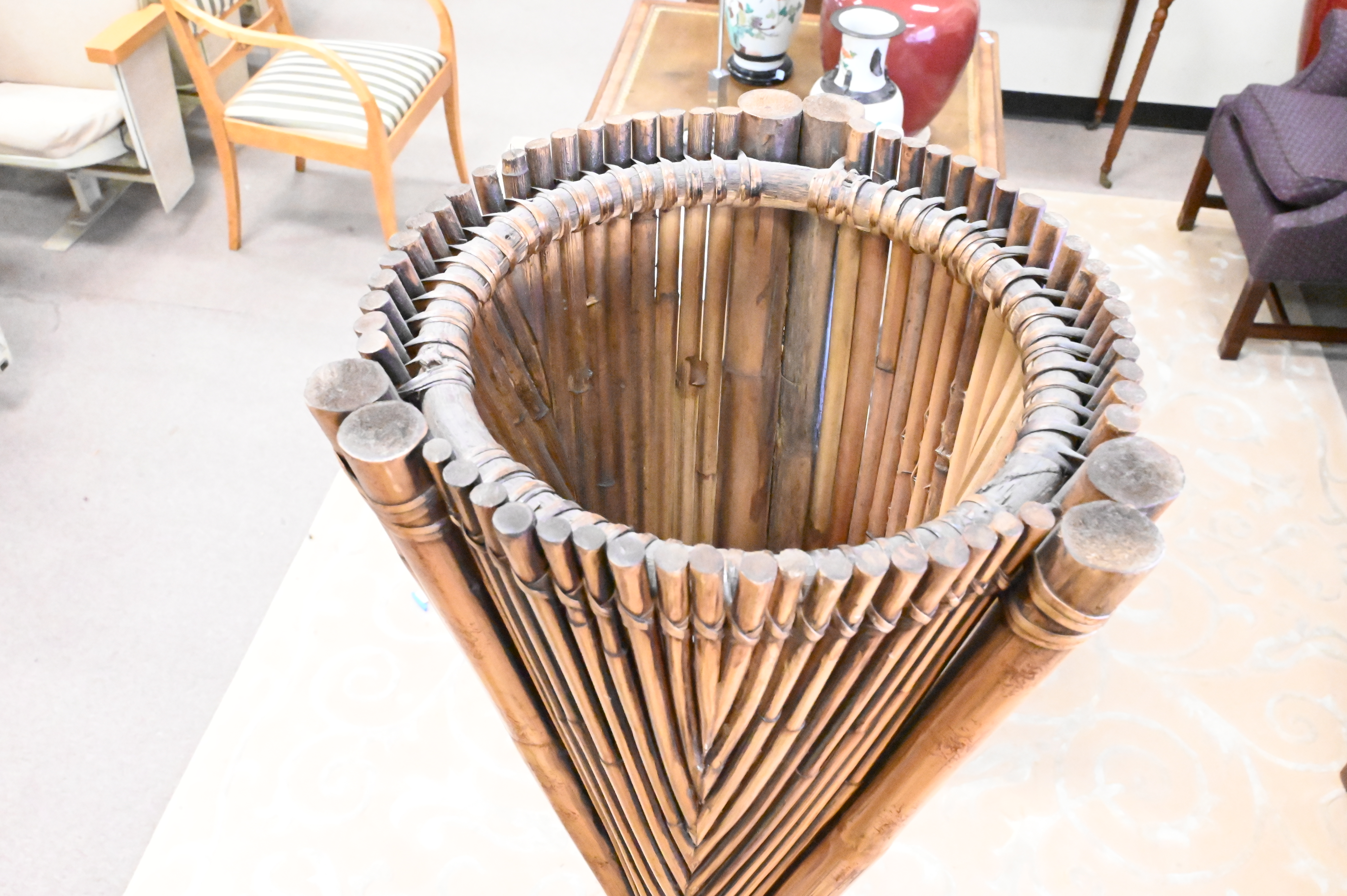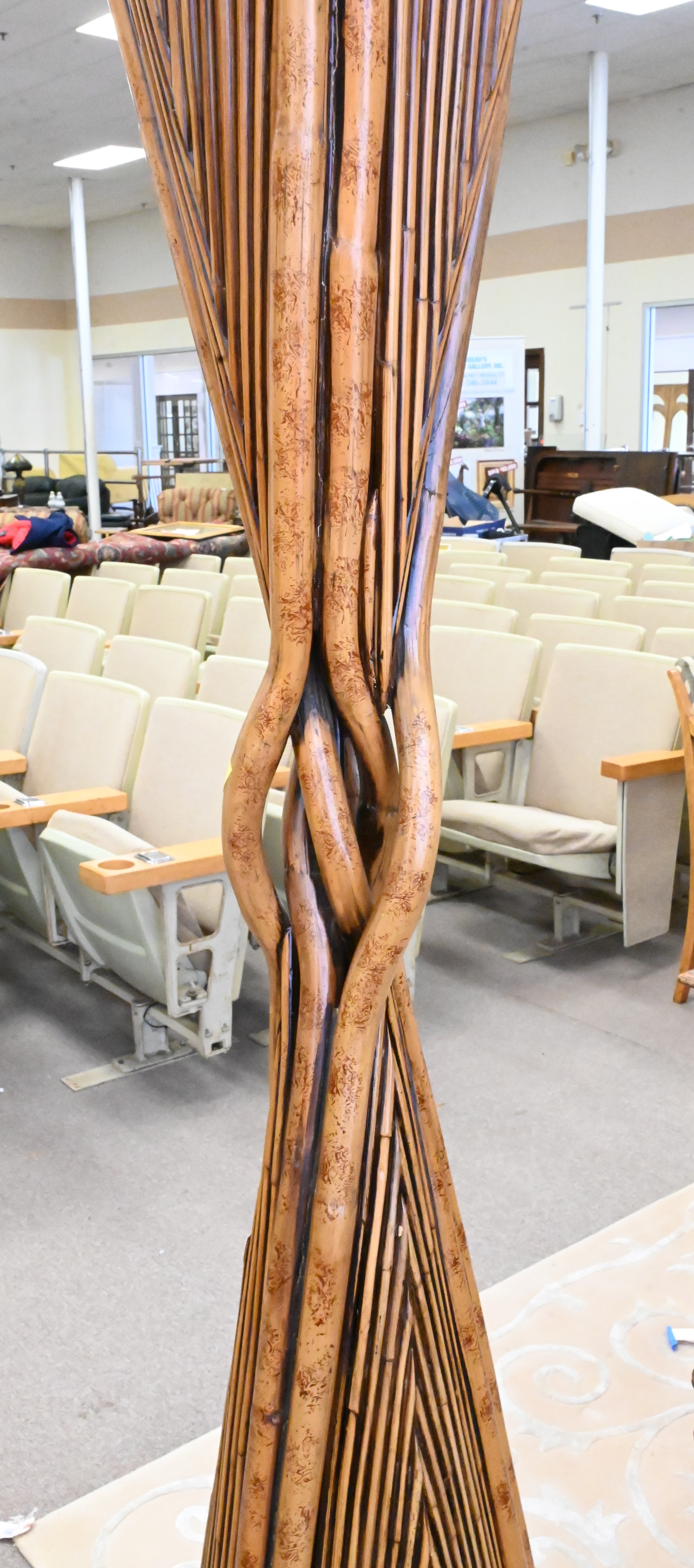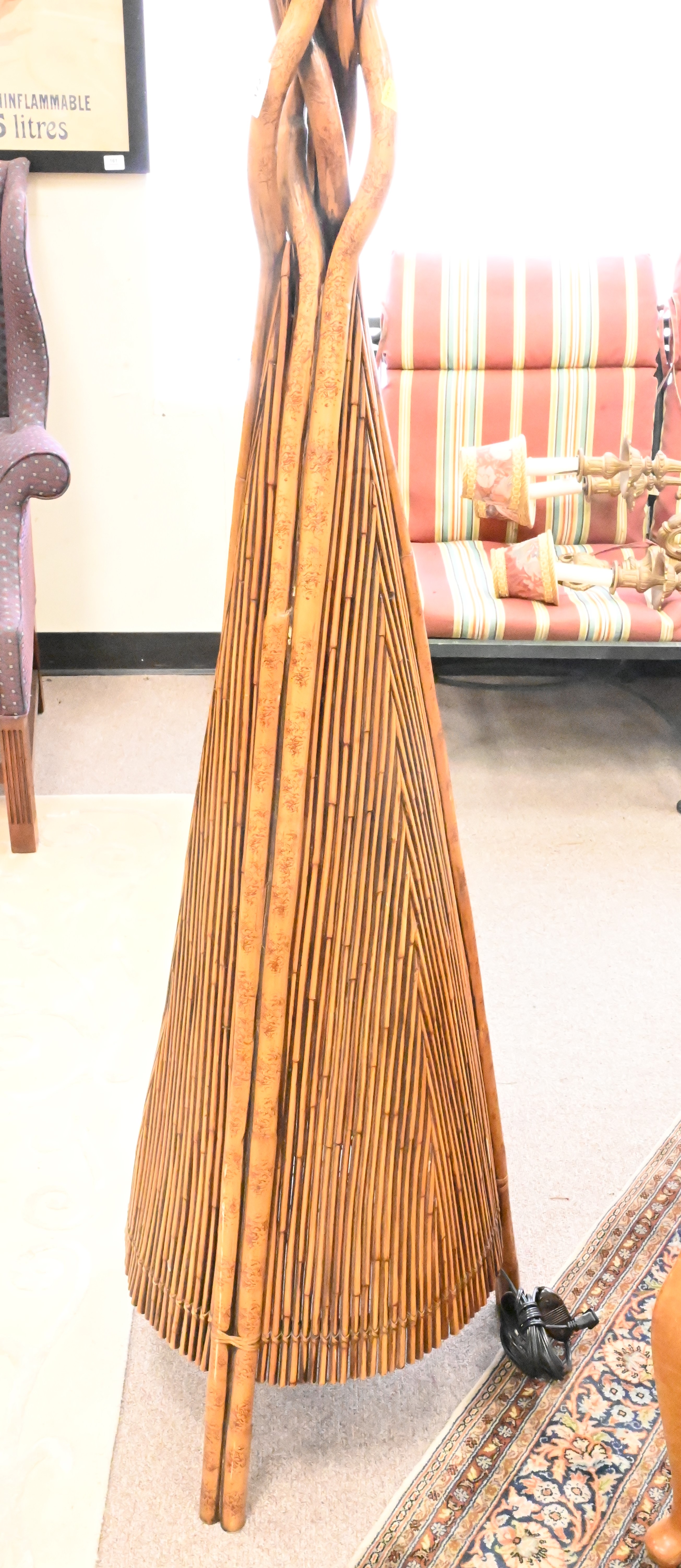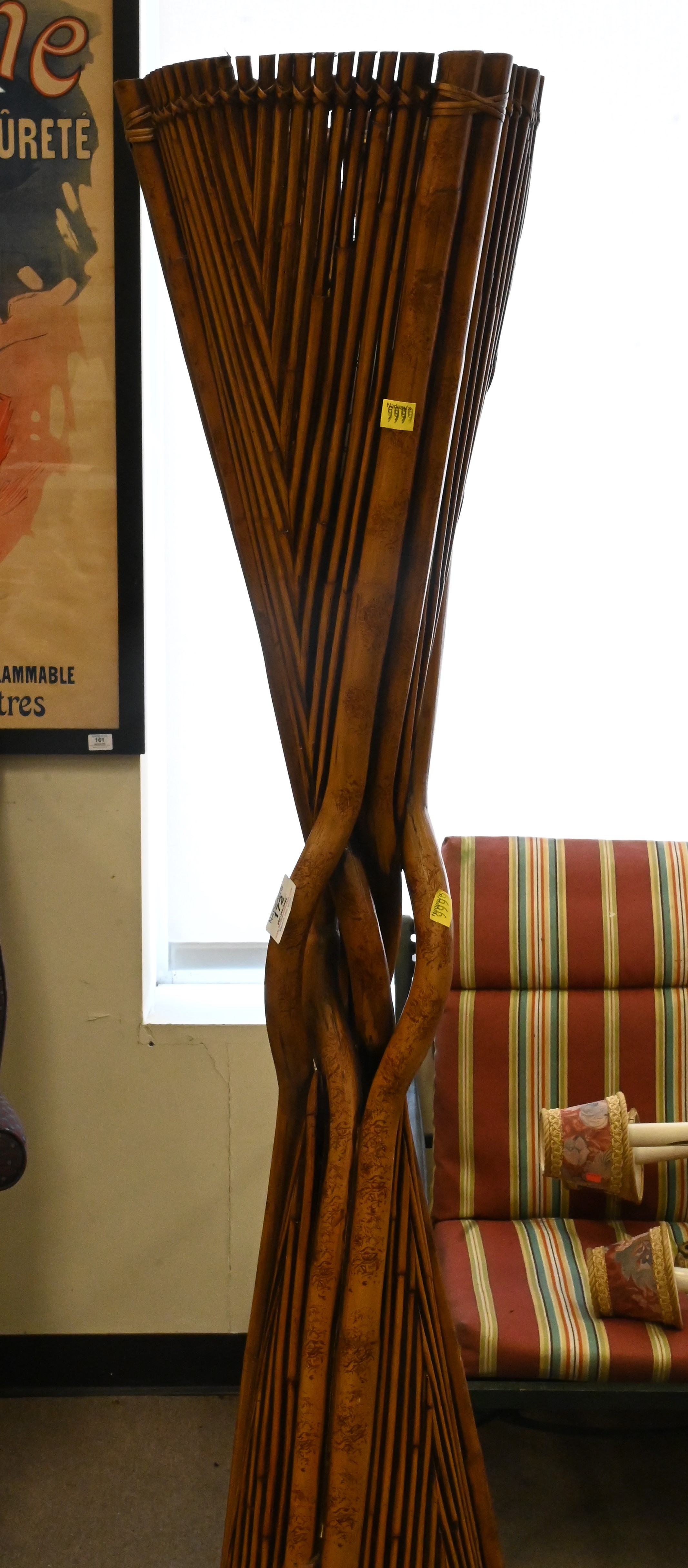 Faux Bamboo and Rattan Floor Lamp, having two bulbs, one serving as traditional lamp while one illuminates the base, height 72 inches.