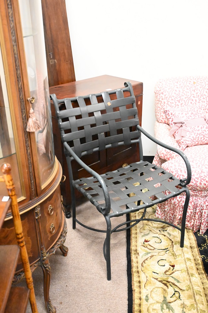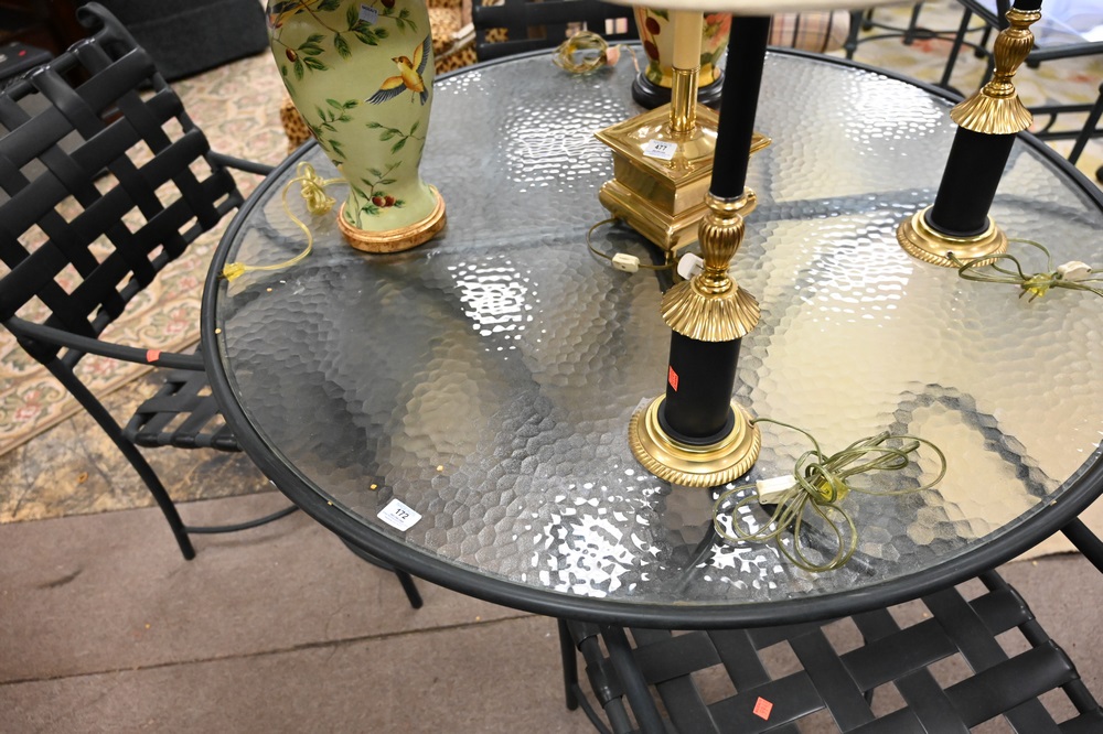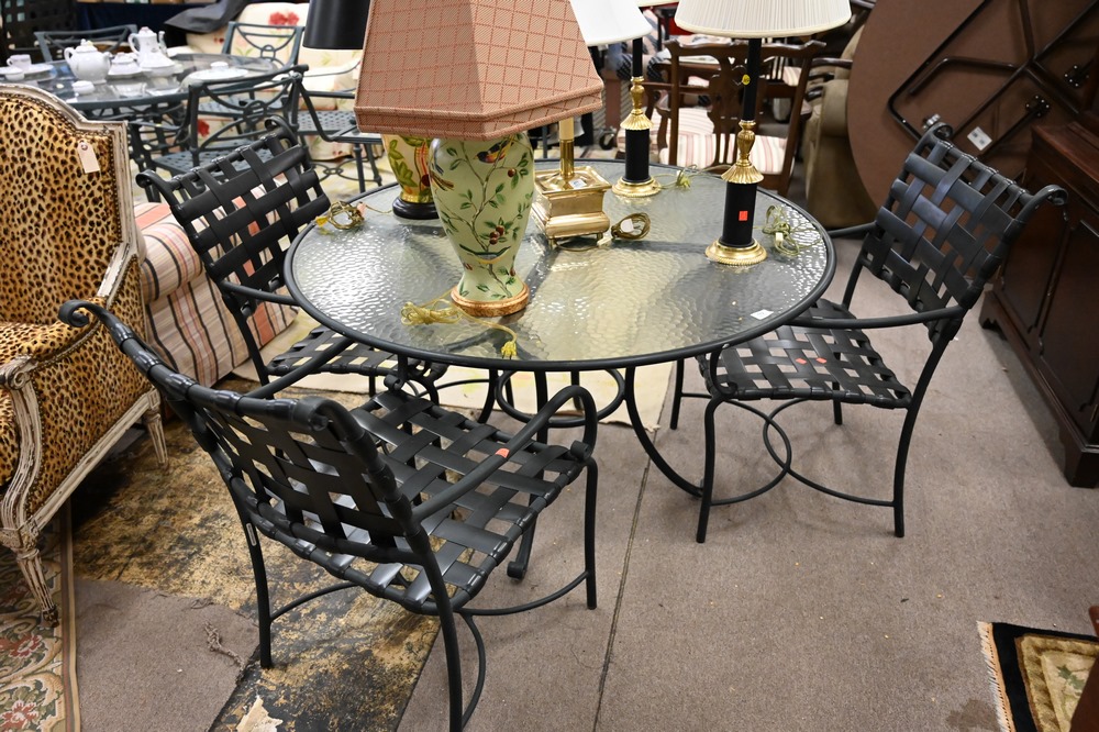 Lot 172: Five Piece Brown & Jordan Outdoor Patio Set, to include glass top table, four armchairs, height 28 inches, diameter 50 inches.